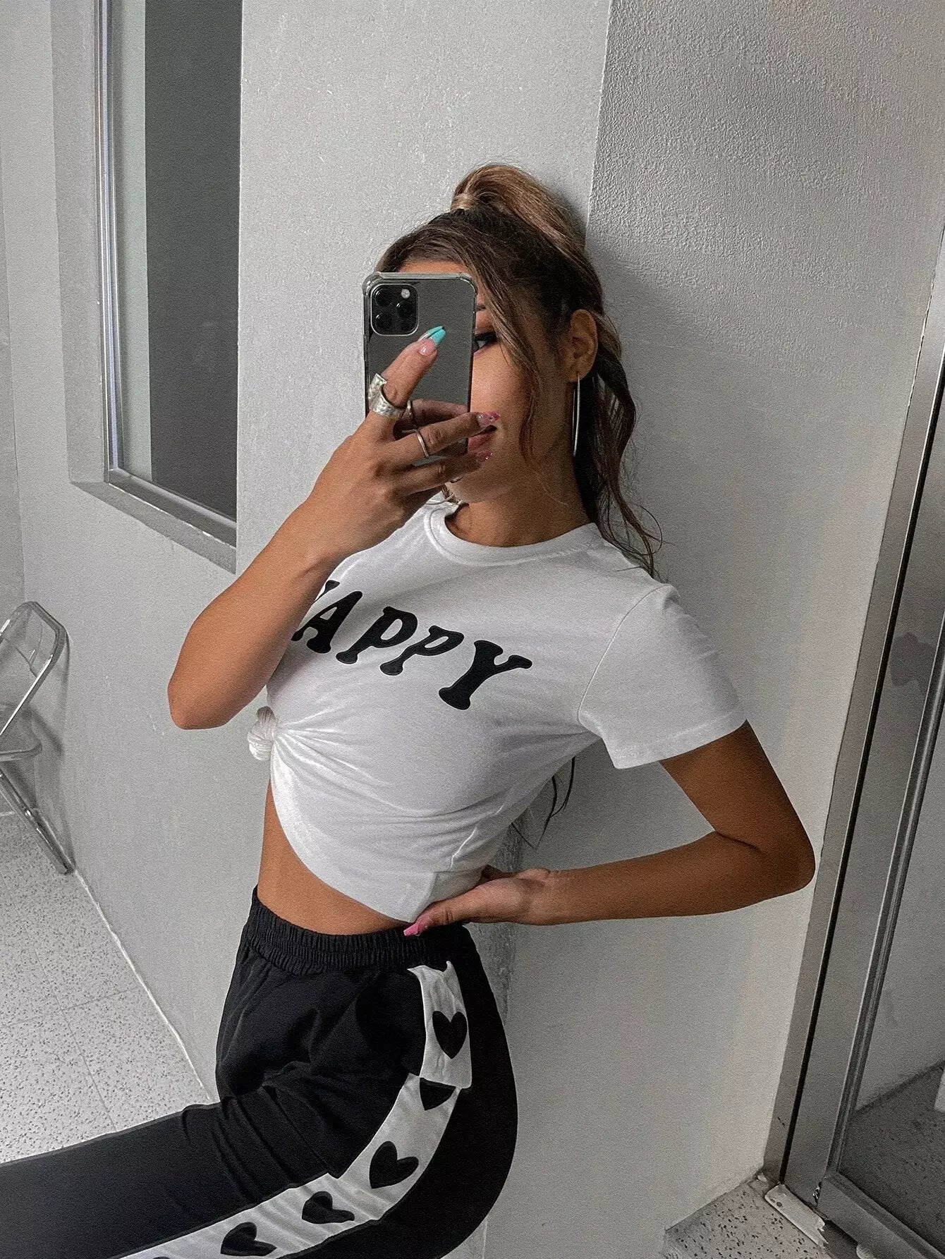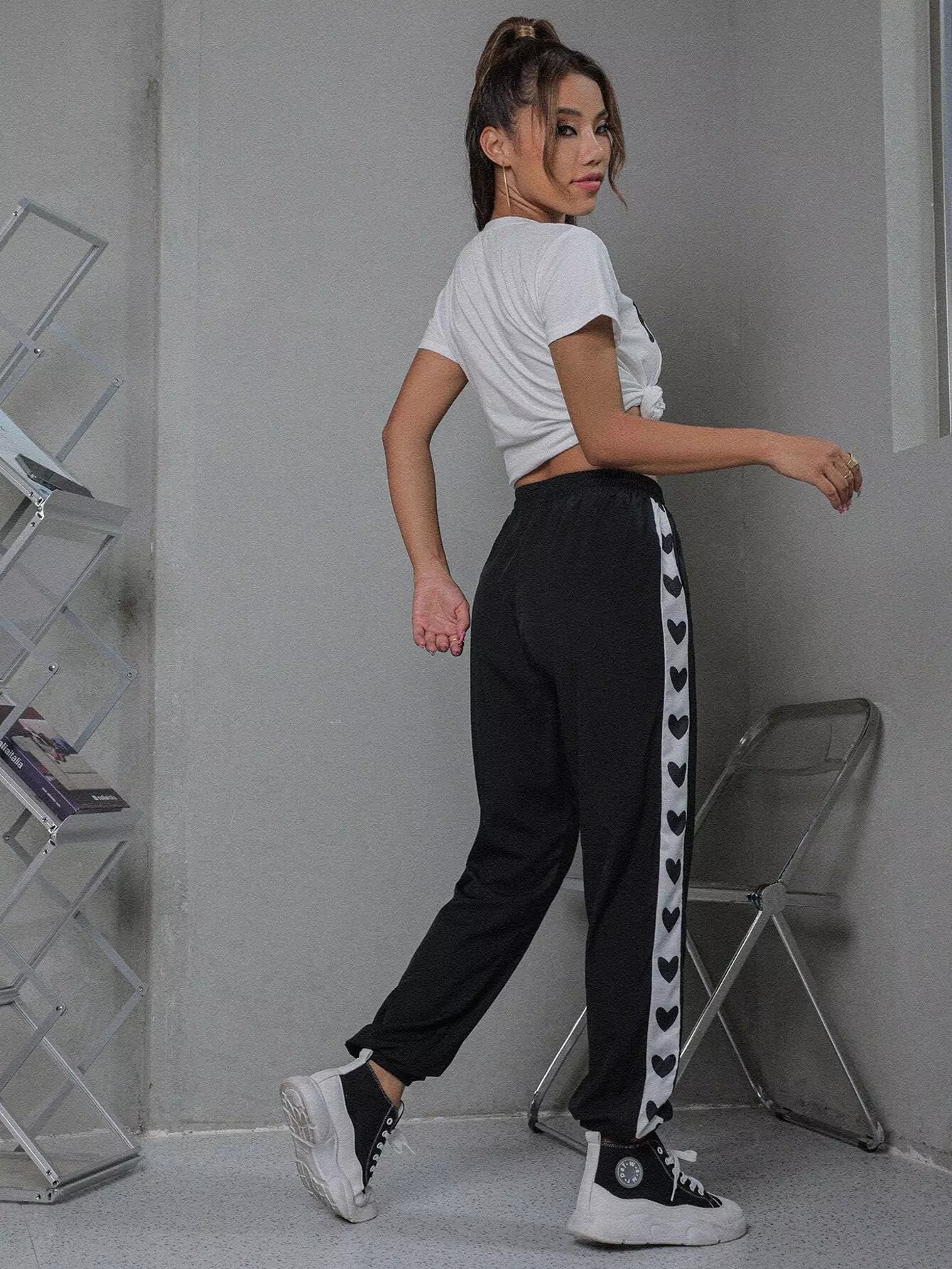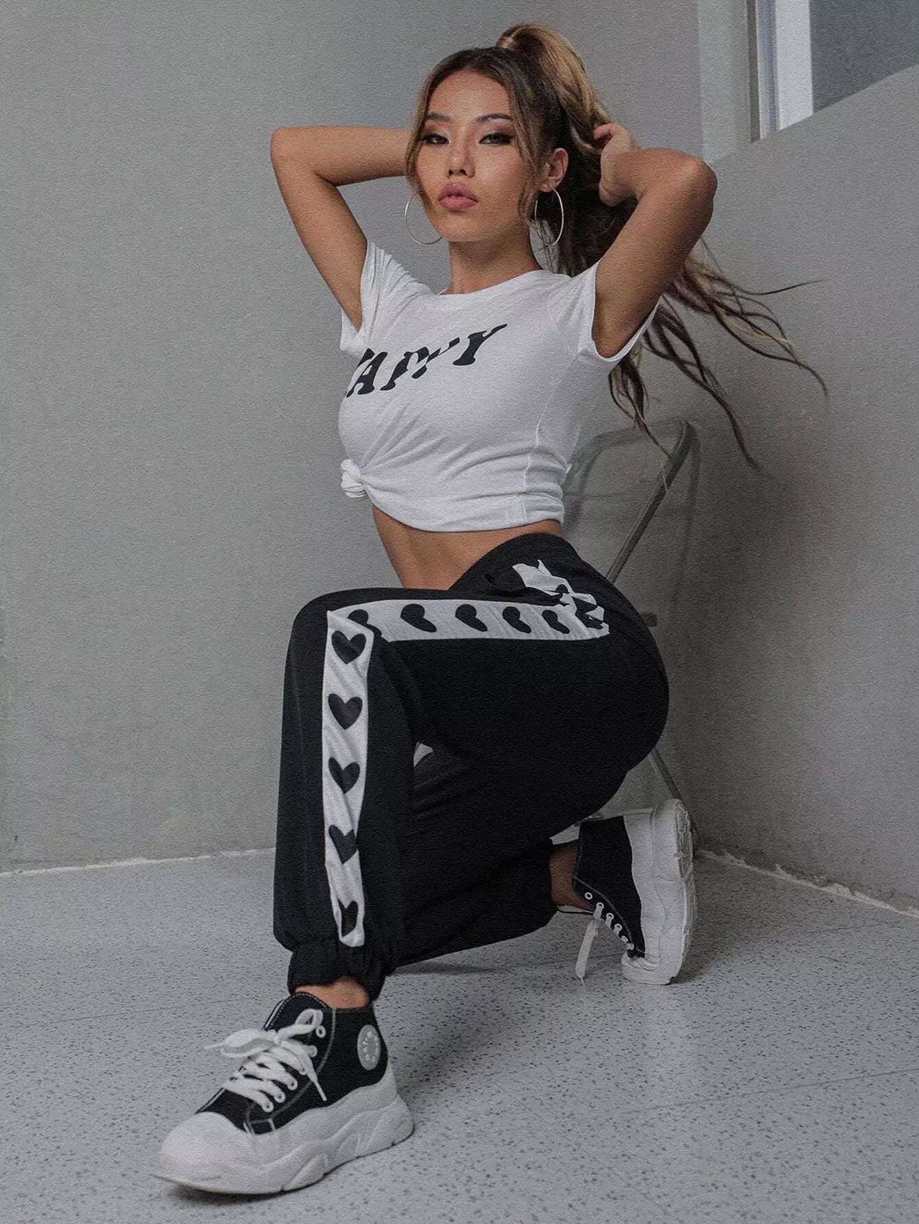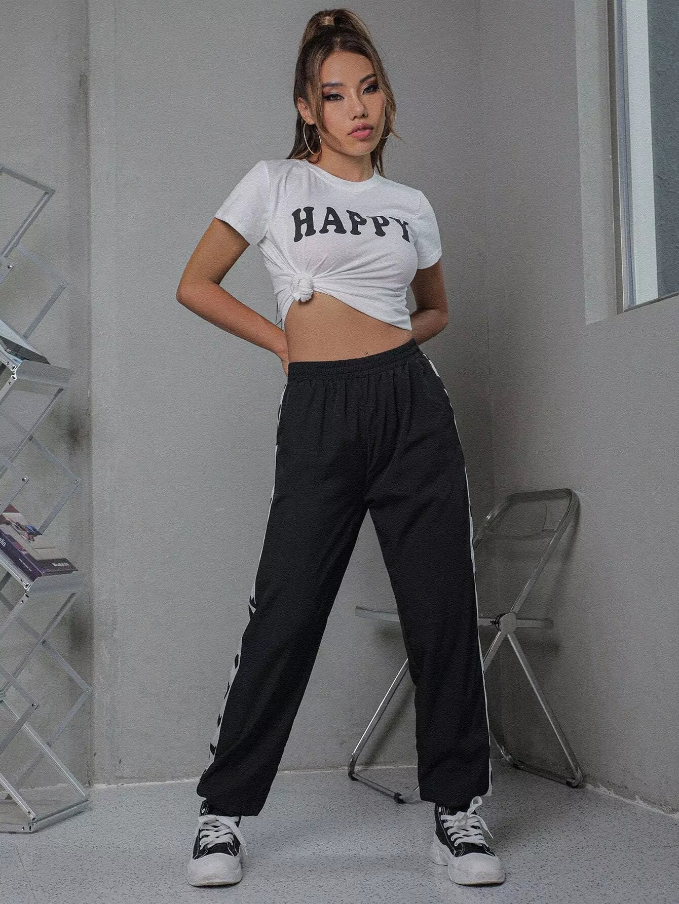 طقم بلوزة برسومات حروف وبنطلون بحياكة جانبية