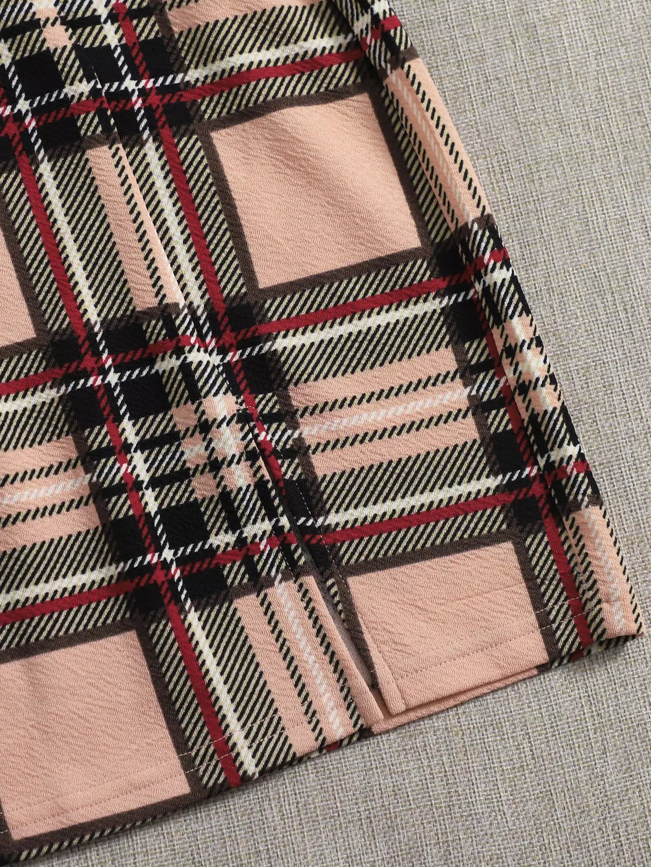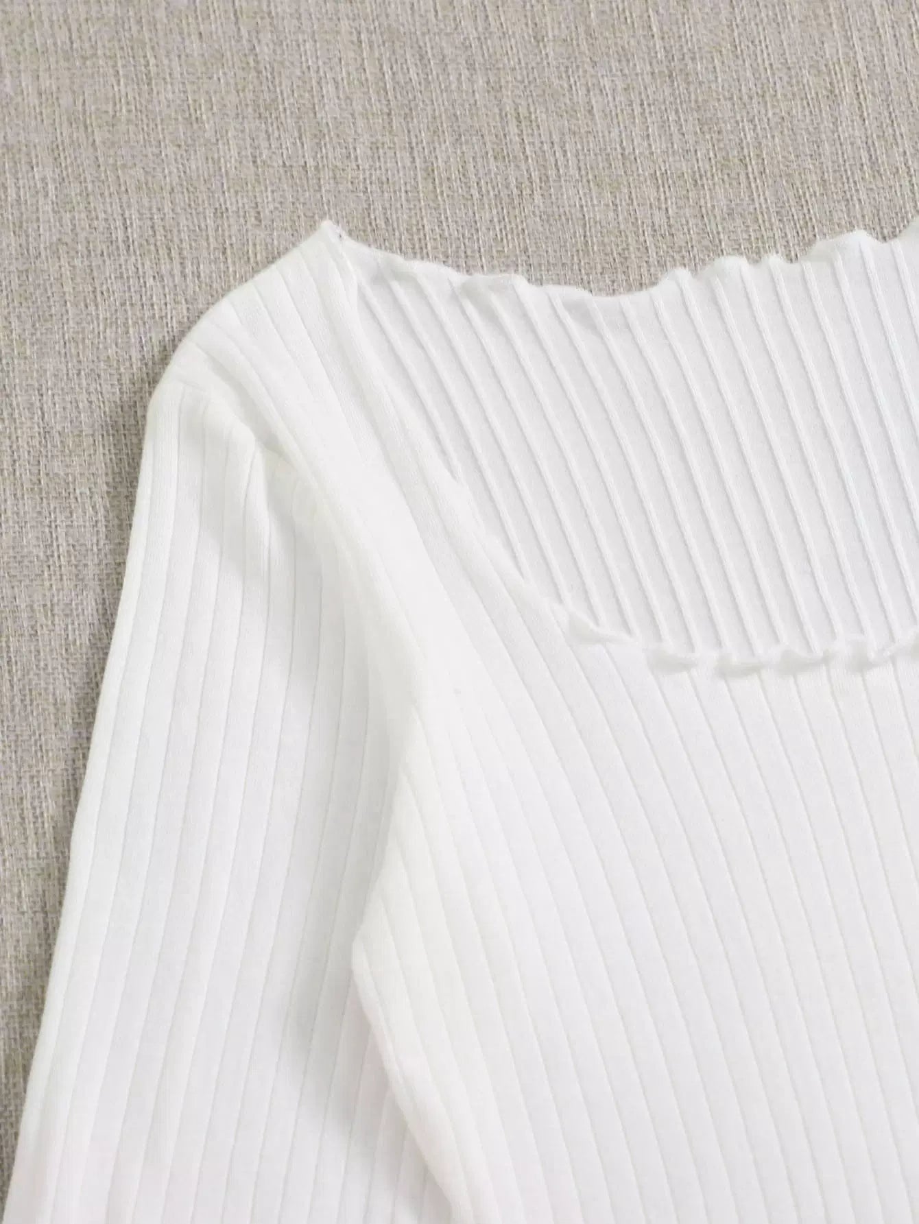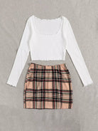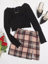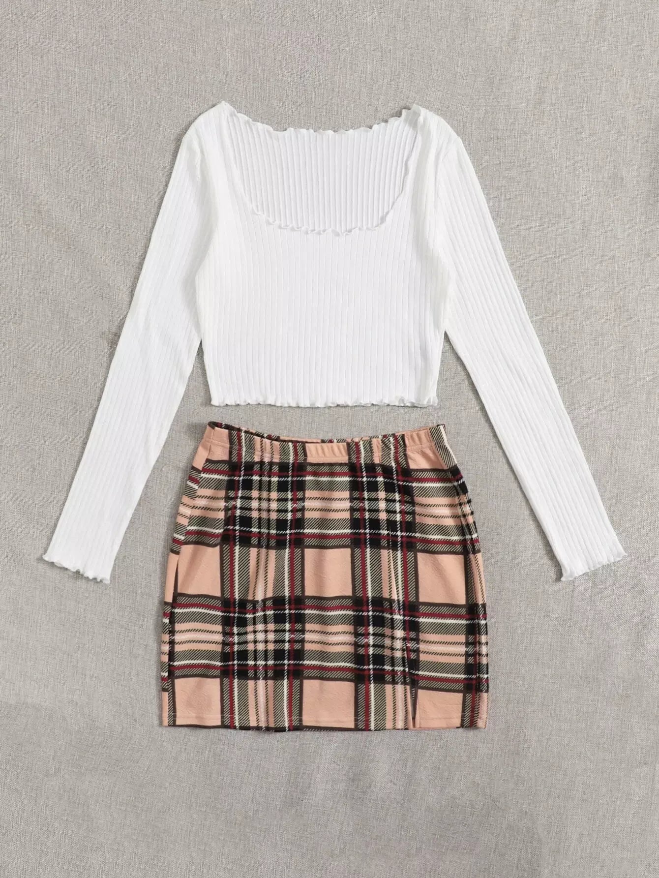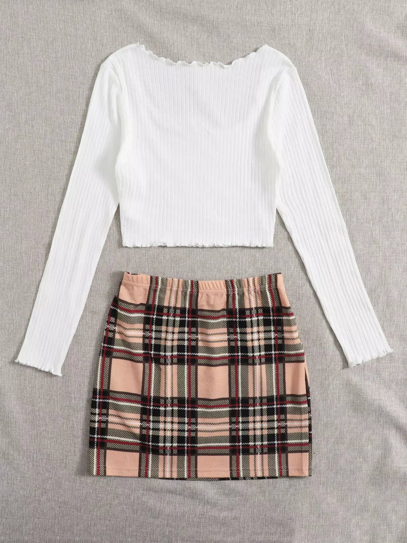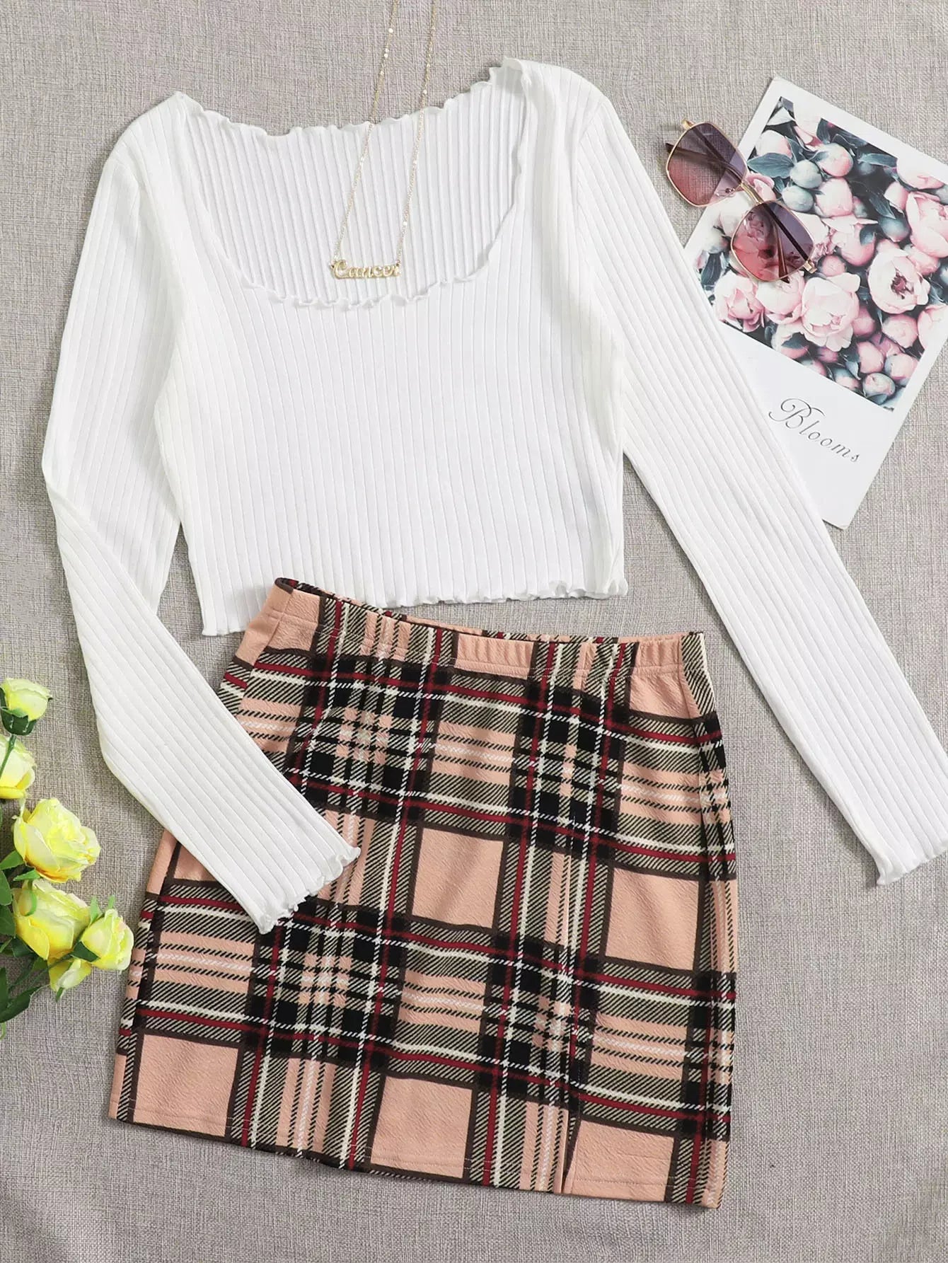 طقم تي شيرت مضلع بحواف من الخس وتنورة منقوشة بحاشية مقسمة
