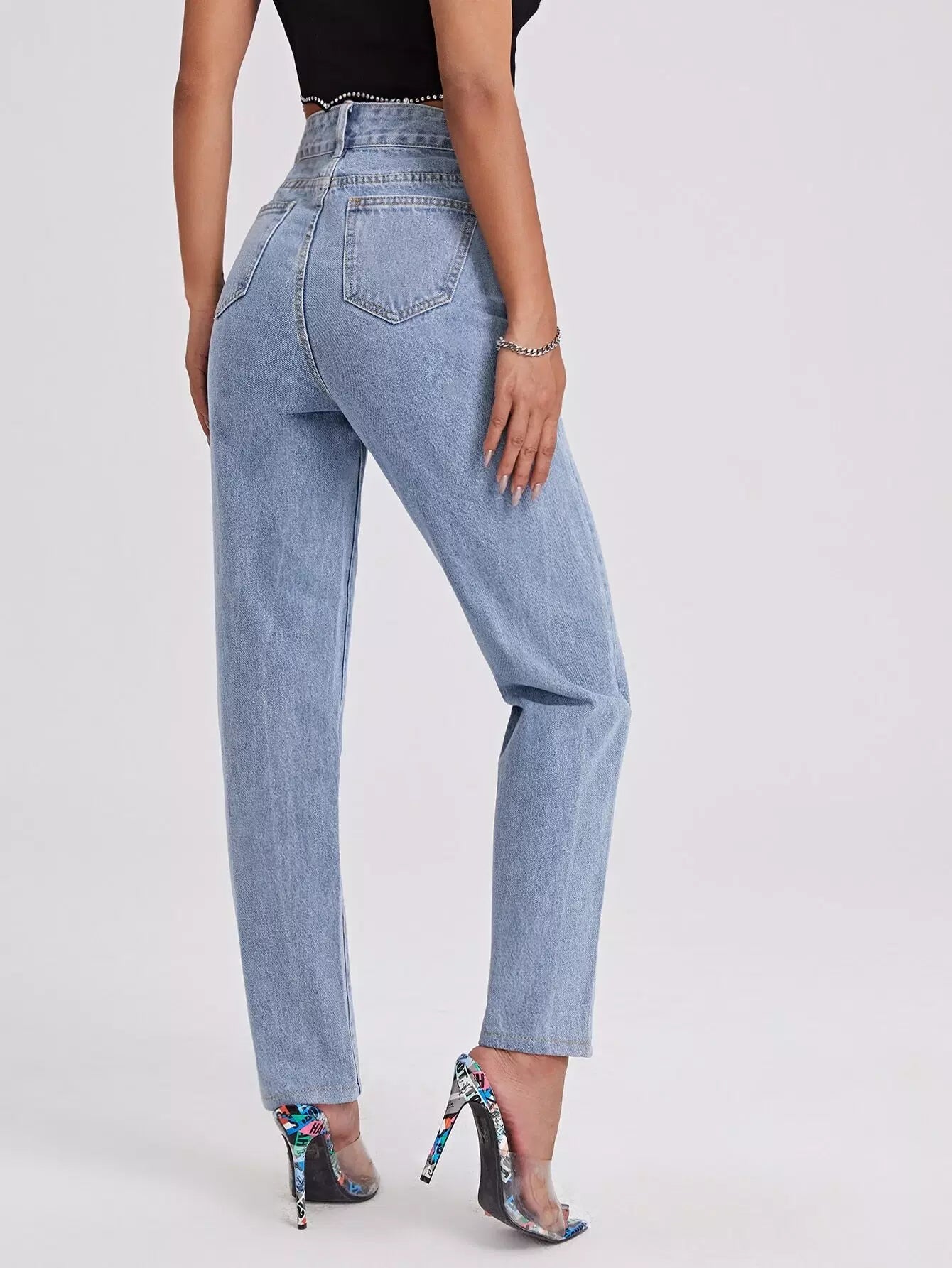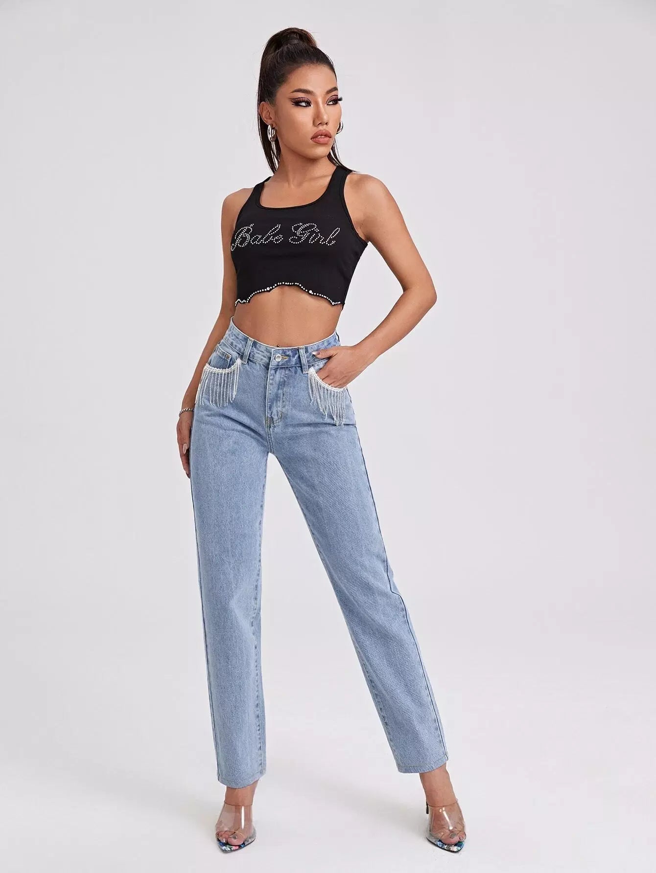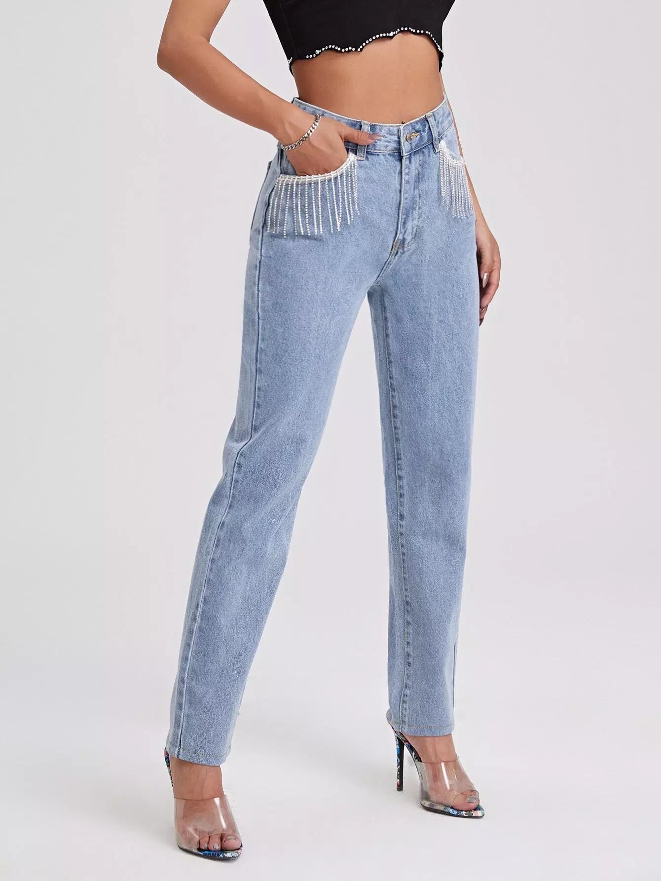 بنطلون جينز الأمهات المزين بأحجار الراين ذات التفصيلات الزخرفية الفاتحة