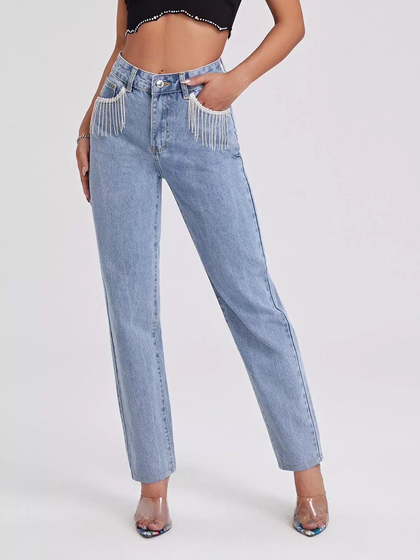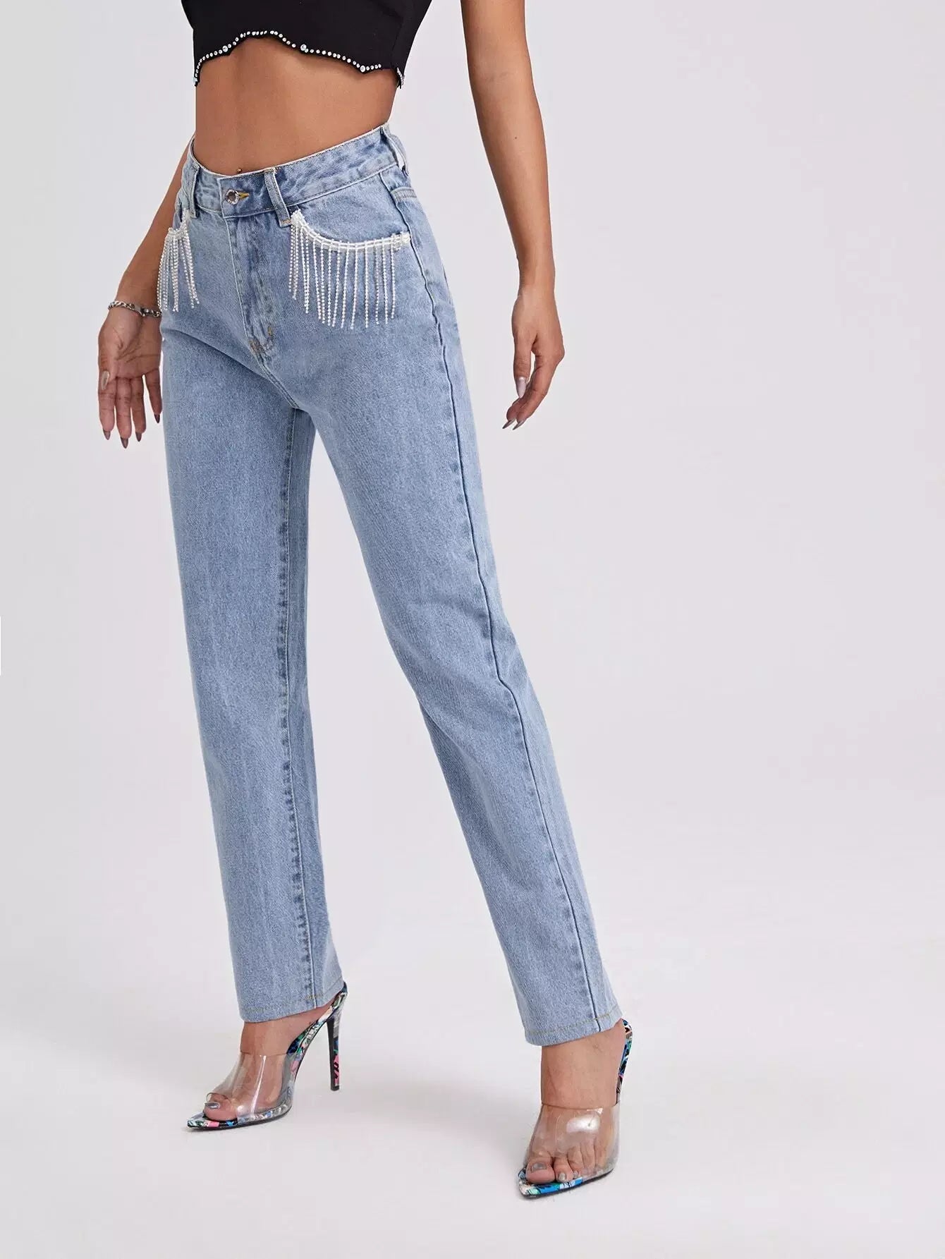 للنساء - جينز أمي مغسول فاتح مزين بشراشيب من حجر الراين