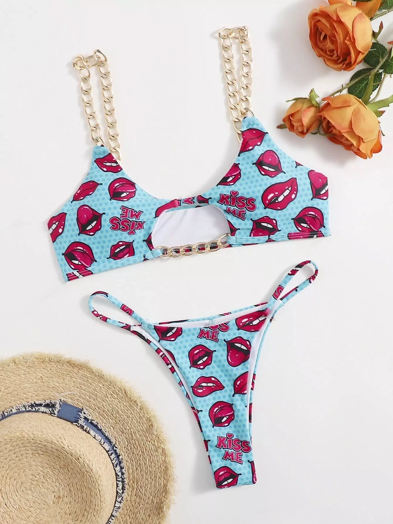 بيكيني سباحة بيكيني مربوط بسلسلة ذات رسومات شفاه وحروف