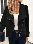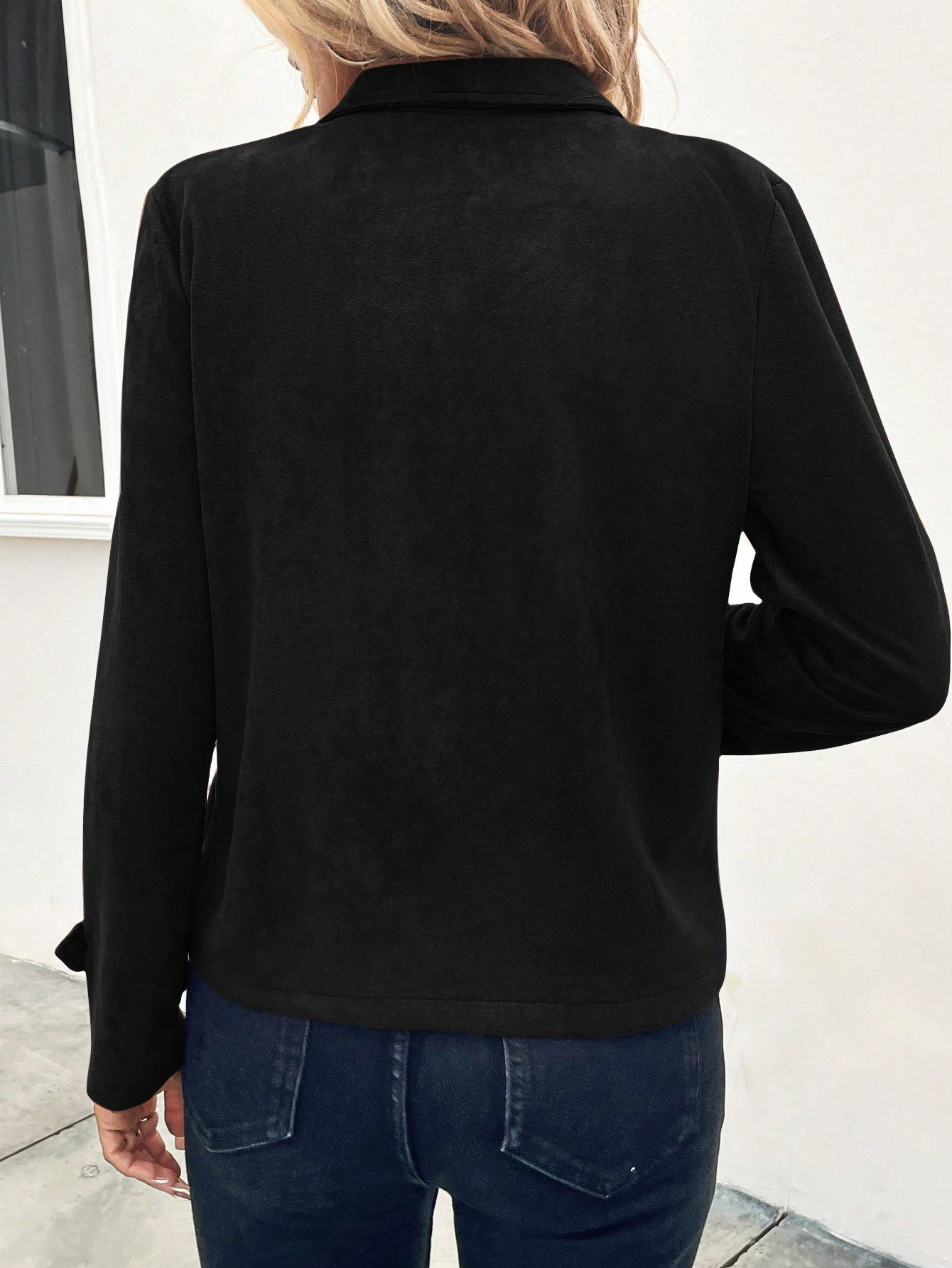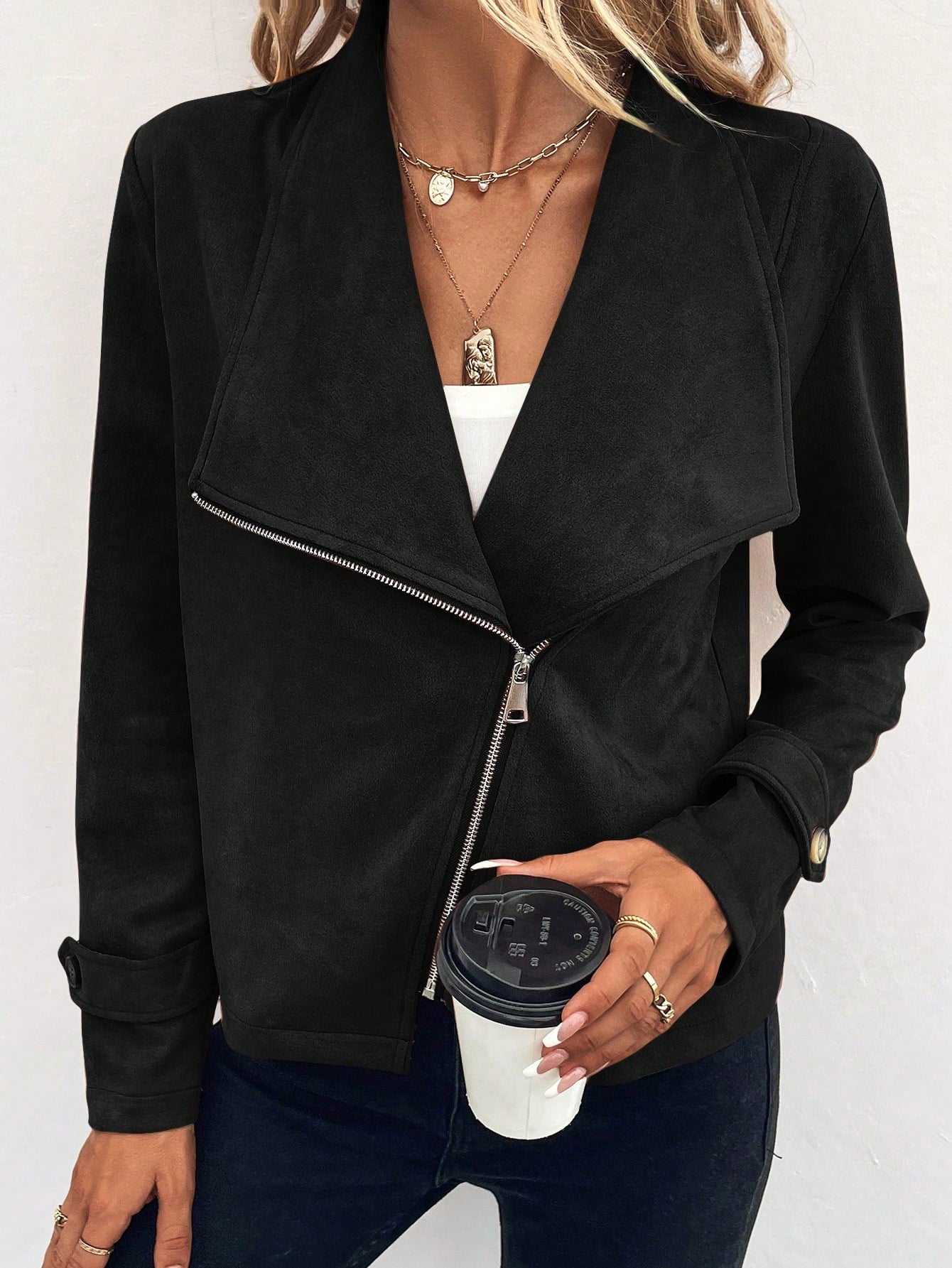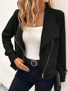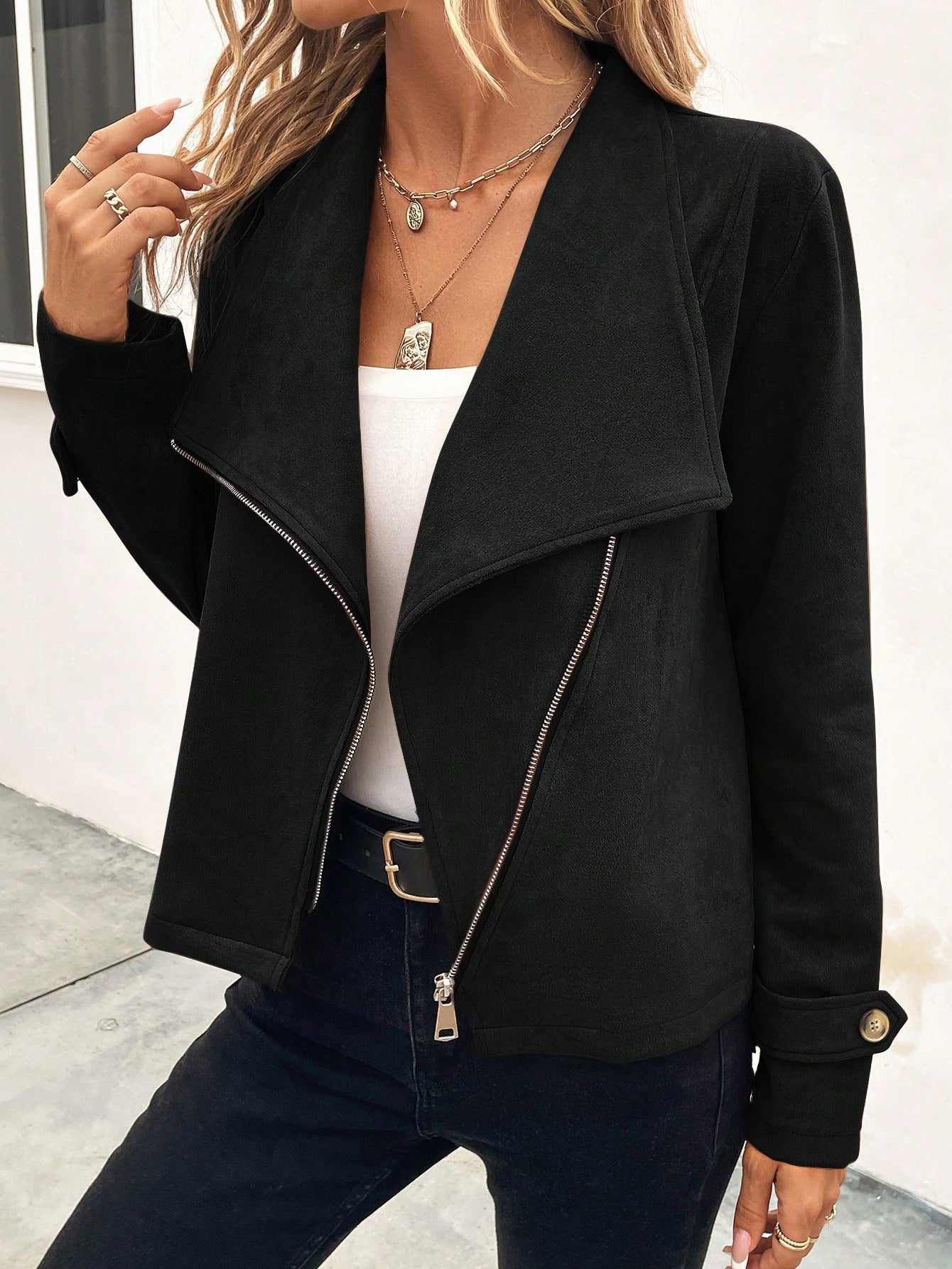 جاكيت من جلد الغزال بسحاب وياقة شلالية من لون