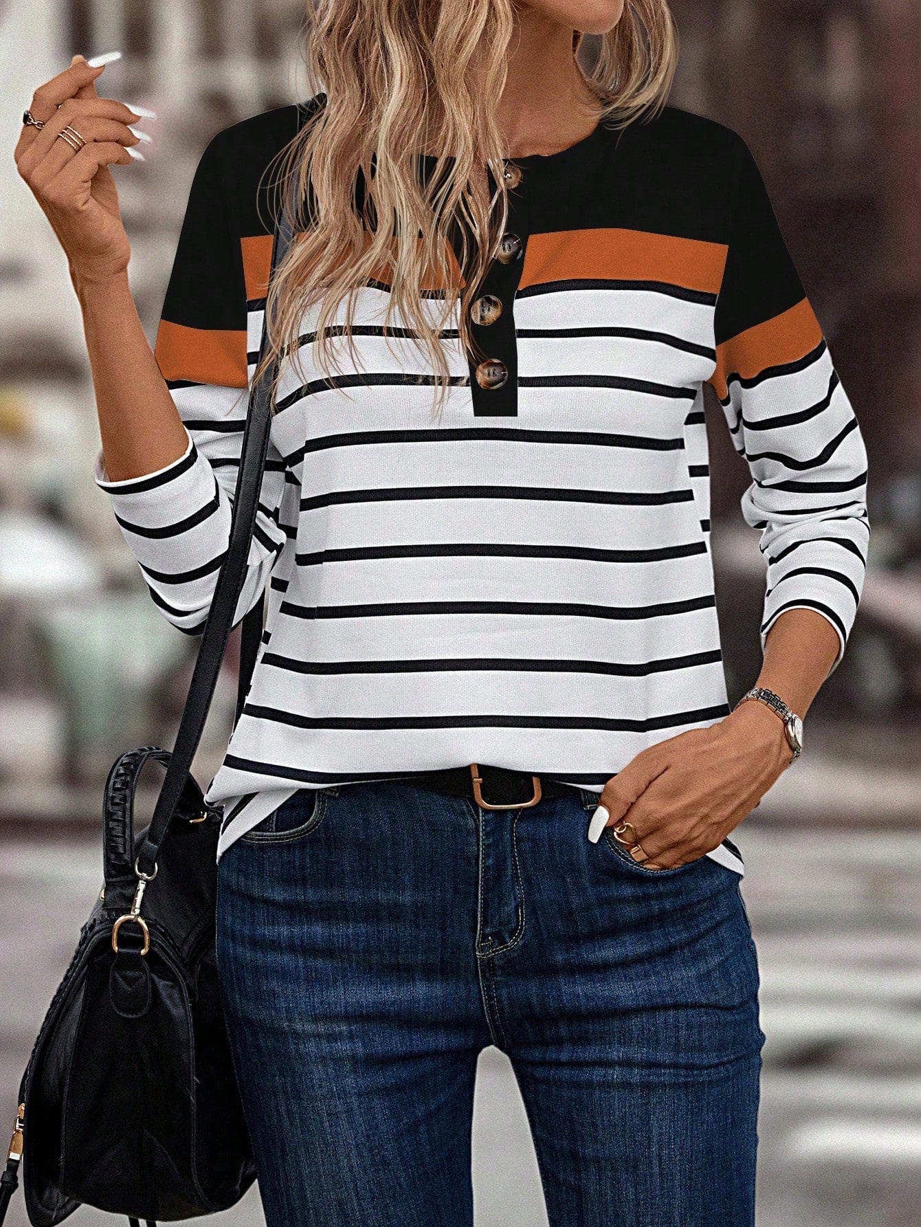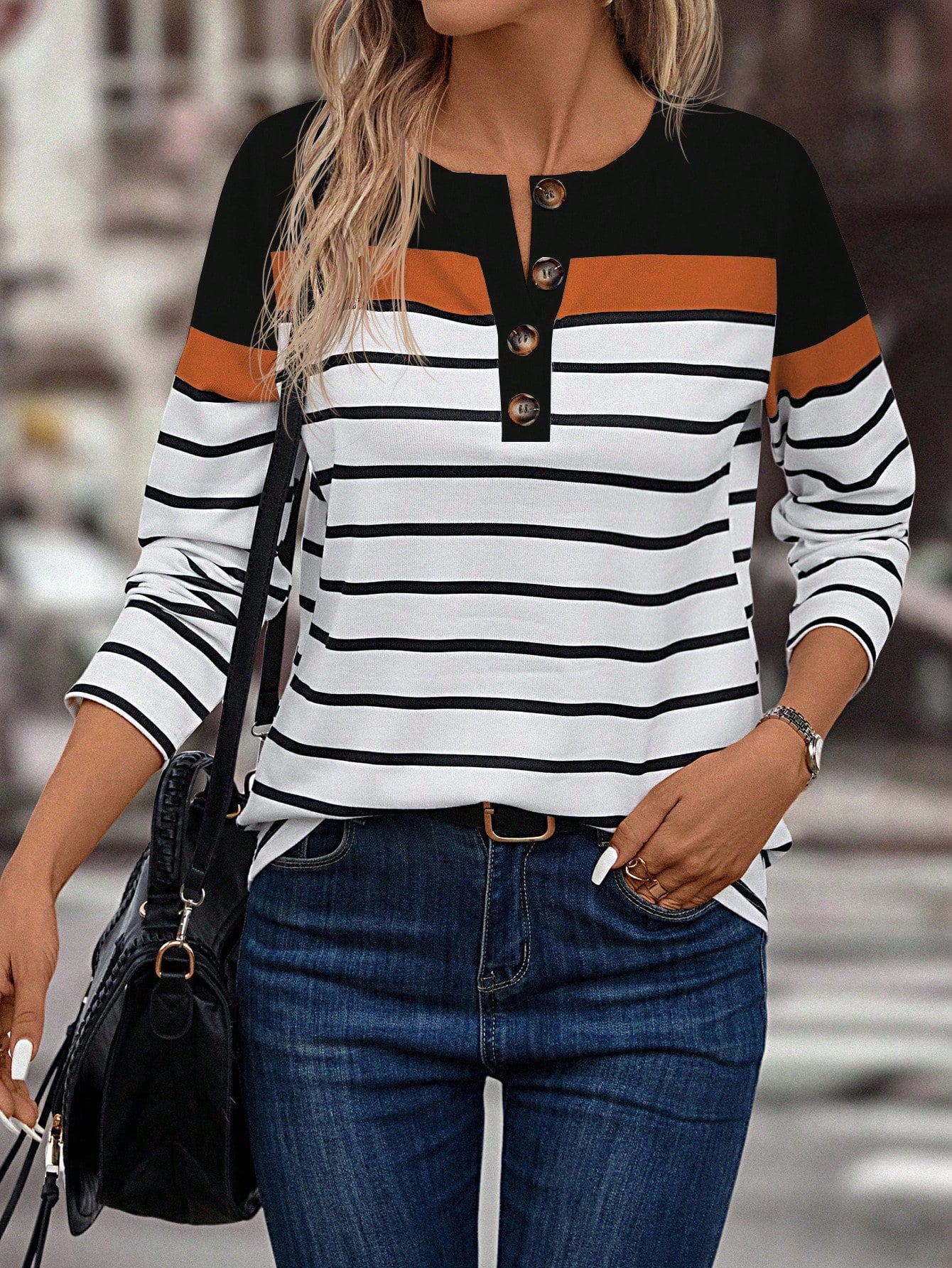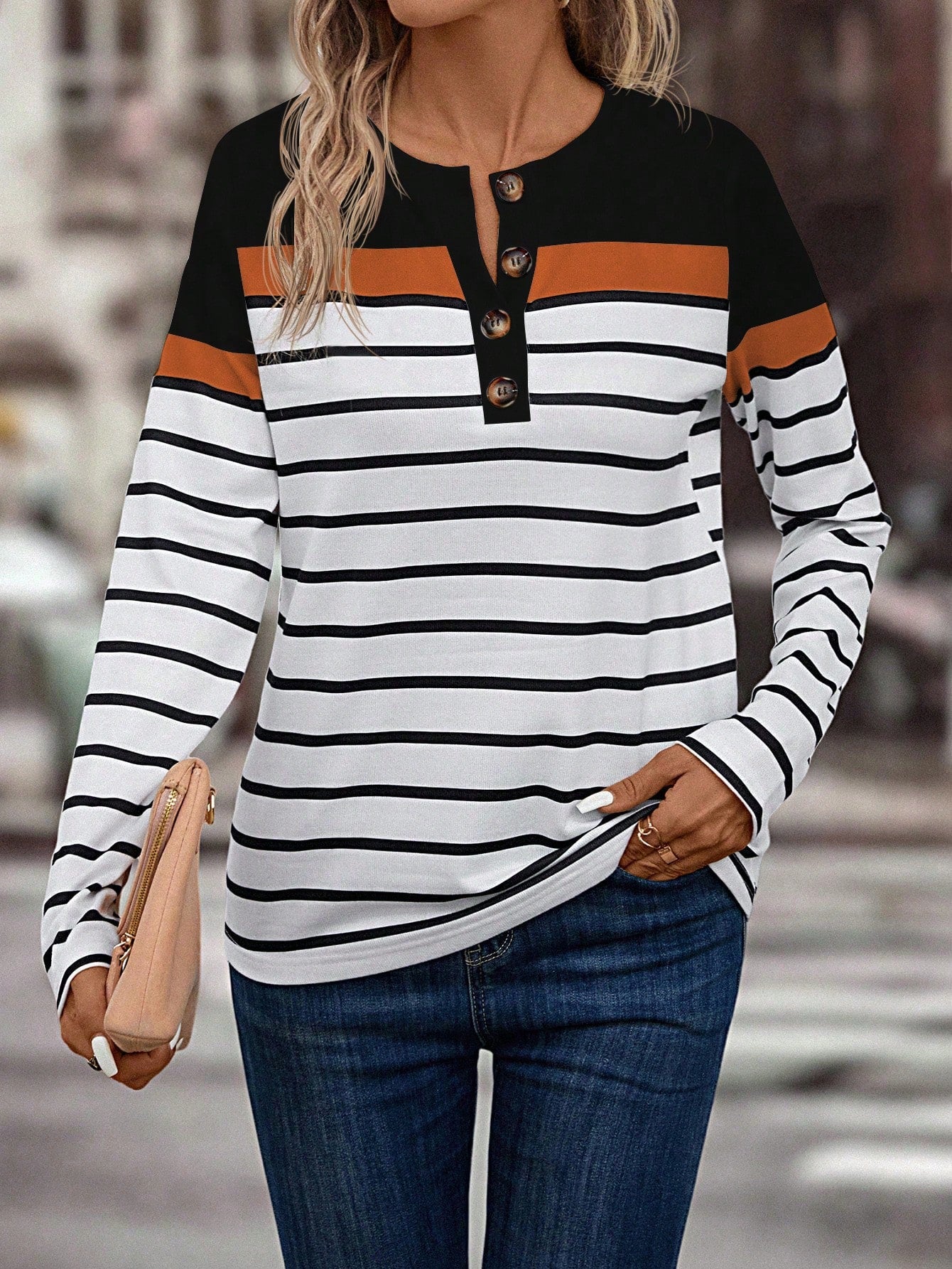 تيشيرت نسائي من لون، كاجوال، مخطط، بلون متباين، بنصف زر وأكمام طويلة