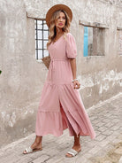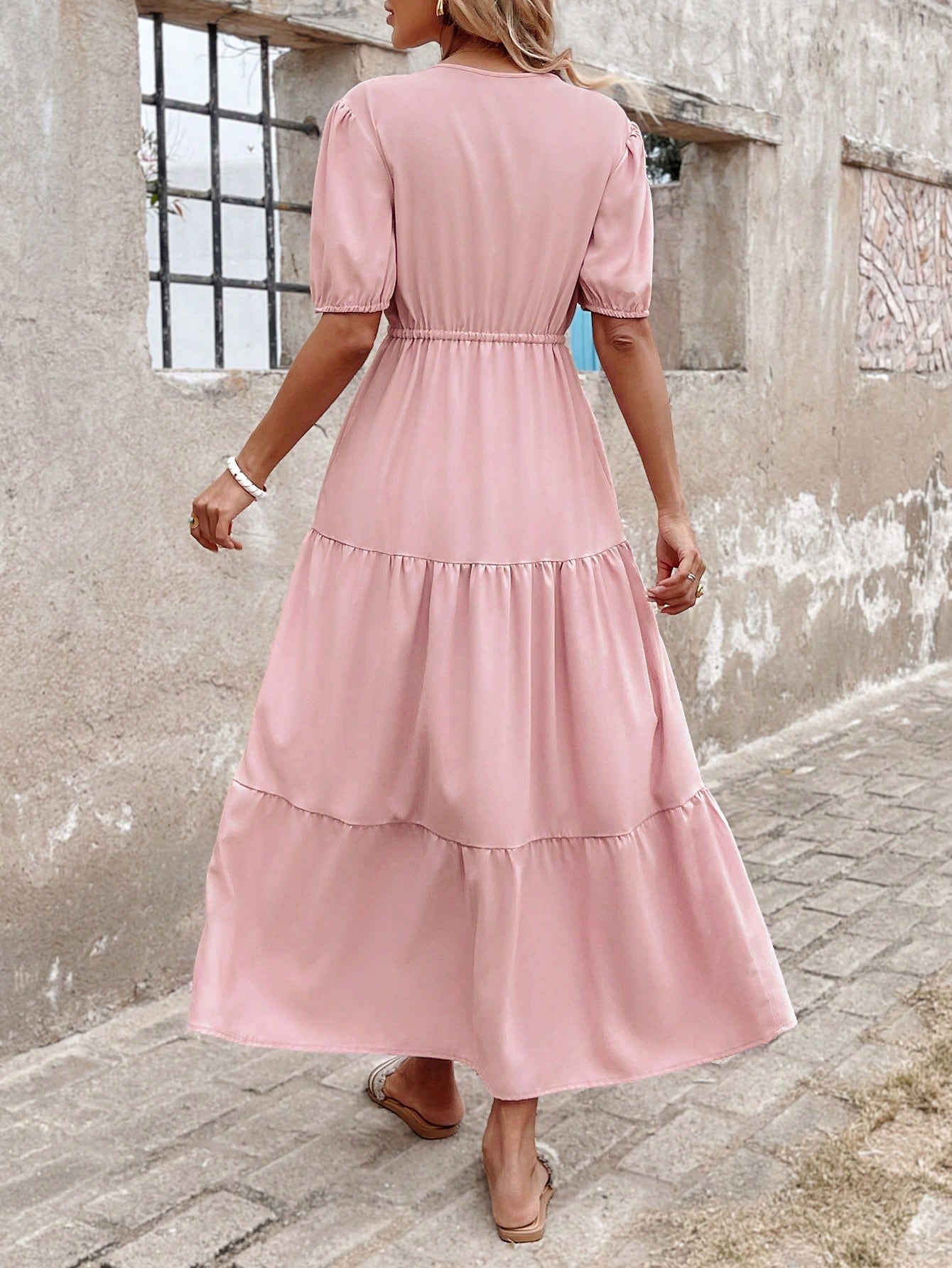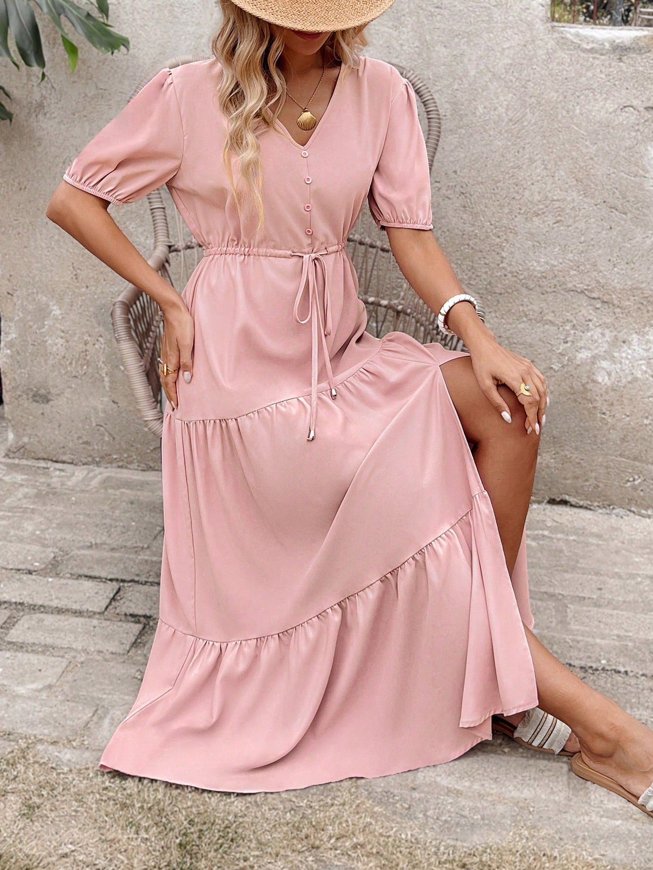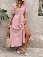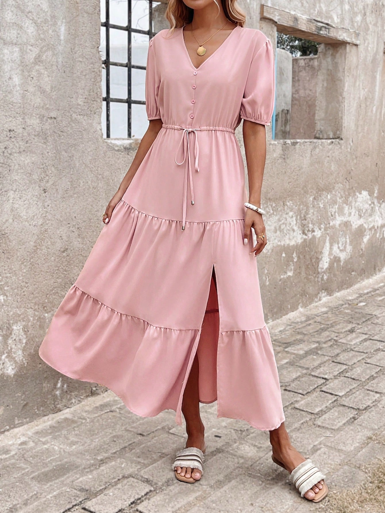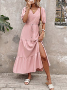 فستان نسائي كاجوال بلون موحد من لون، بياقة على شكل حرف V، مزين بكشكشة ورباط، مع فتحة جانبية