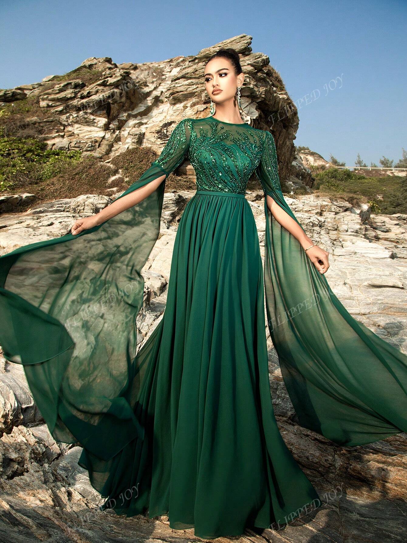 فستان سهرة فاخر طويل للغاية بأكمام شفافة مكشوفة الظهر ومطرز بالخرز، فستان سهرة أنيق لحفلات التخرج.