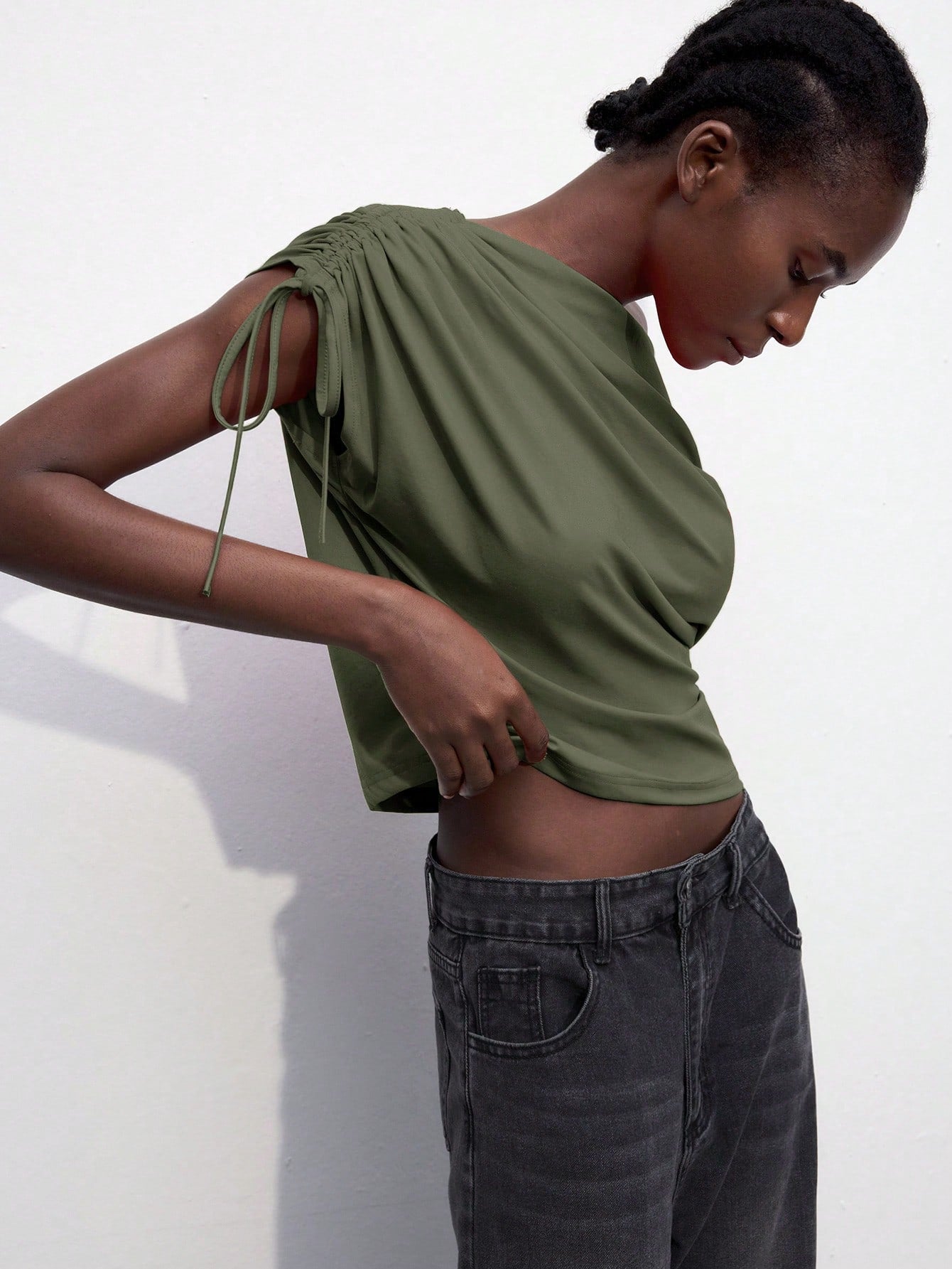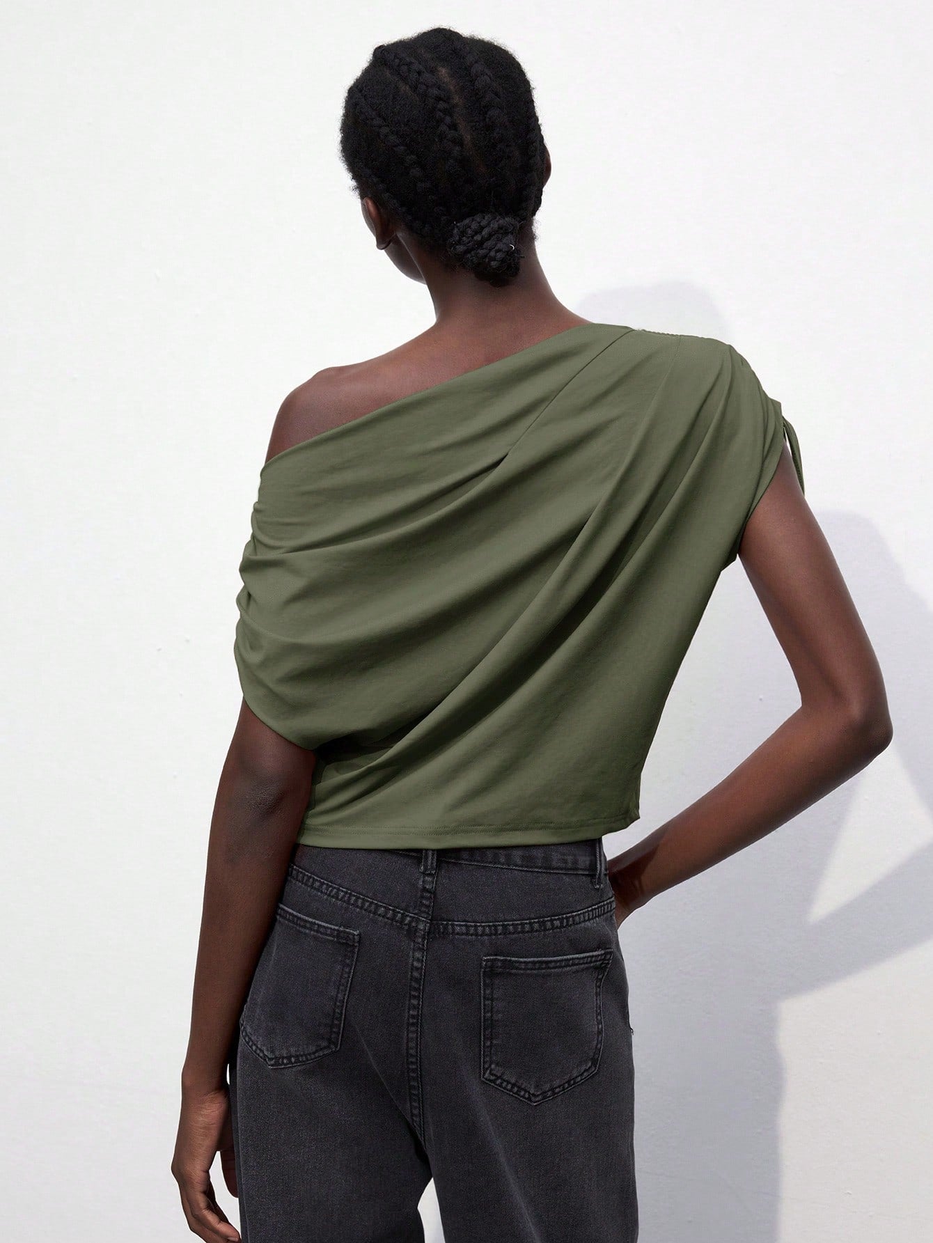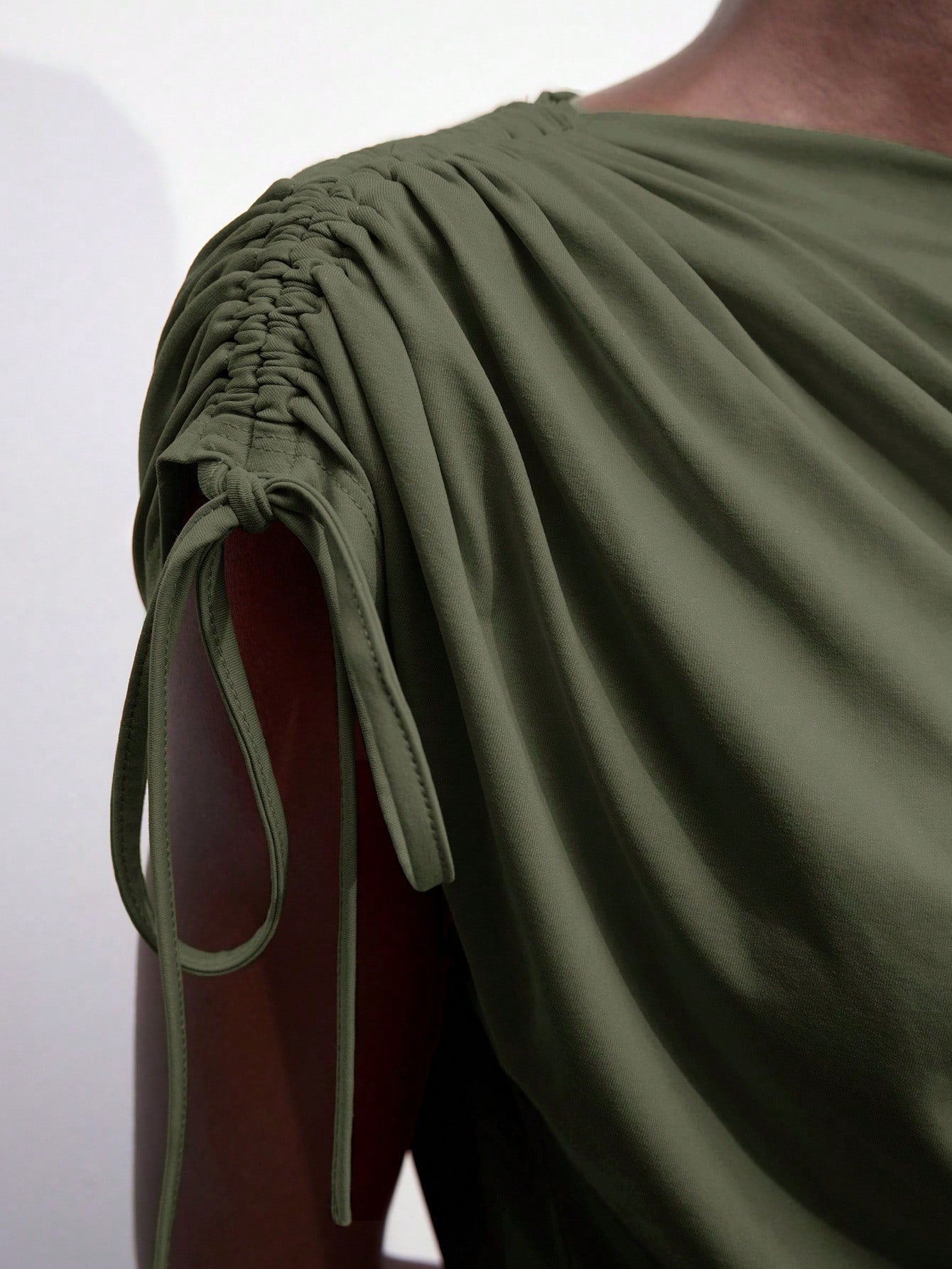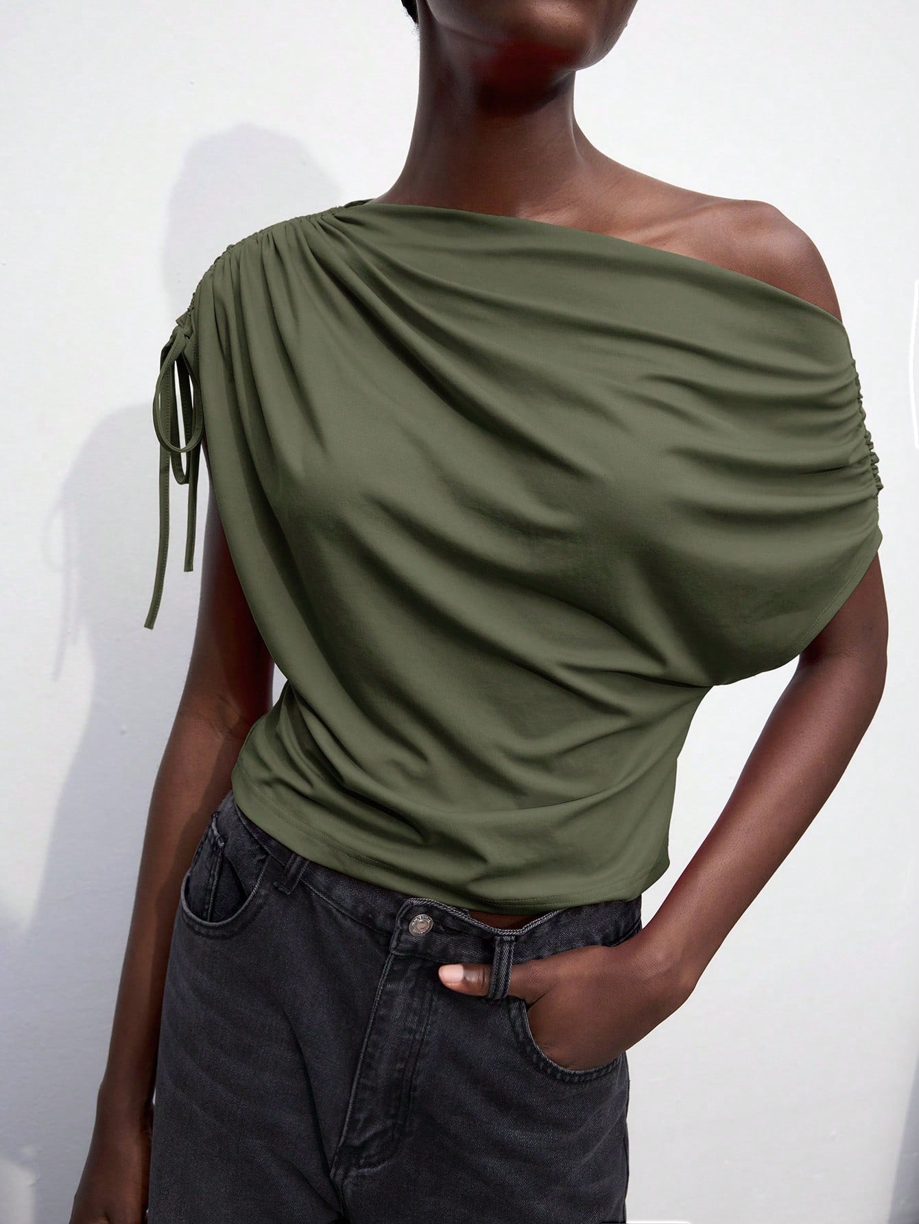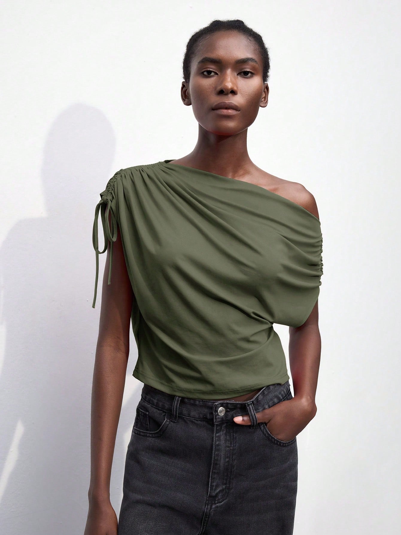 بلوزة مايا النسائية غير المتماثلة بأكمام واحدة ورباط مع طيات، مناسبة للارتداء اليومي والعملي، باللون الرمادي والأخضر