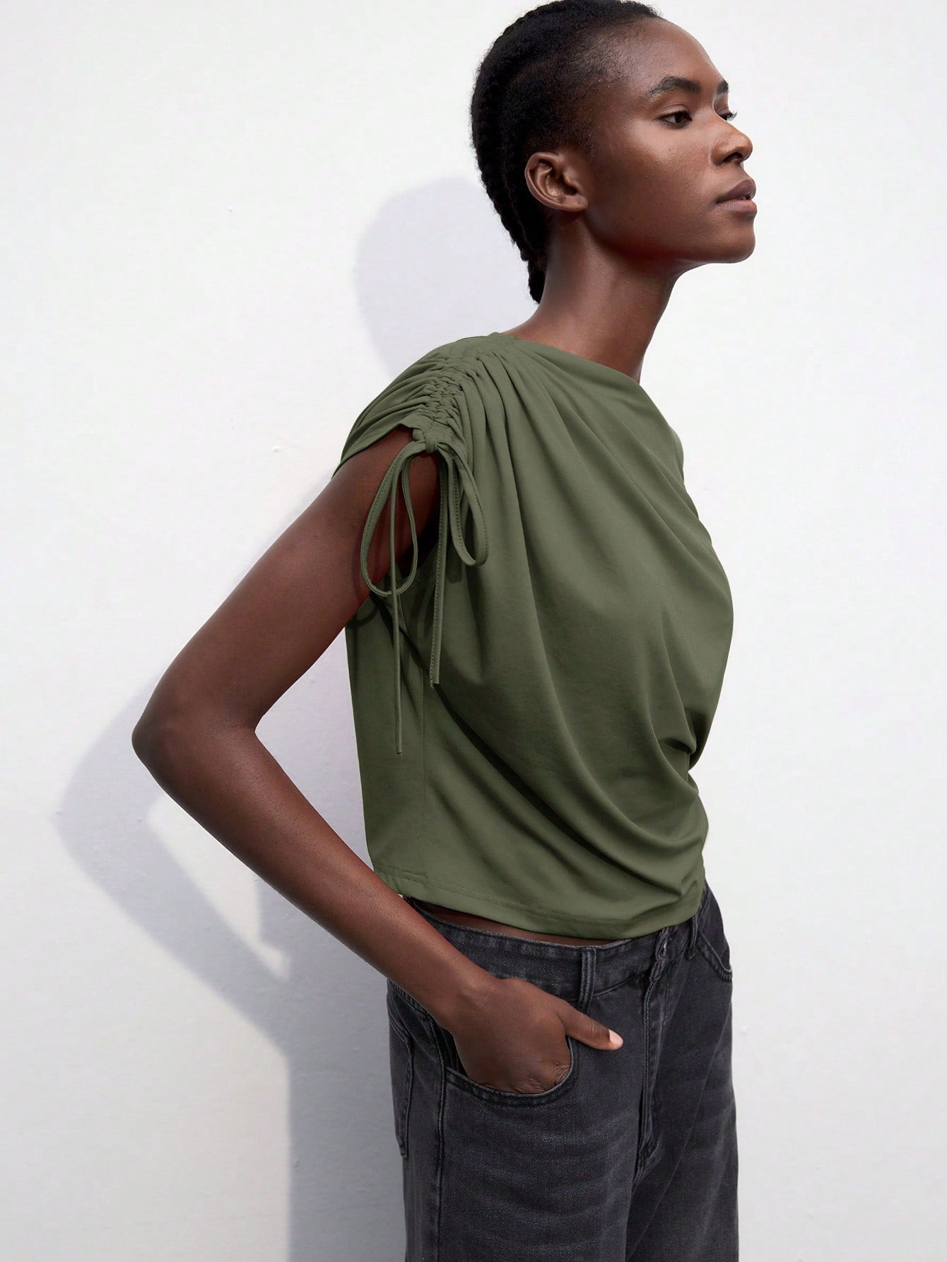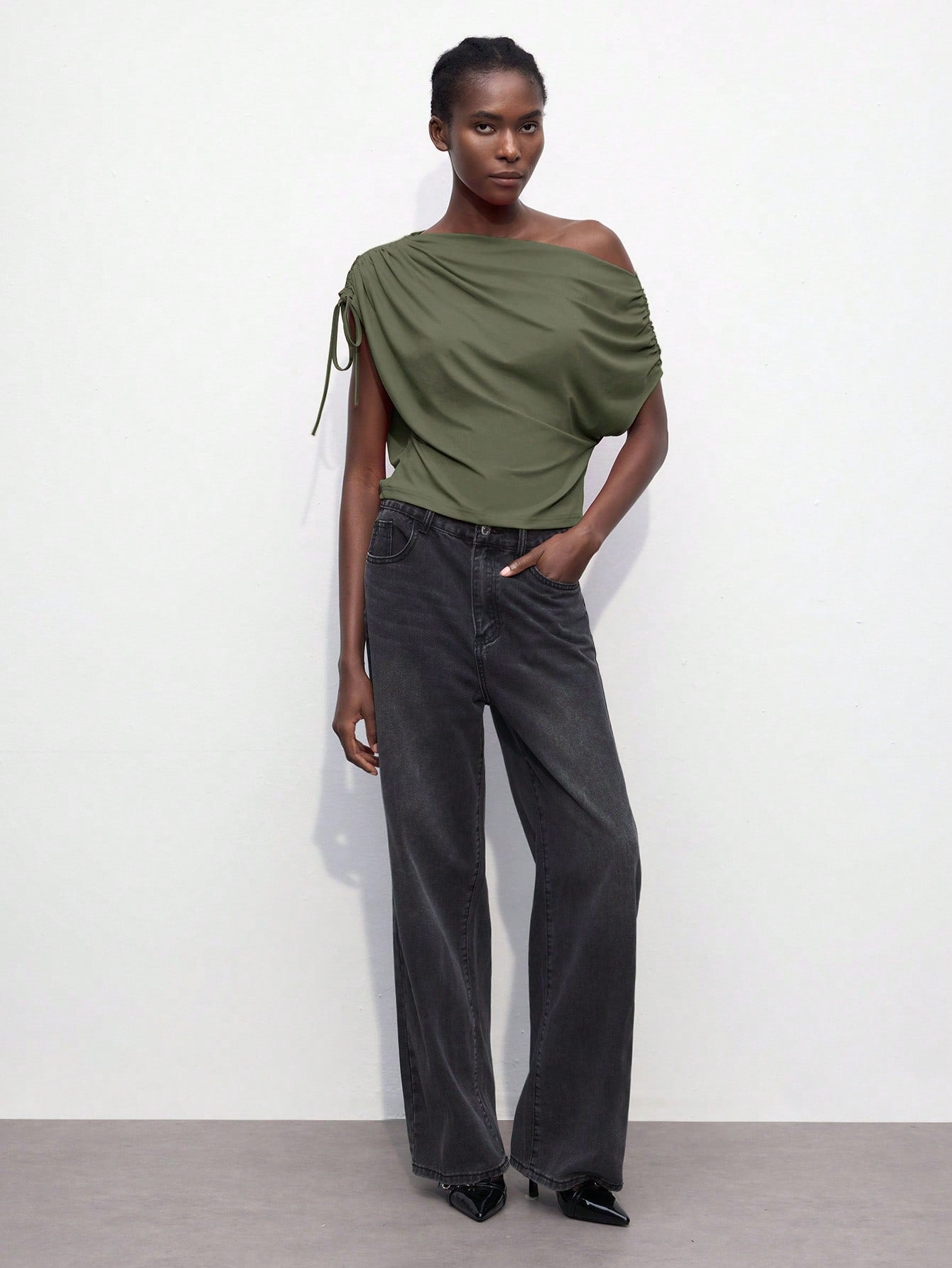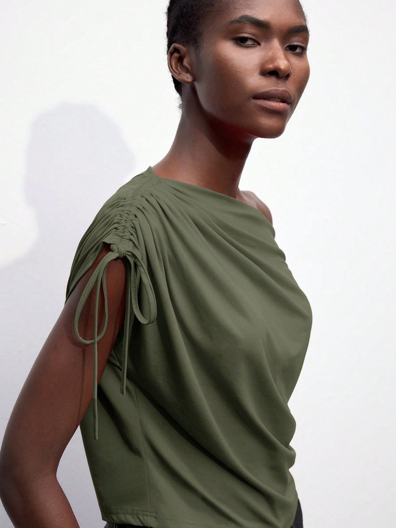 Maija Women's Asymmetric Single-Sleeve Drawstring Blouse With Pleats, Casual & Business Wear, Grey Green,