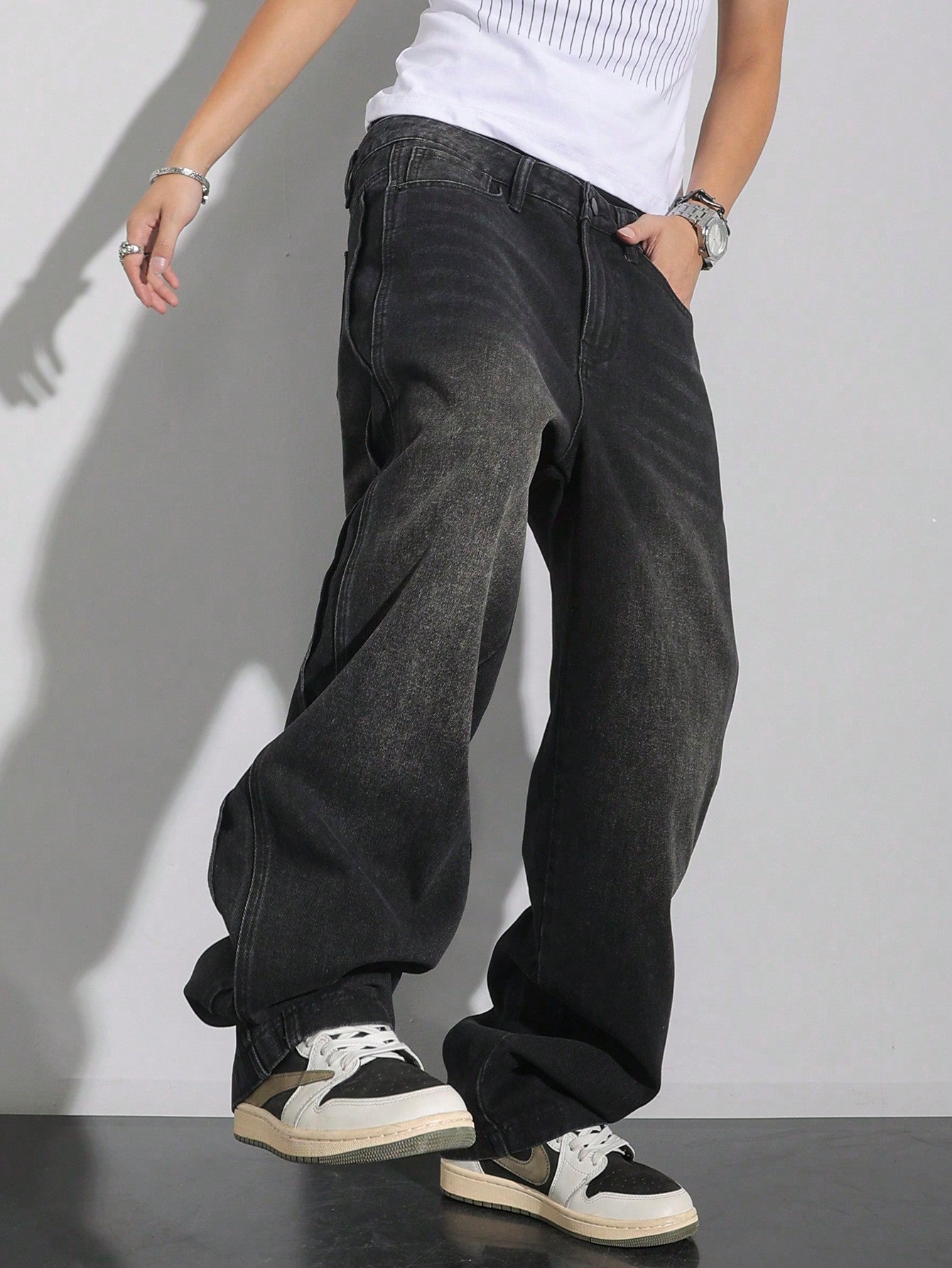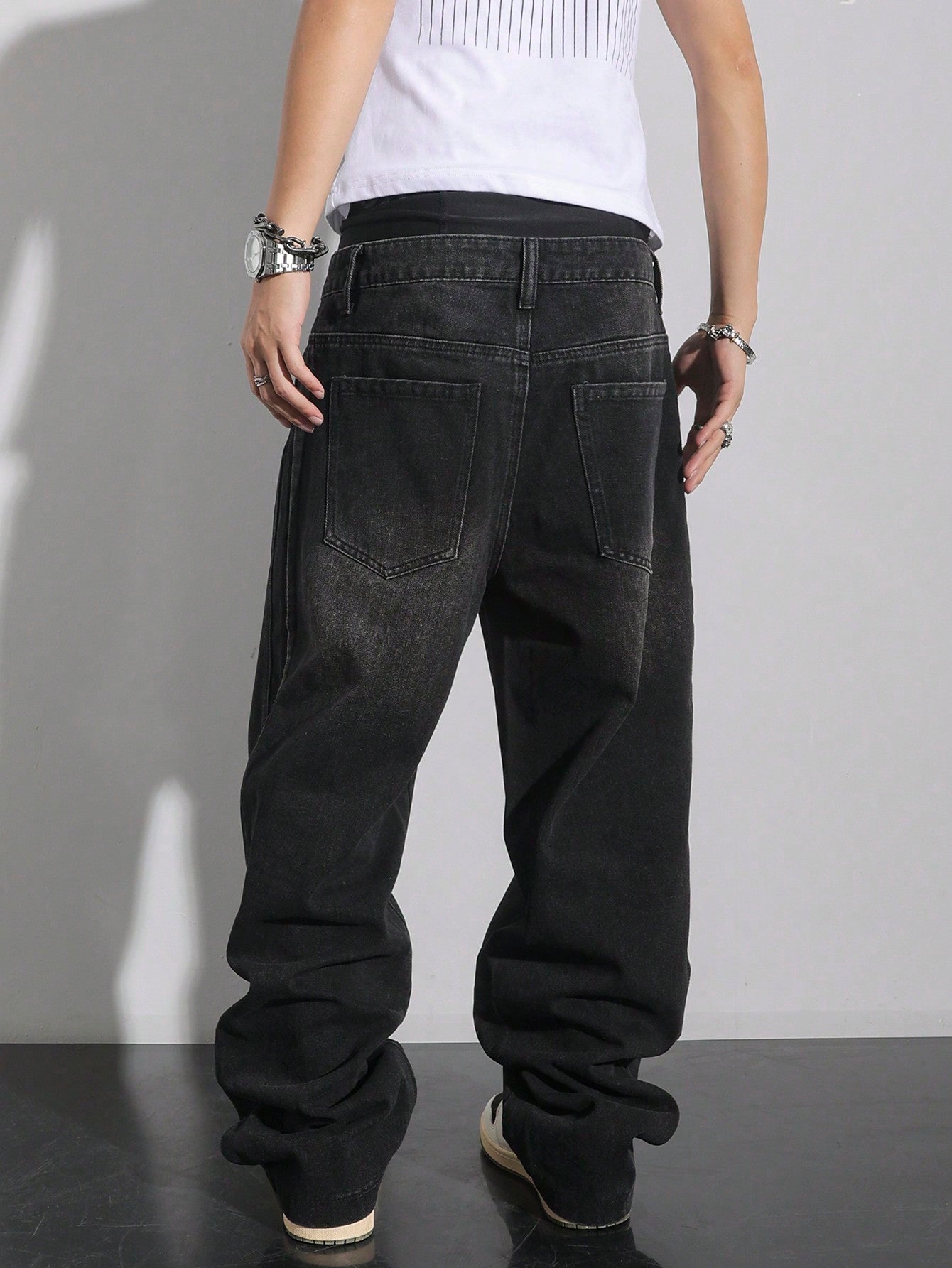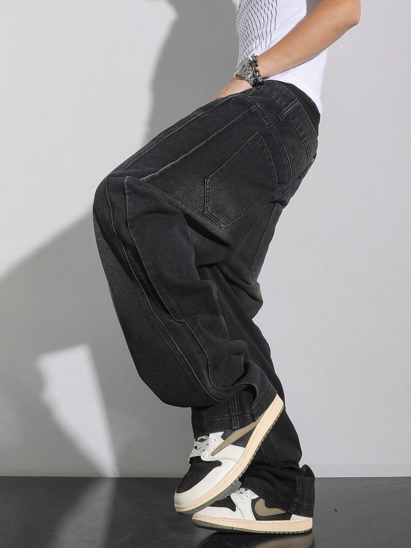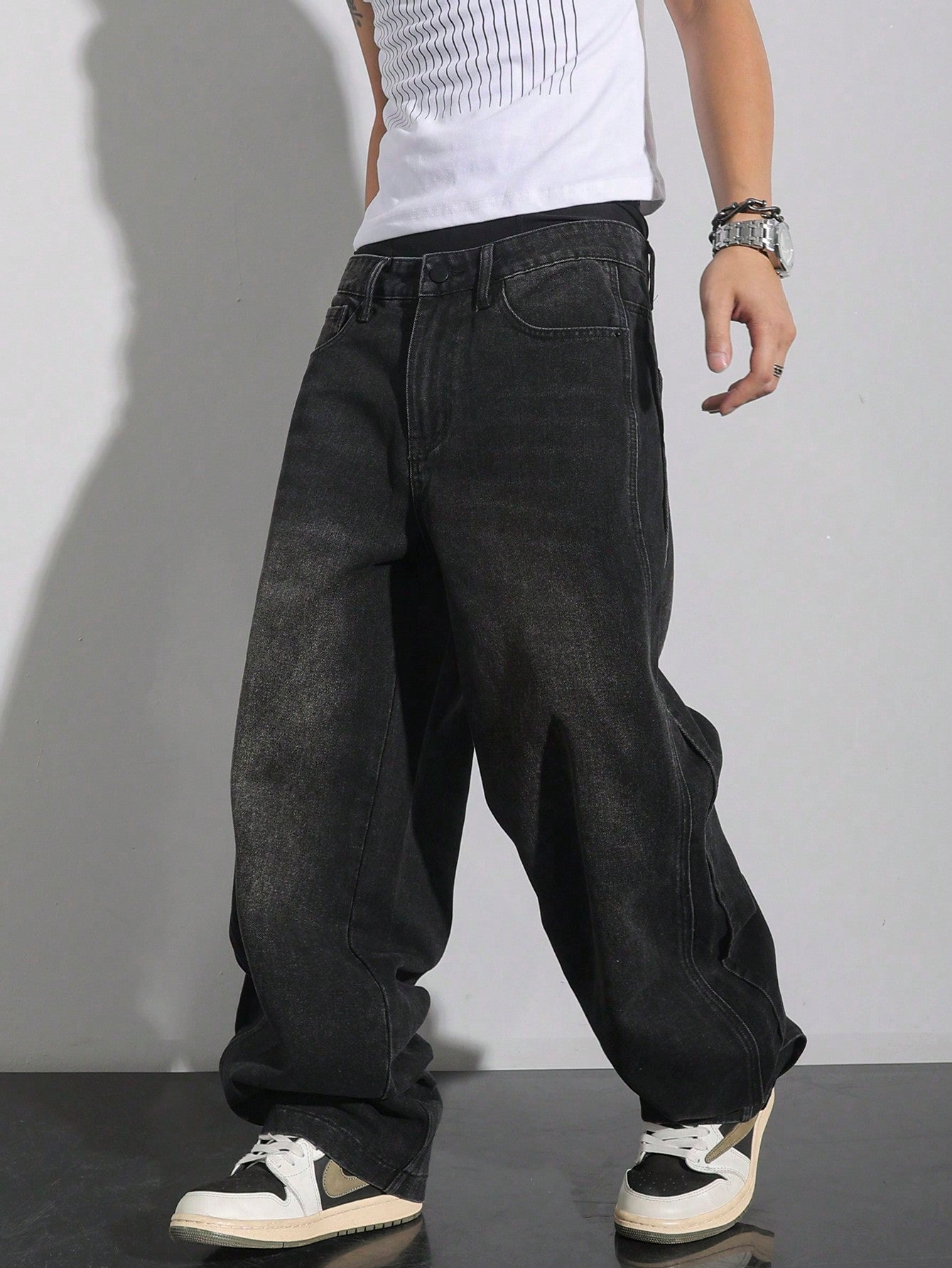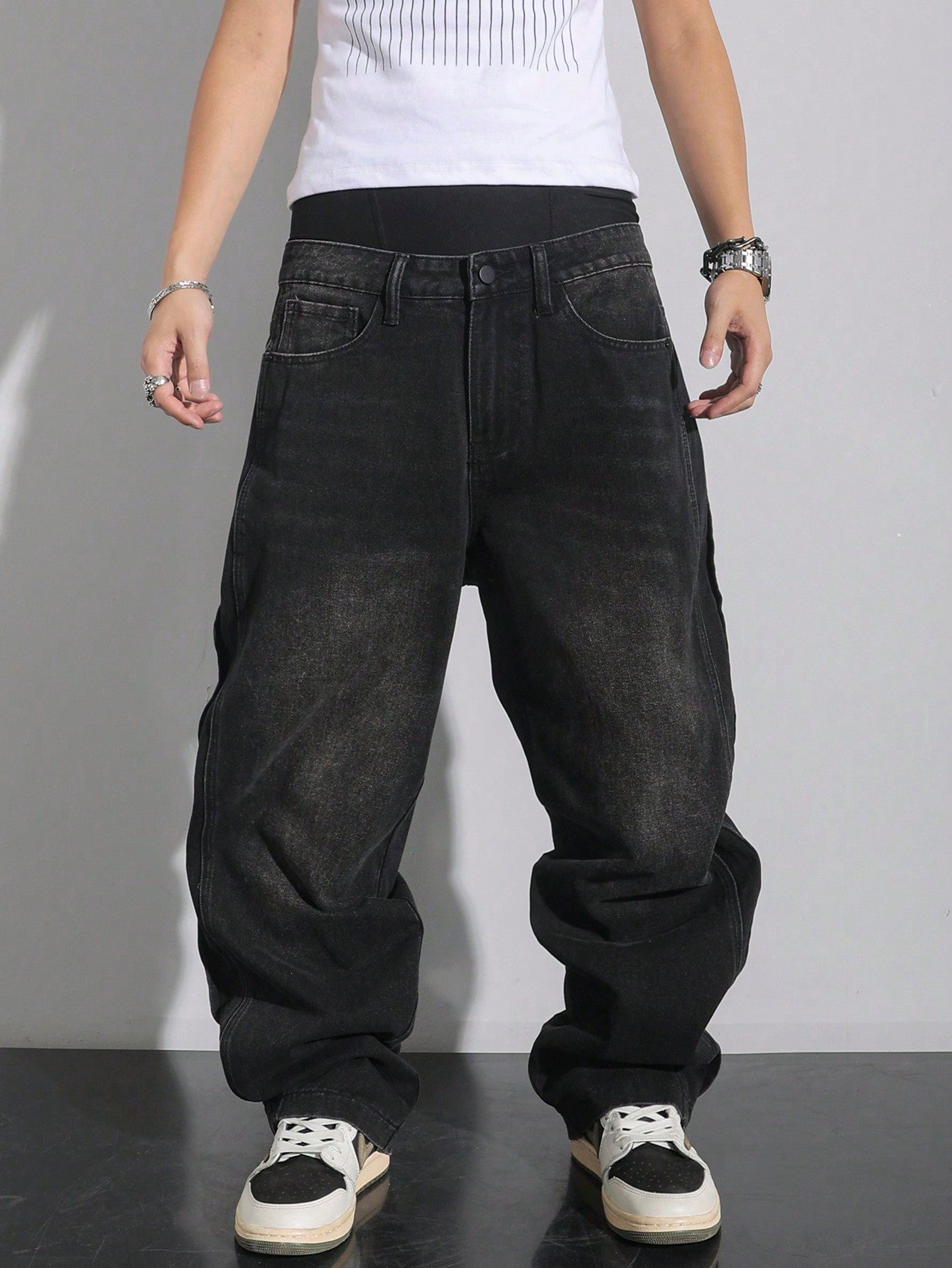 بنطلون جينز رجالي فضفاض واسع الساق بخصر منخفض من مانفينيتي إي إم آر جي، بلون موحد، مناسب للإطلالات الكاجوال.