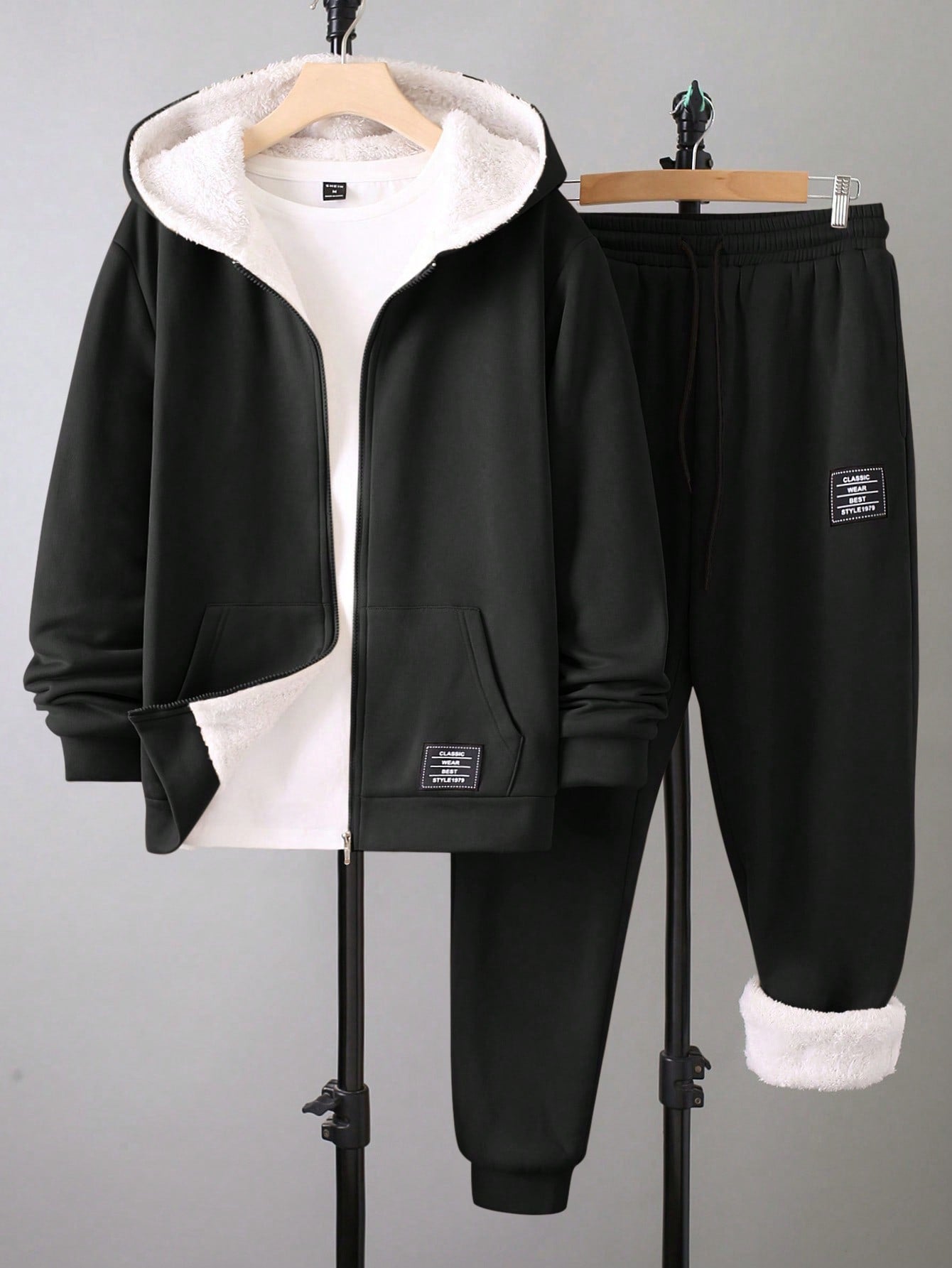 Manfinity Homme Men's Letter Printed Zipper Front Hooded Sweatshirt And Sweatpants Tracksuit Set, Casual