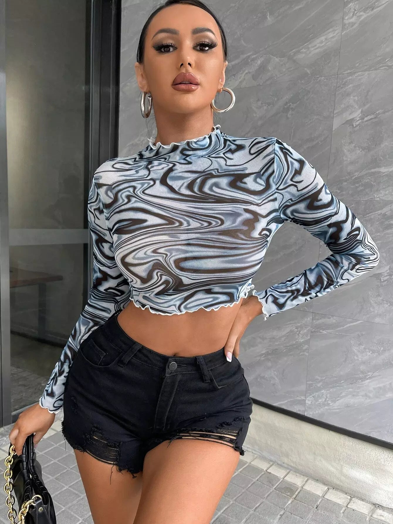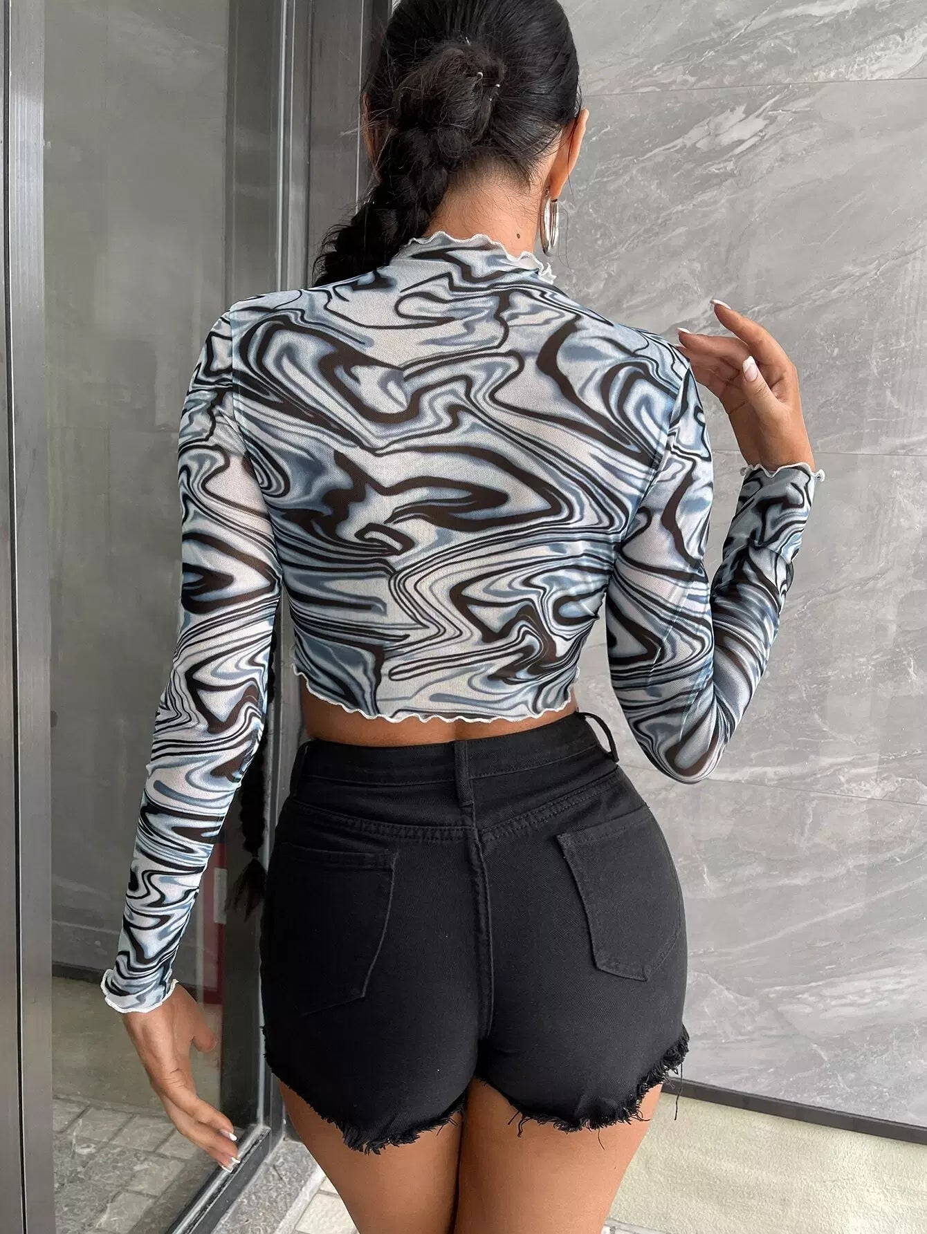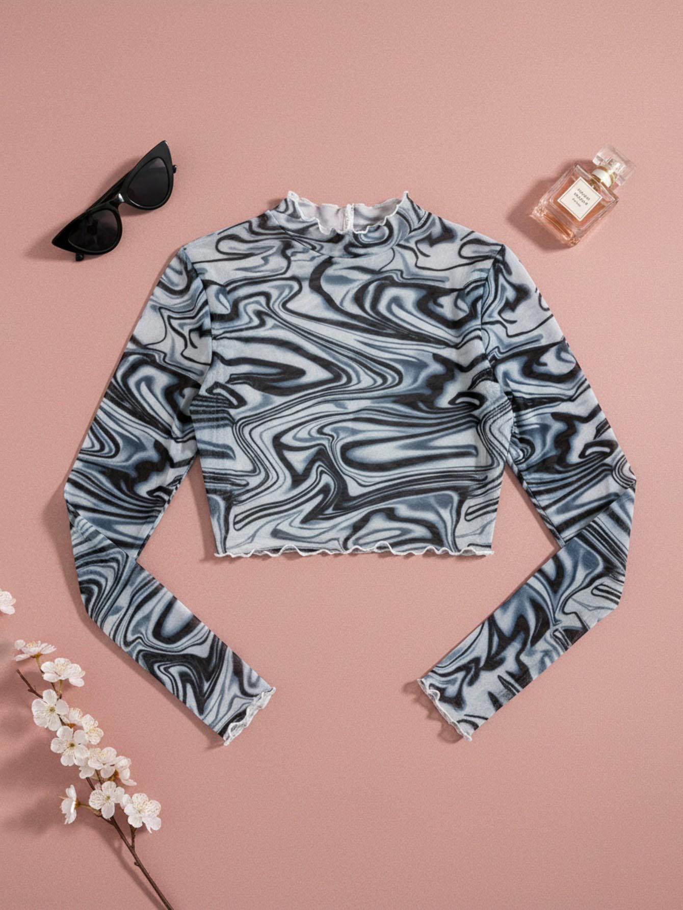 بلوزة شبكية شبكية بطبعة رخامية بحواف من الخس