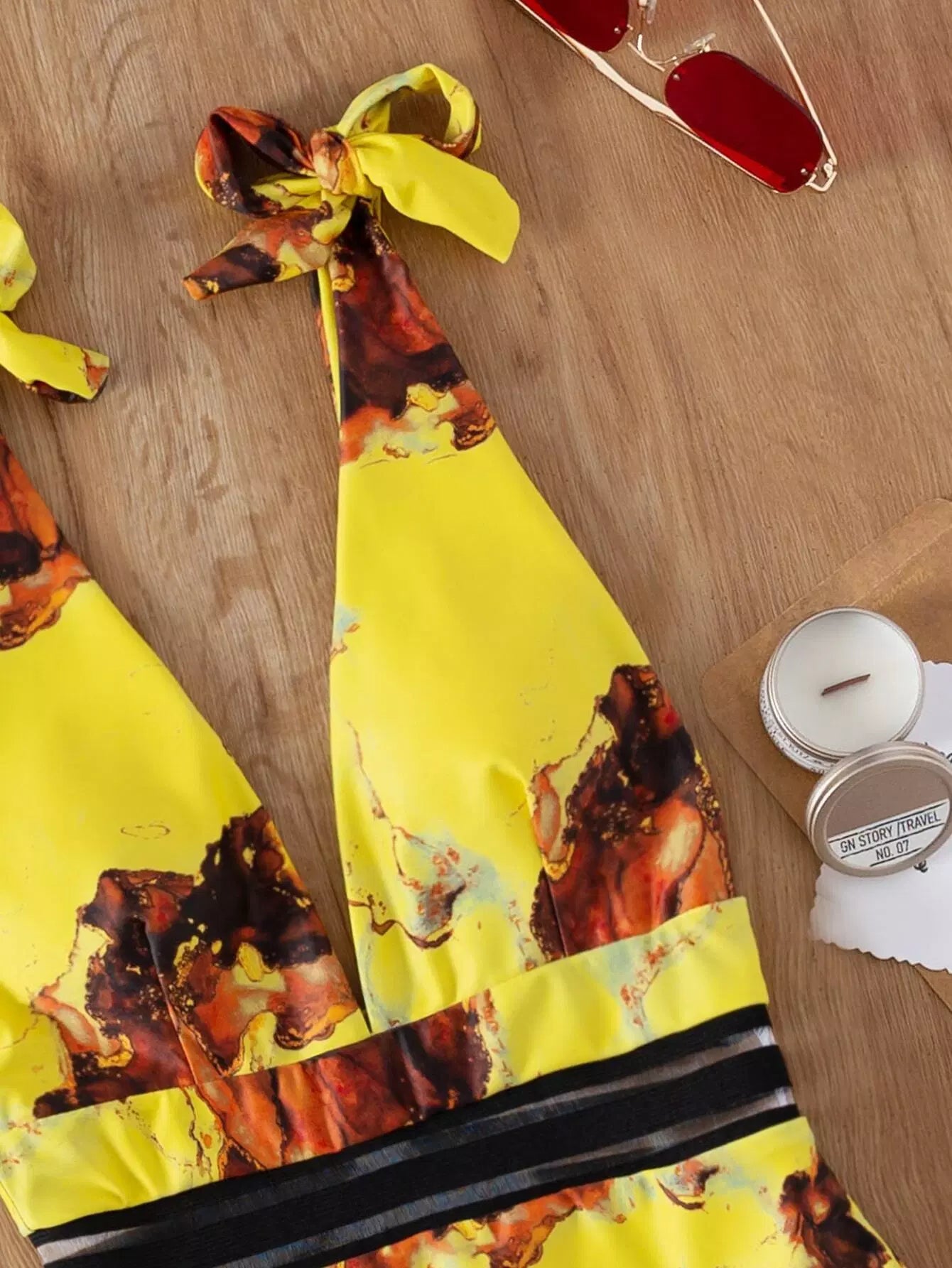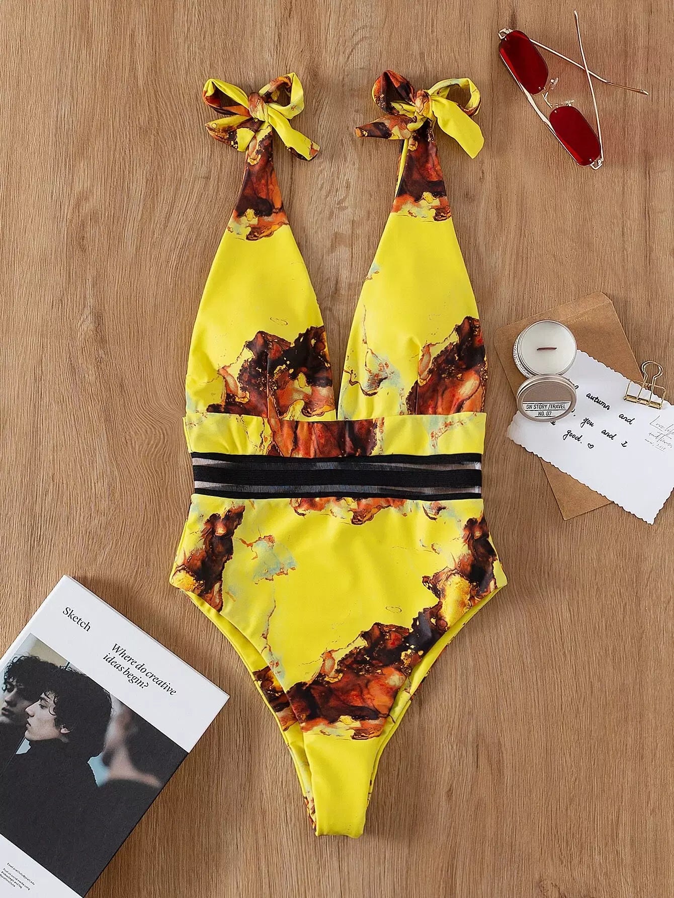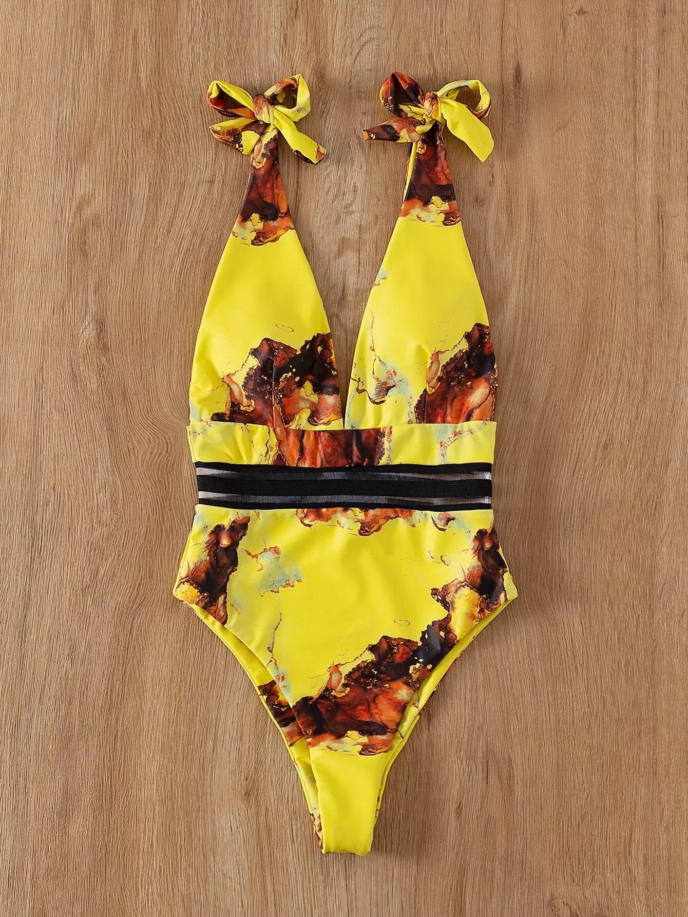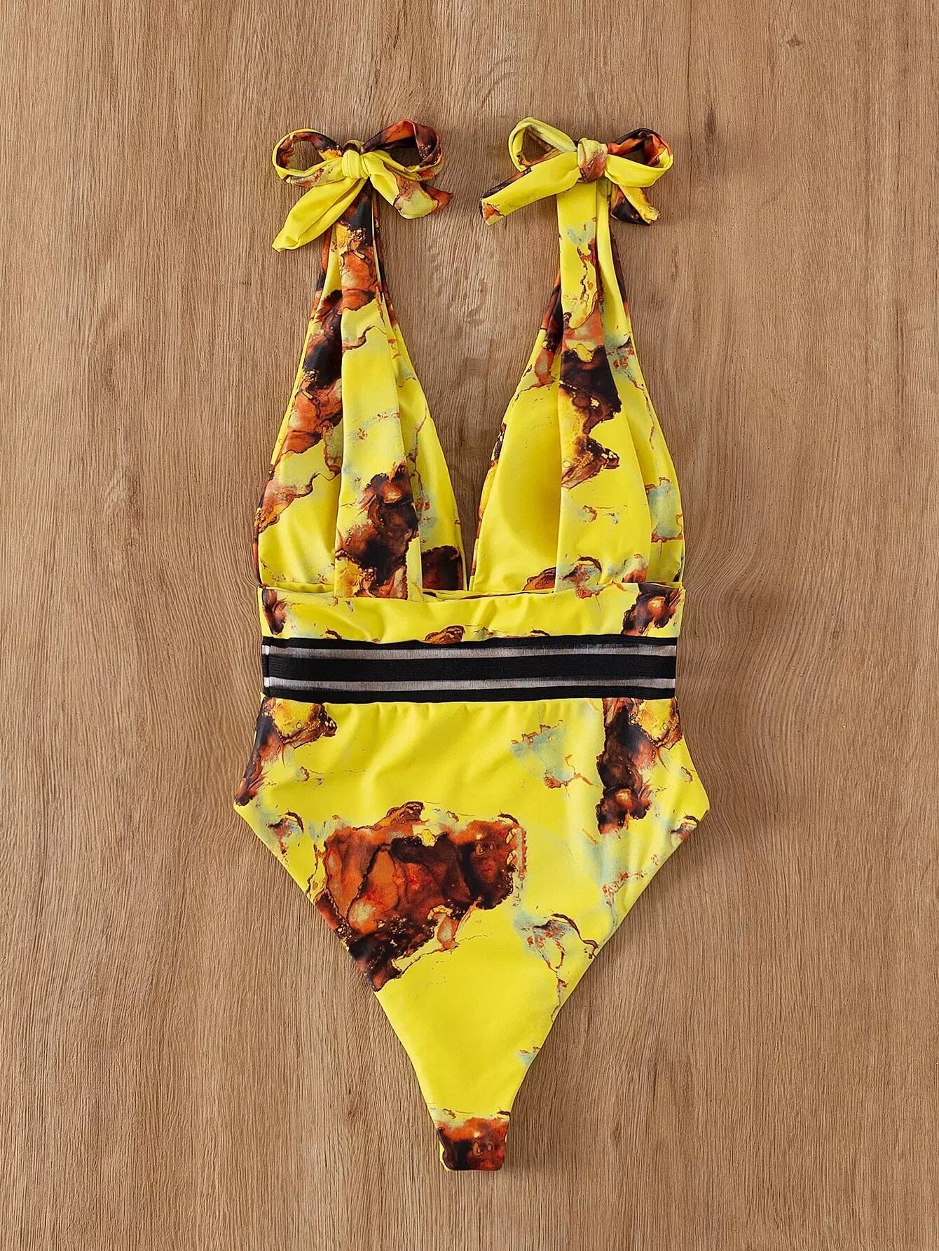 بذلة سباحة بقطعة واحدة من قطعة واحدة بطبعة رخامية على الأكتاف بربطة عنق