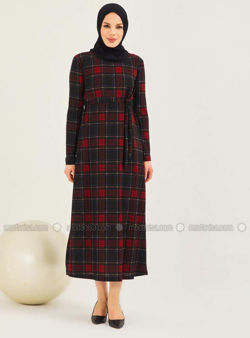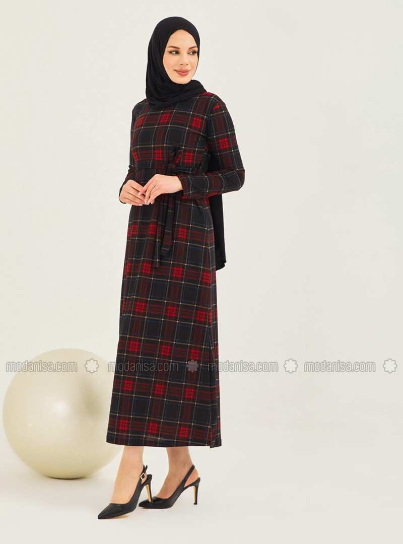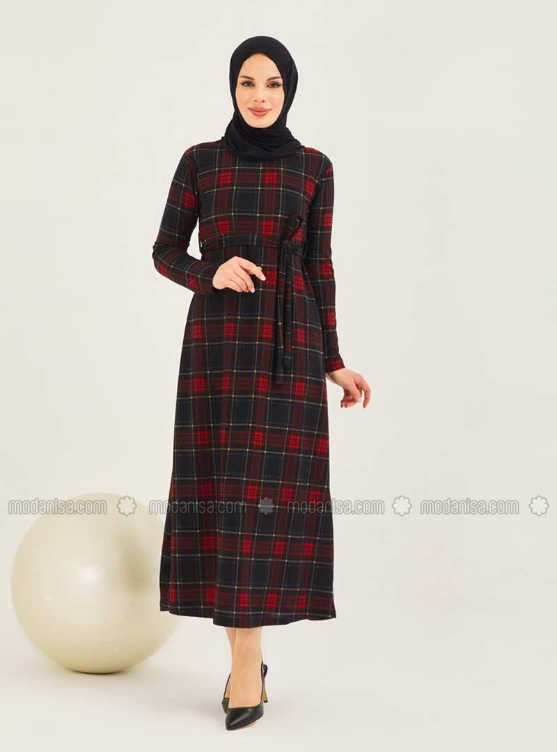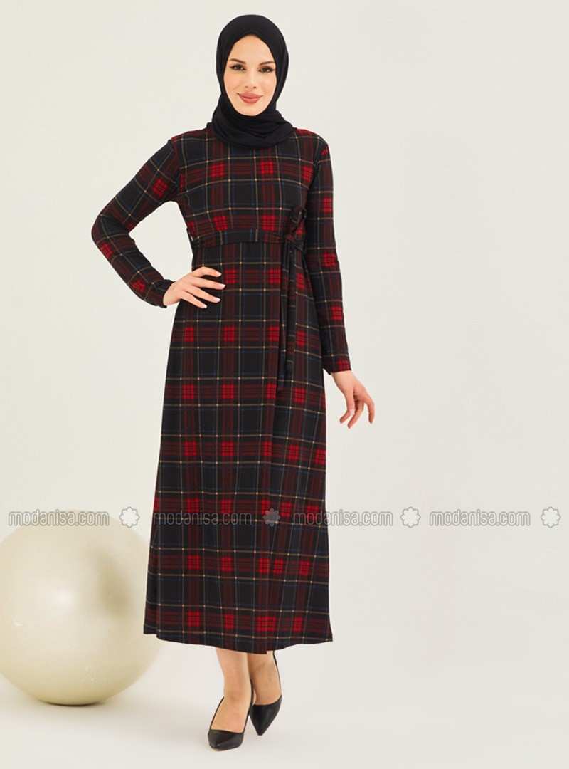 كستنائي - فستان محتشم ذو مربعات ورقبة دائرية غير مُبطن