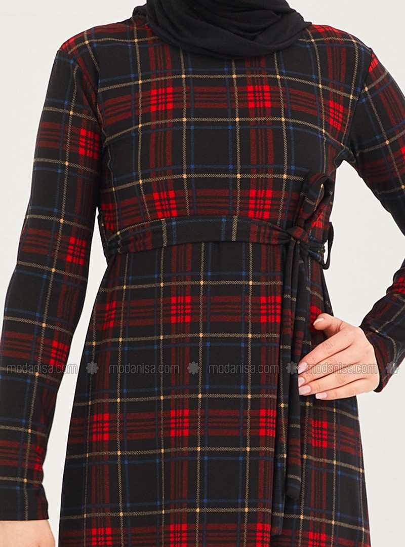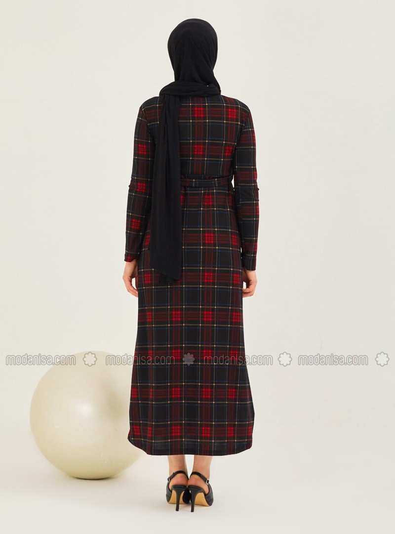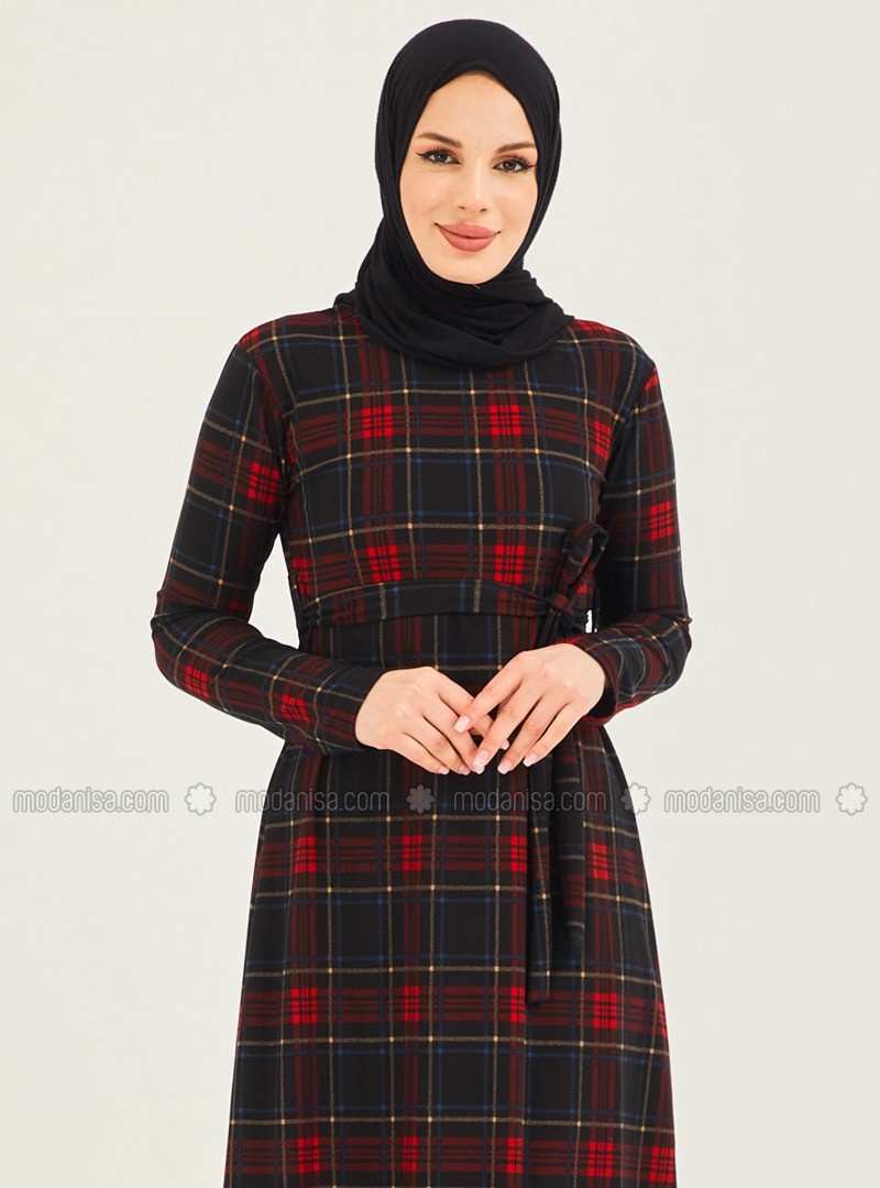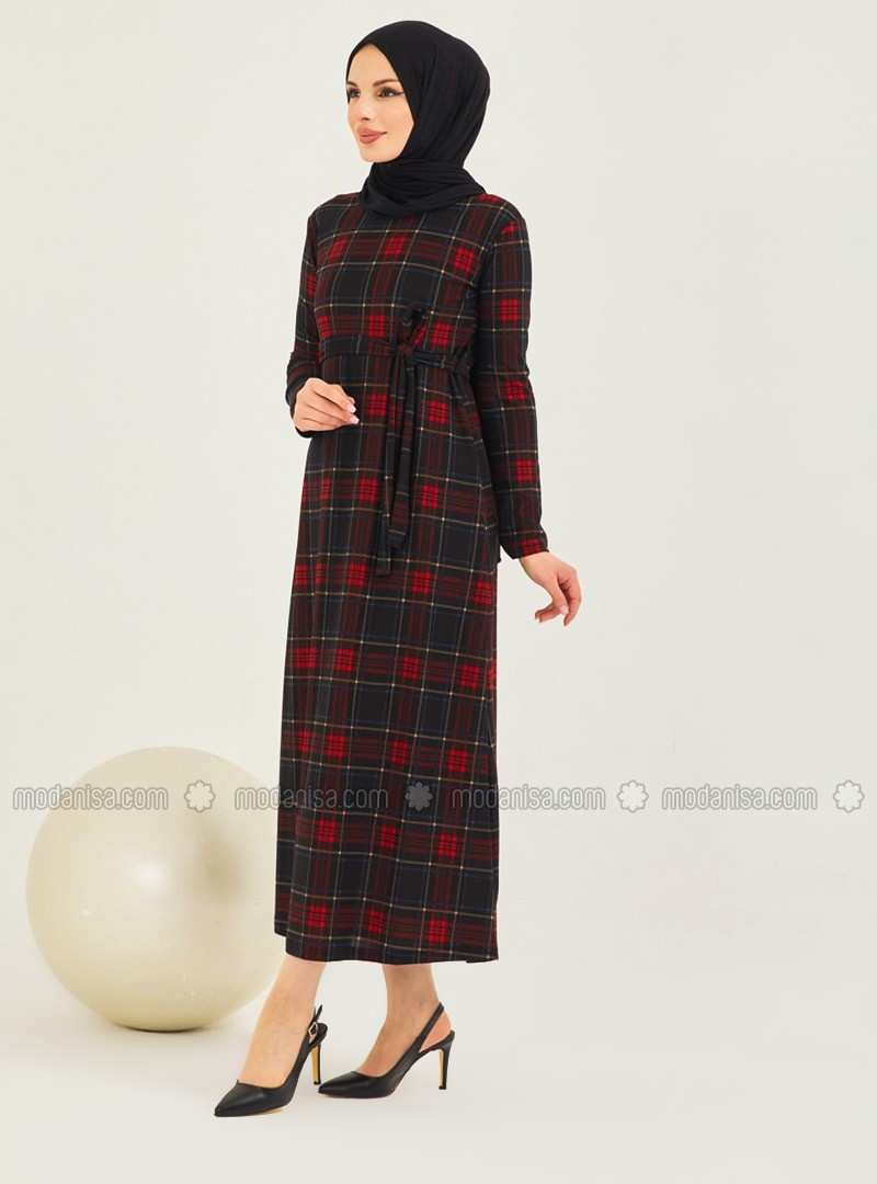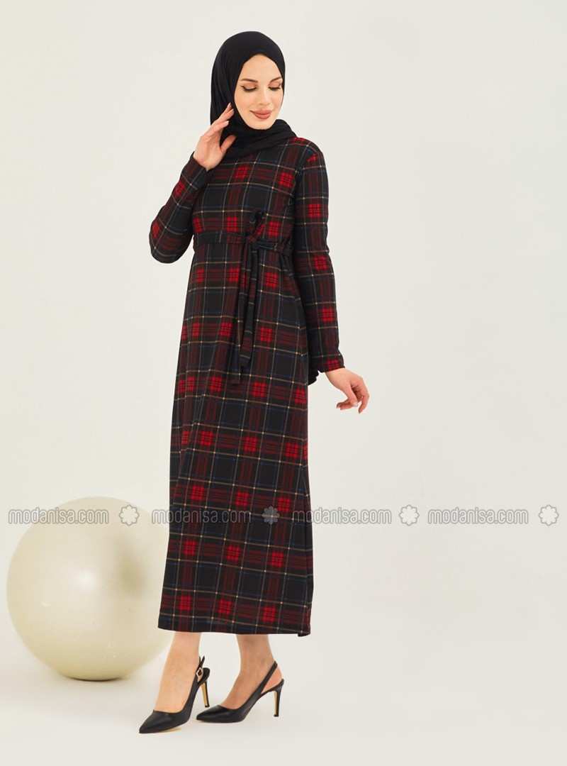 كستنائي - فستان محتشم ذو مربعات ورقبة دائرية غير مُبطن