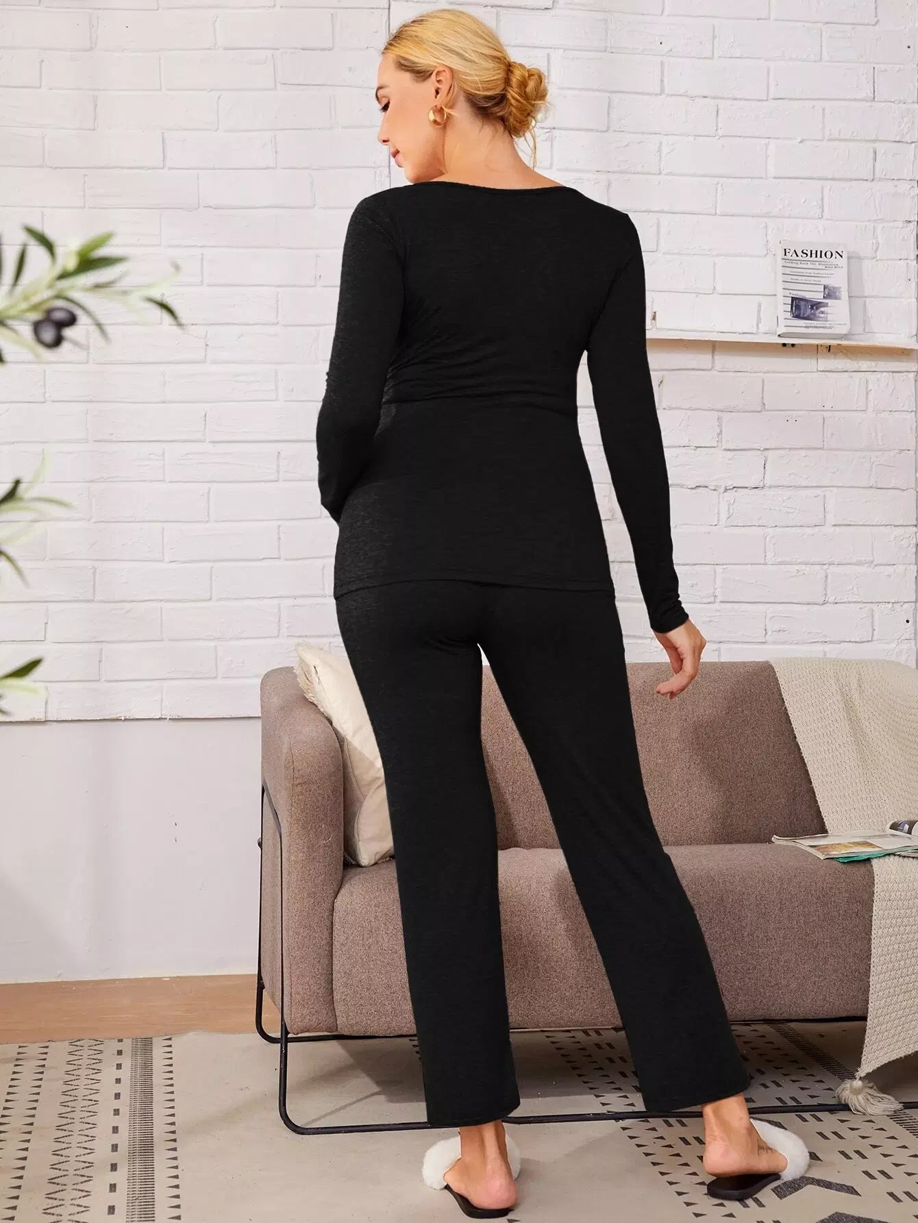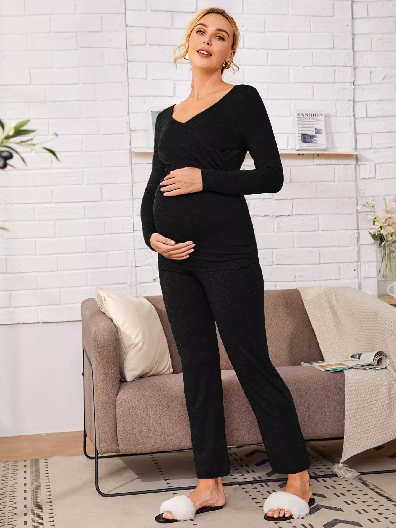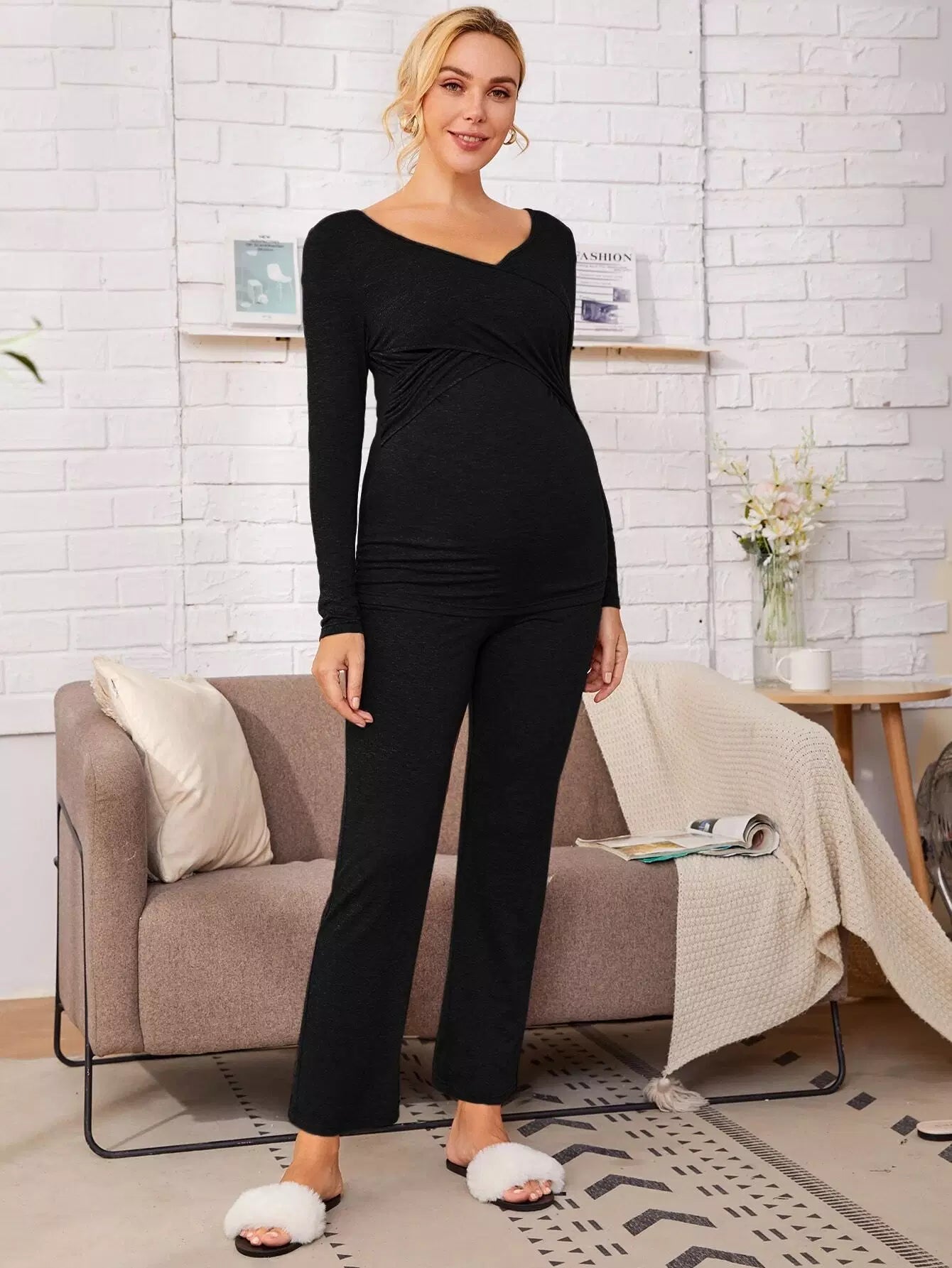 طقم تي شيرت وبنطلون للرضاعة ملفوف من الأمام للحوامل
