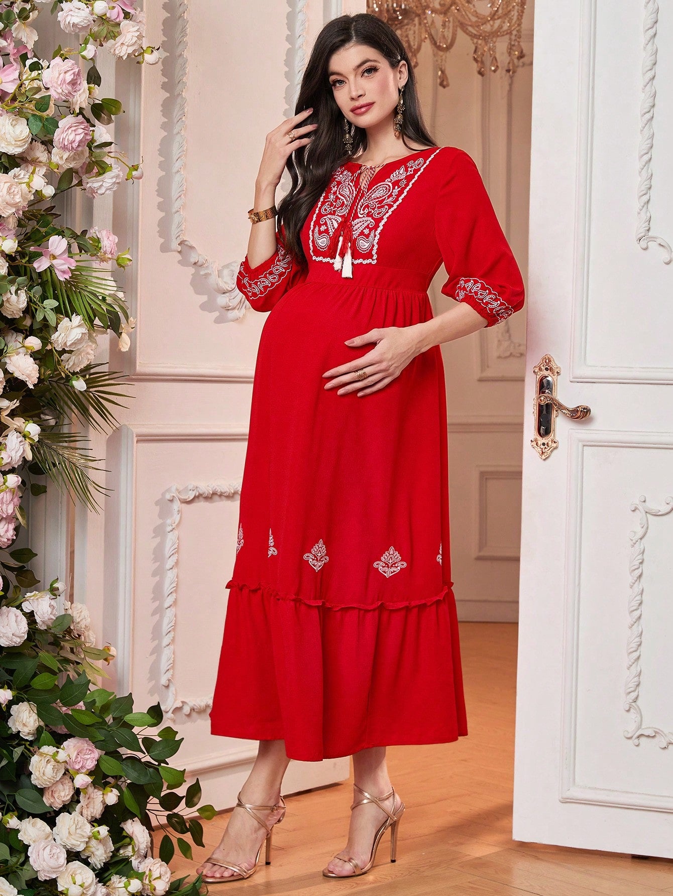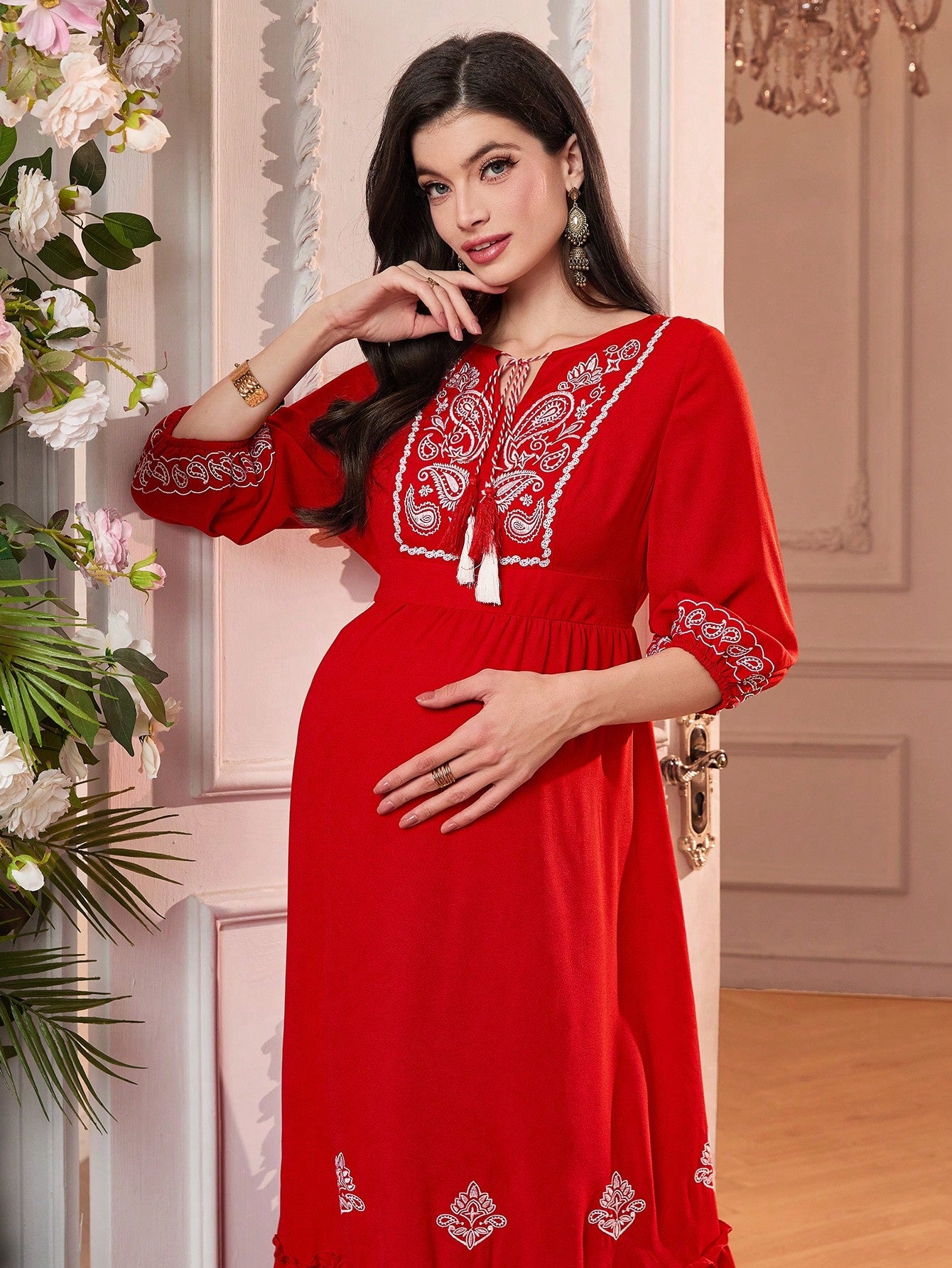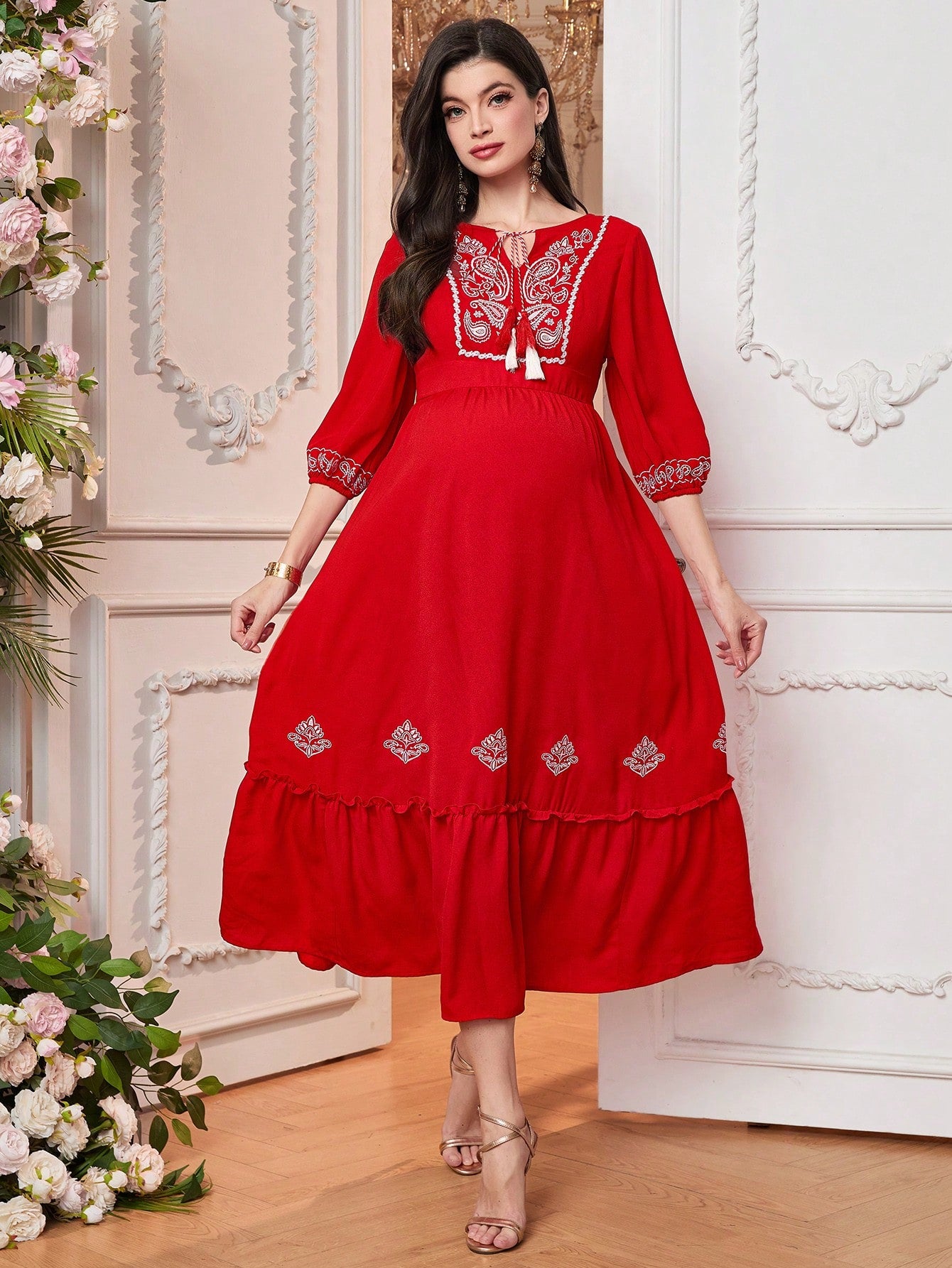 Maternity Front Tie 3/4 Sleeve Tassel Decor Simple Elegant Dress