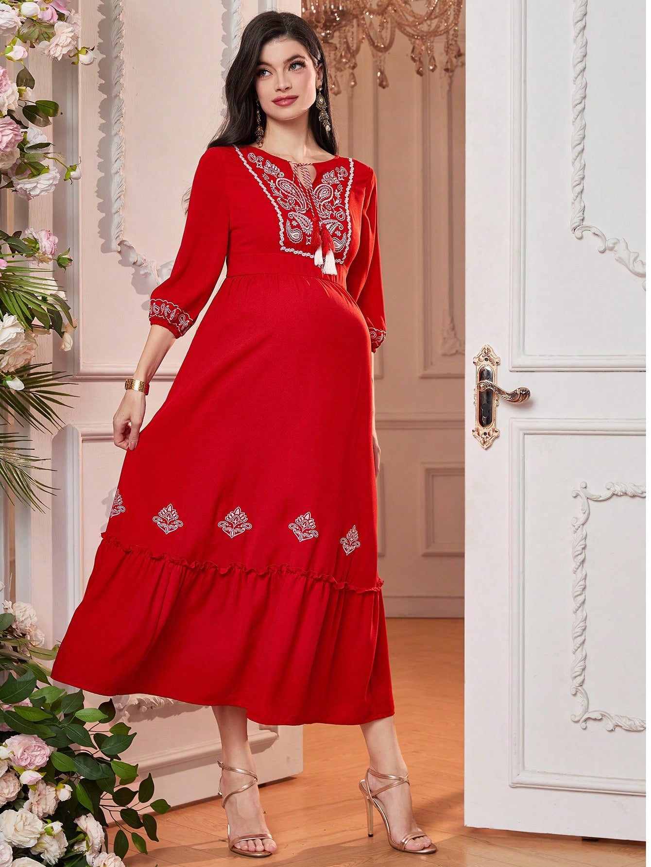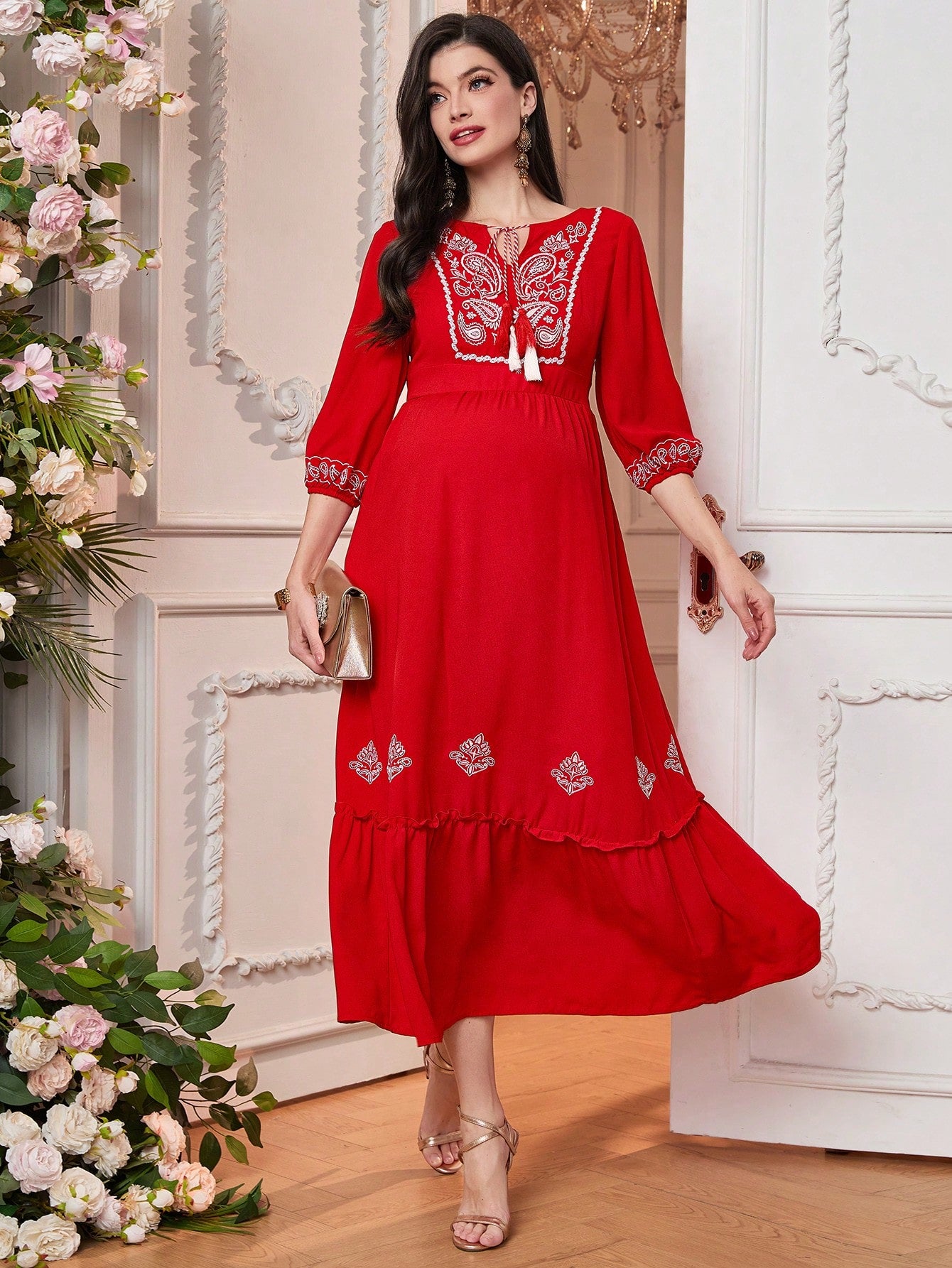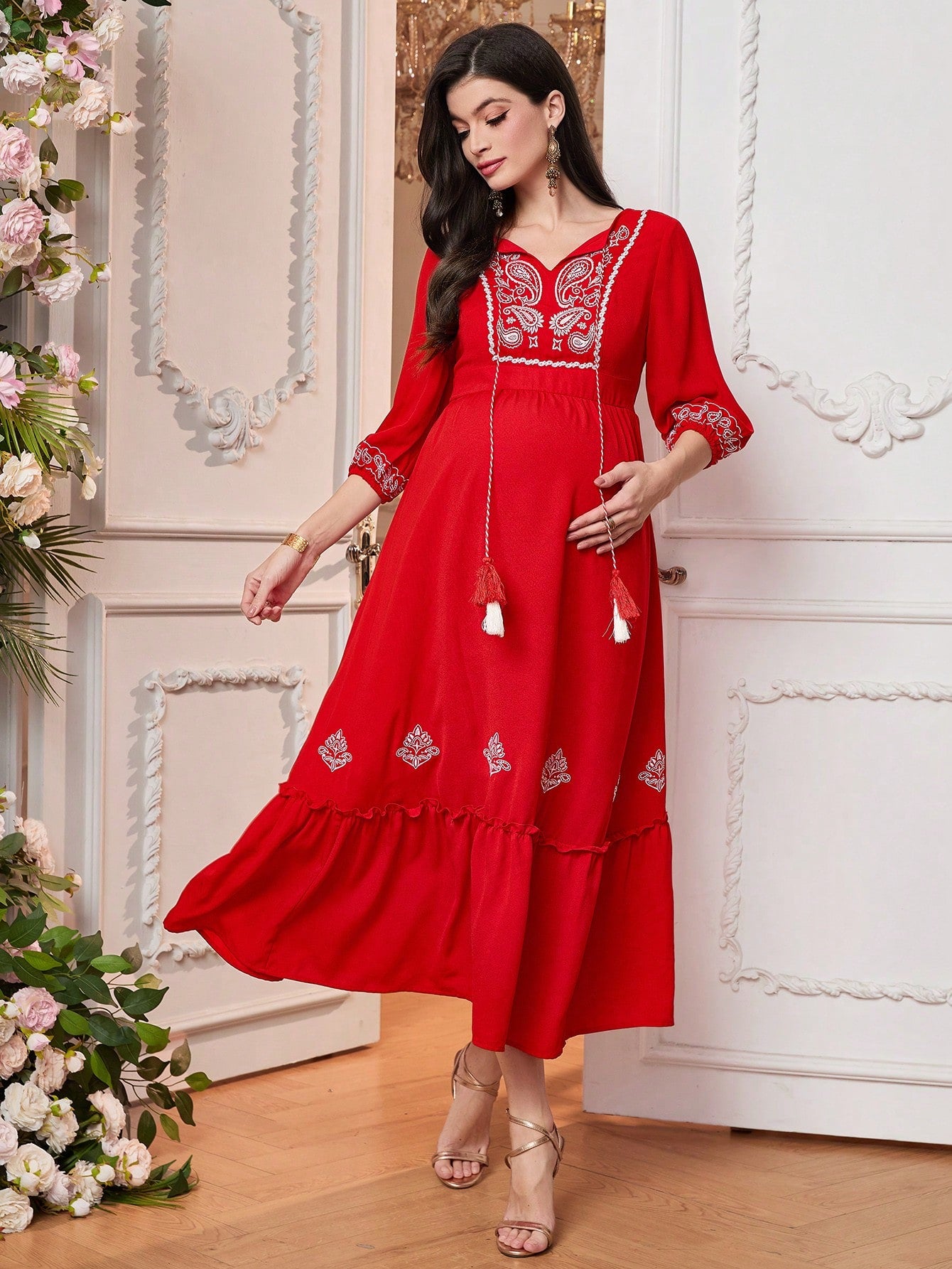 Maternity Front Tie 3/4 Sleeve Tassel Decor Simple Elegant Dress