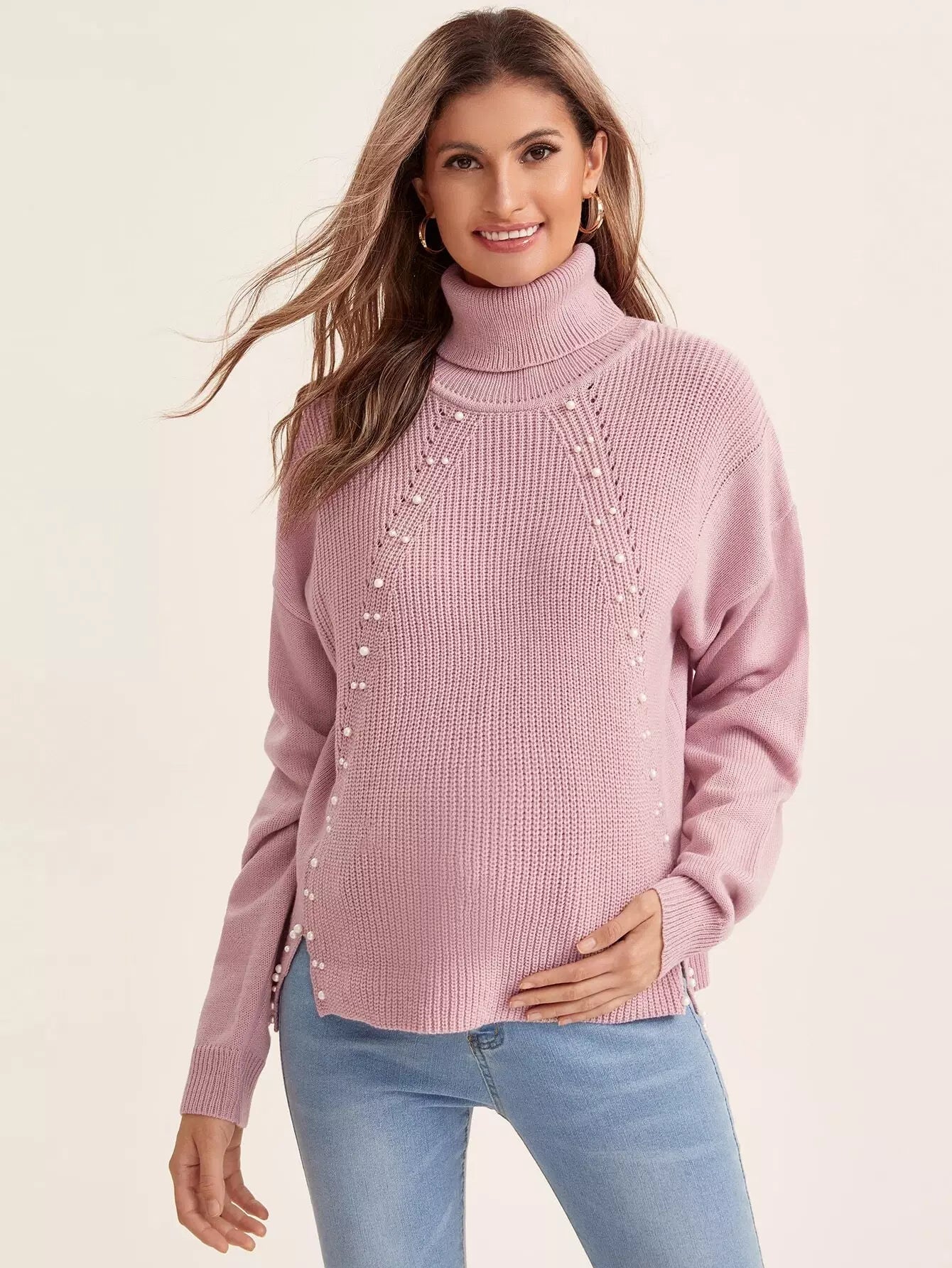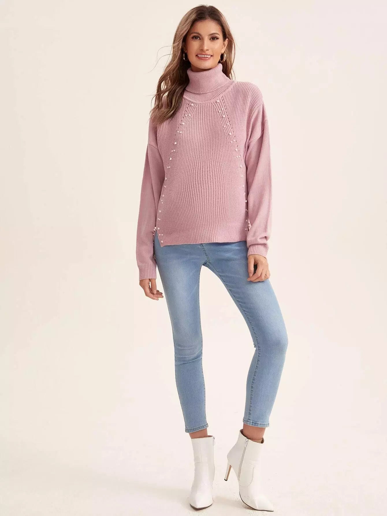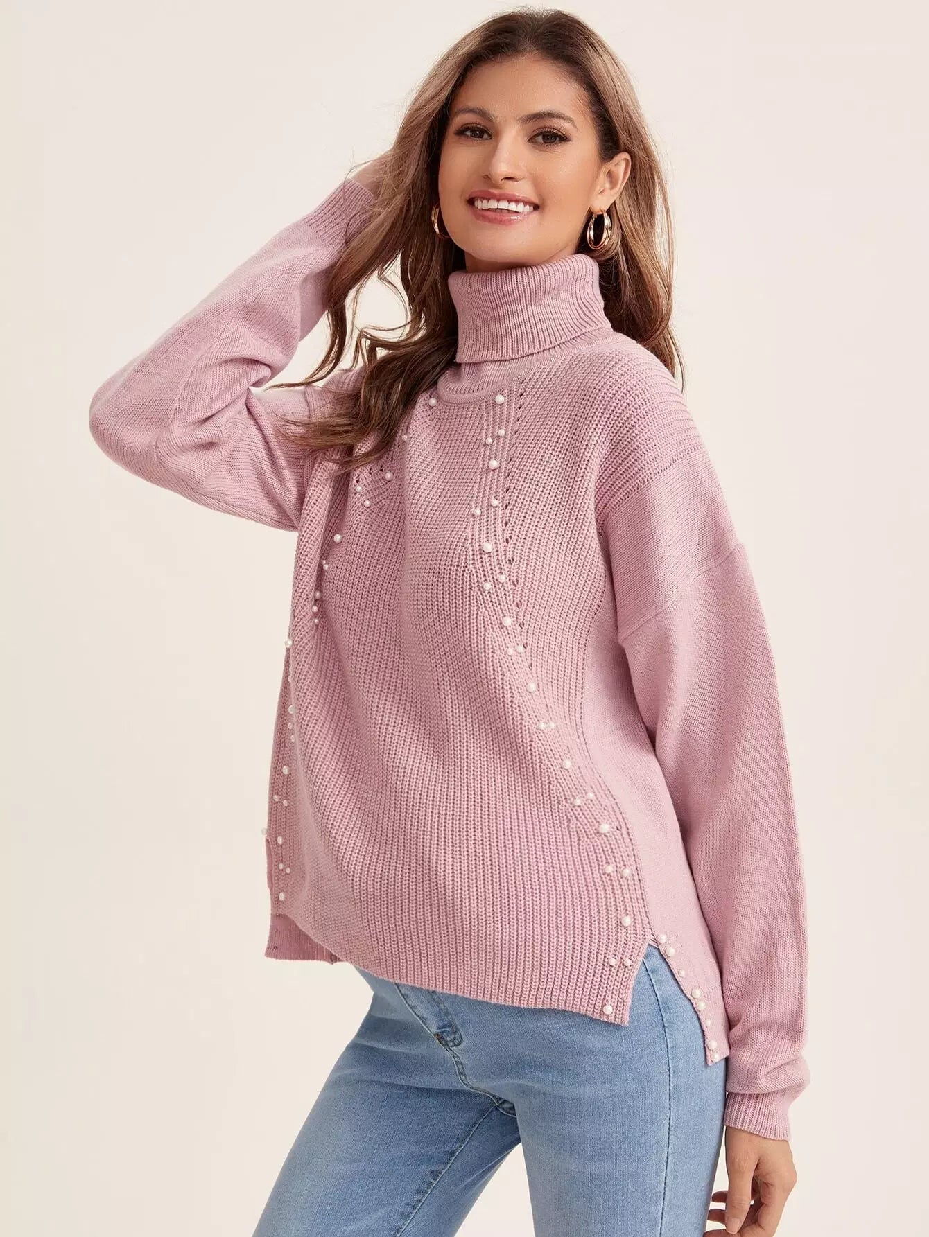 سترة حوامل برقبة عالية منسدلة الكتفين ومطرزة باللؤلؤ والخرز