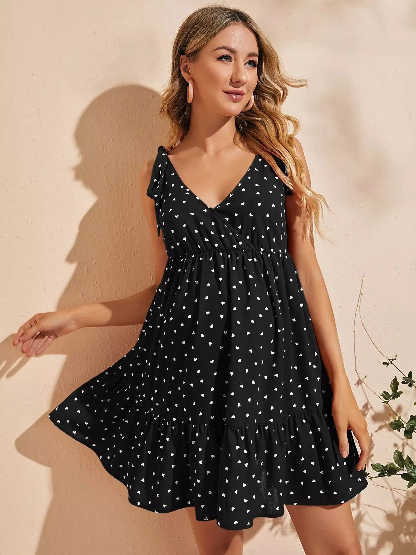 فستان بحمالات بأربطة على شكل عقدة للحوامل برقبة كشكش بحافة كشكش مطبوع على شكل قلب