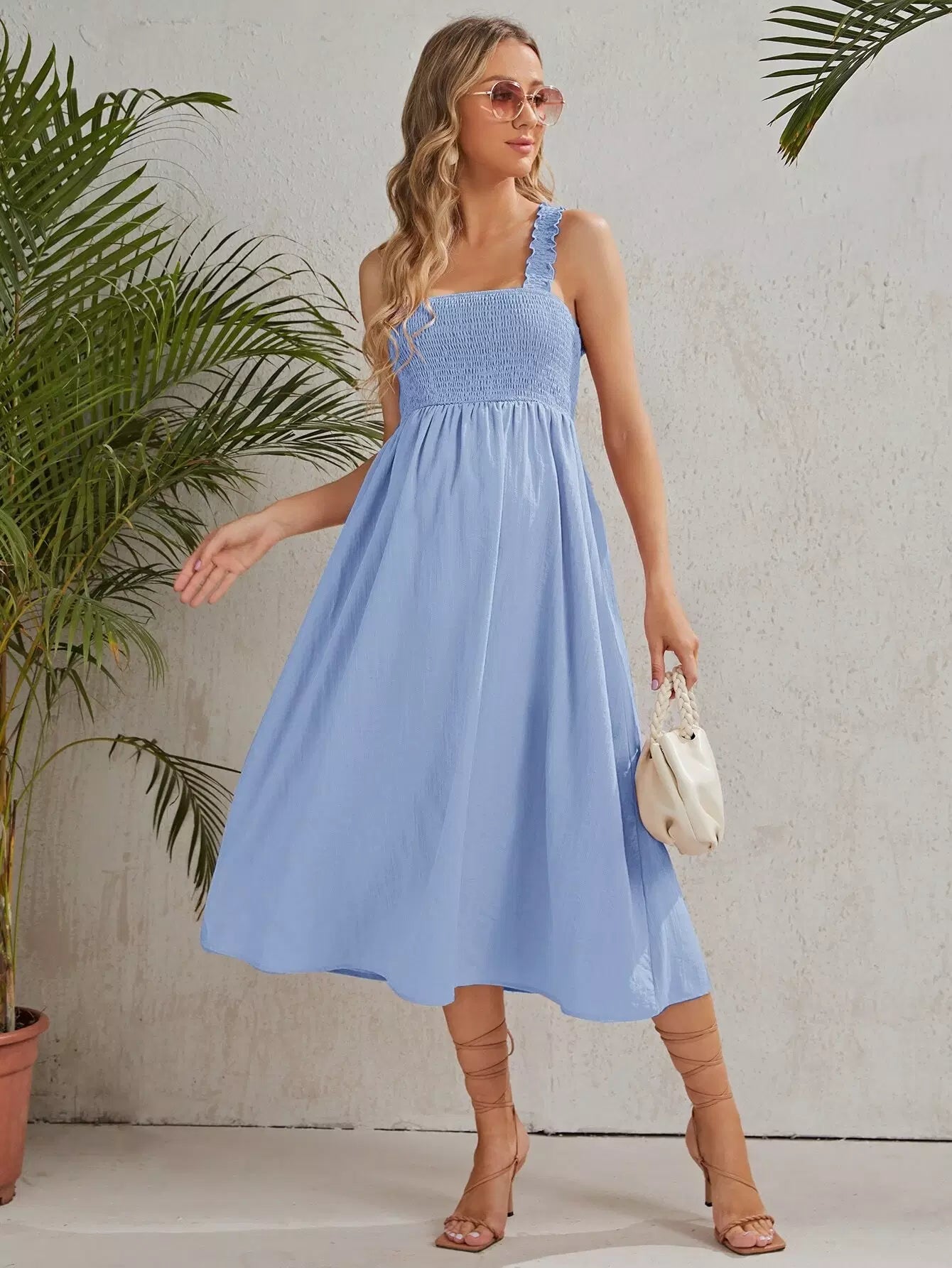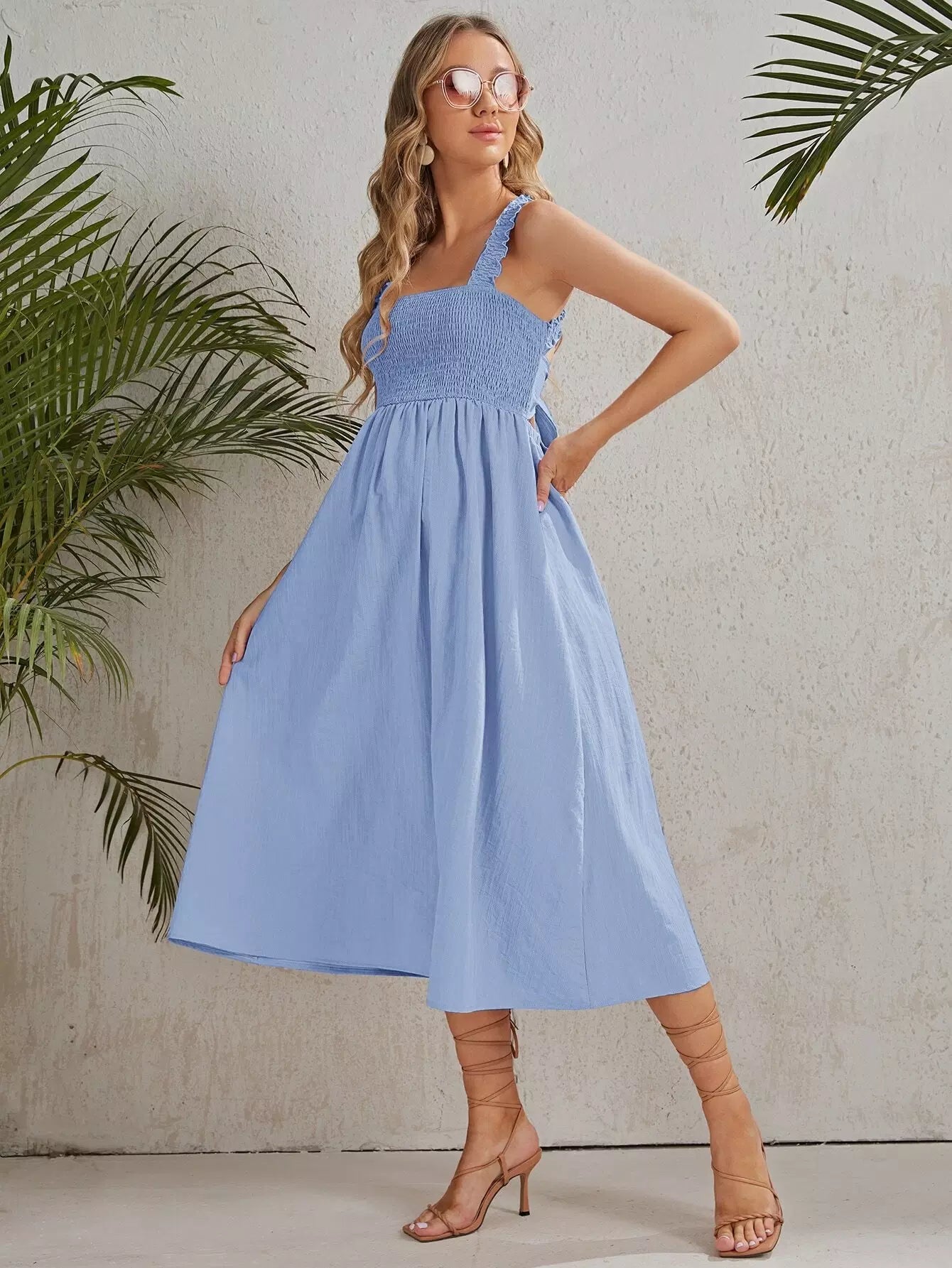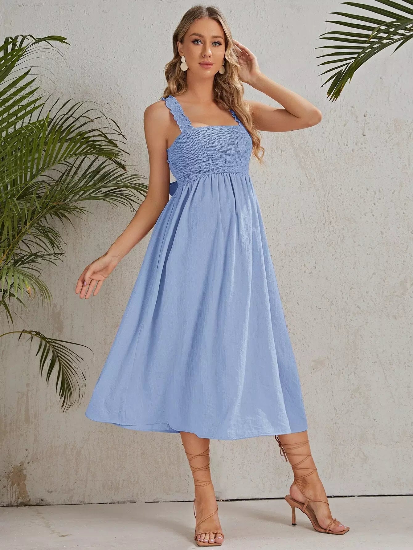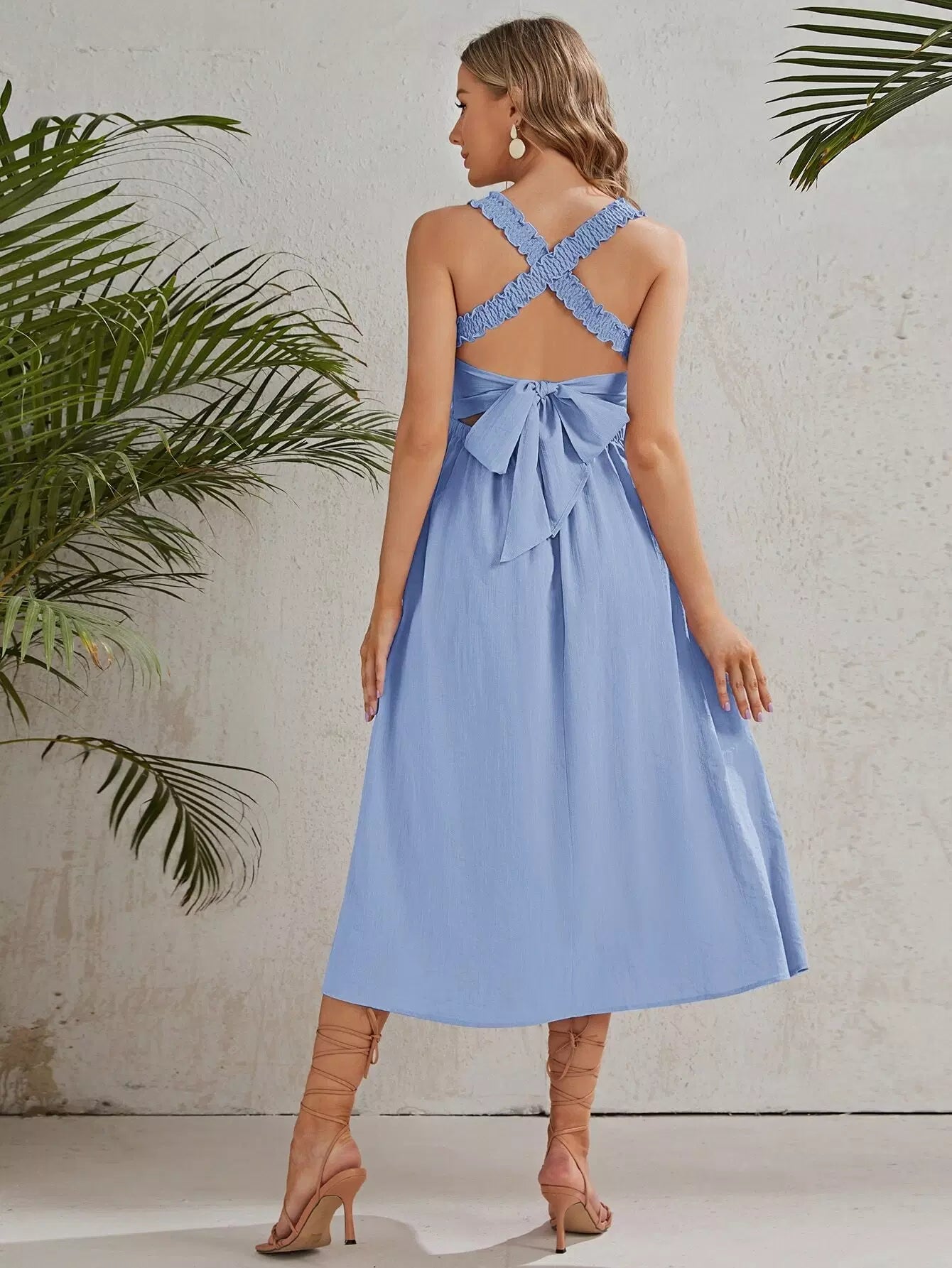 فستان حوامل بربطة عنق بدون أكمام ومفتوح من الخلف ومزخرف بشريط متقاطع