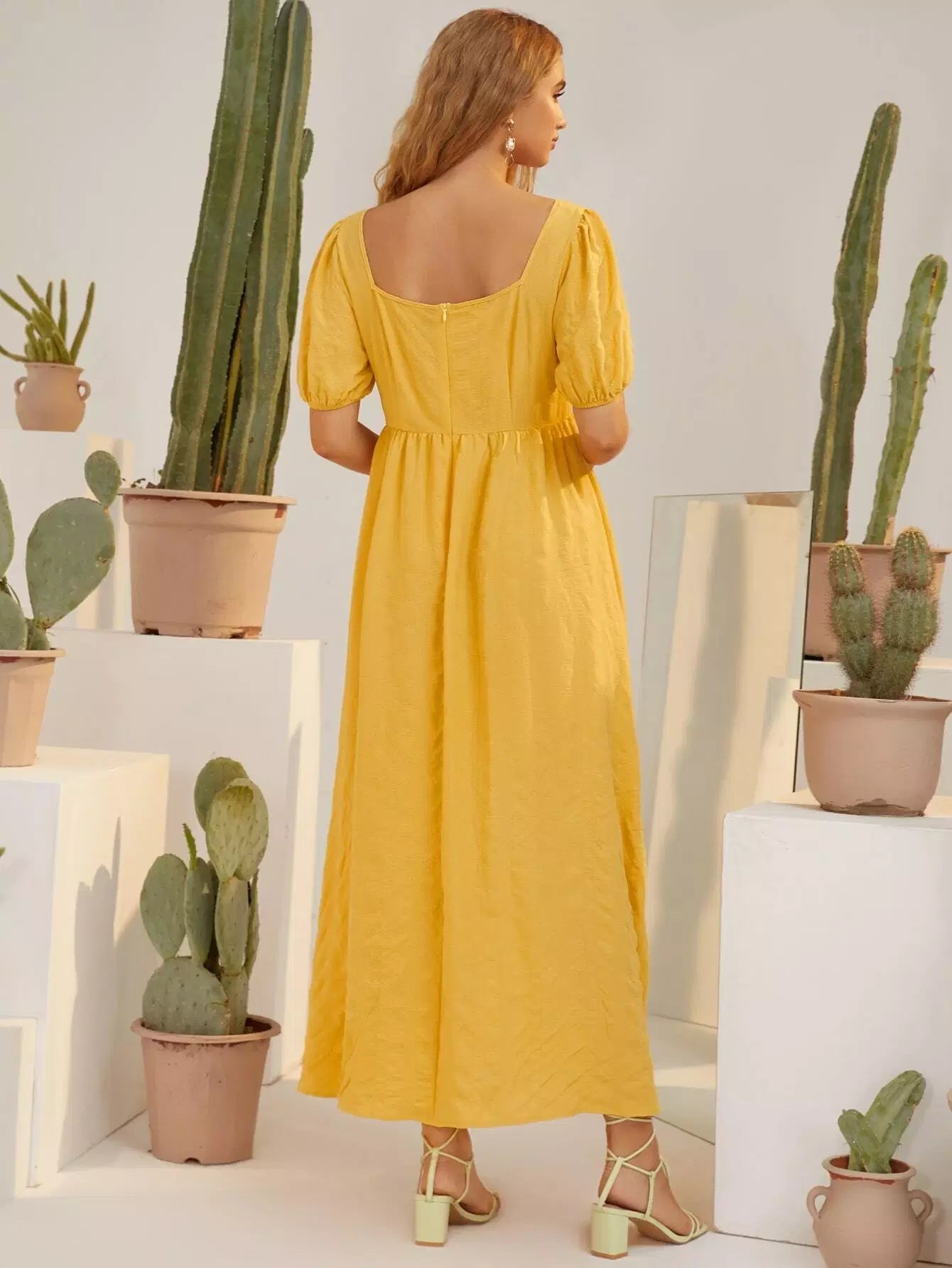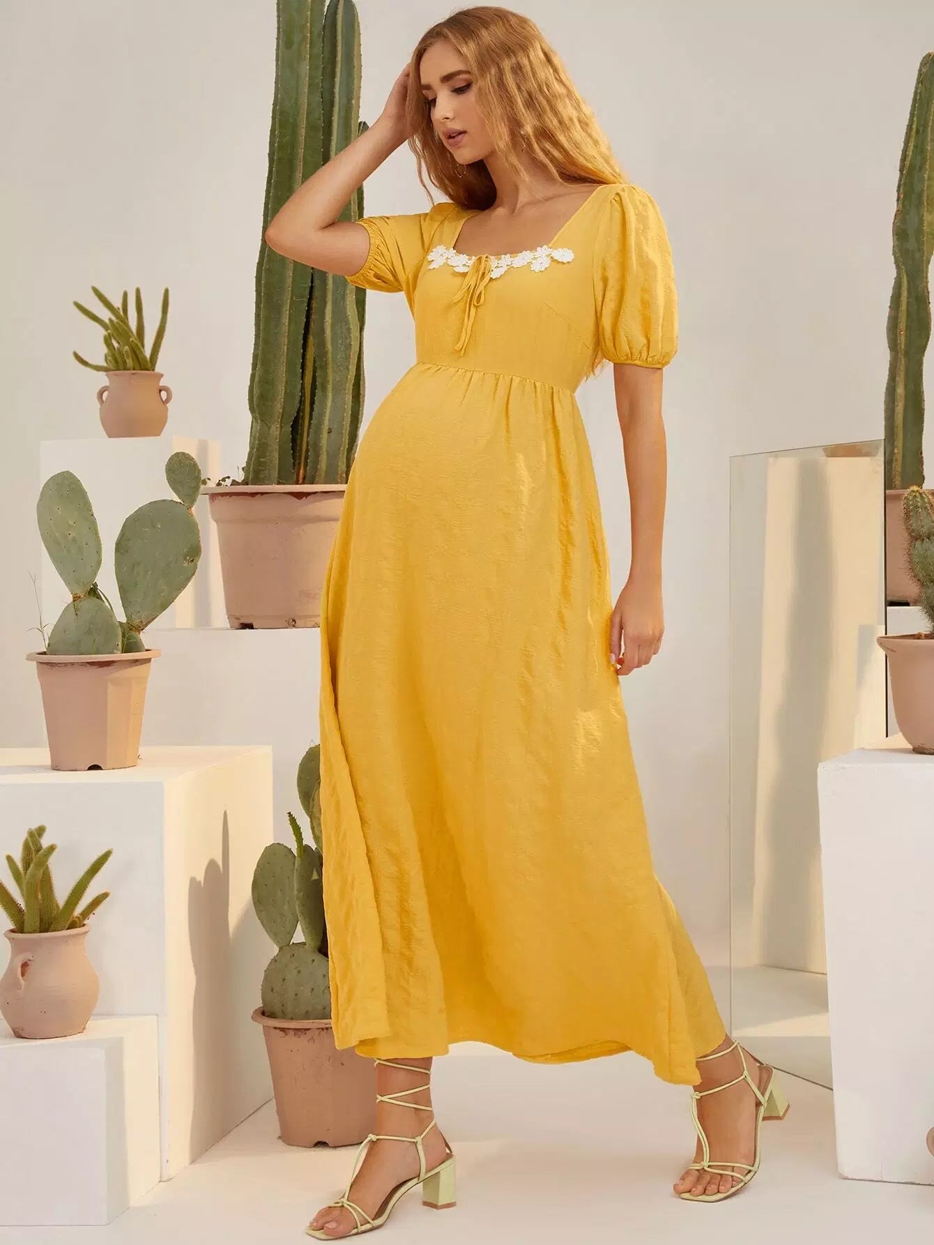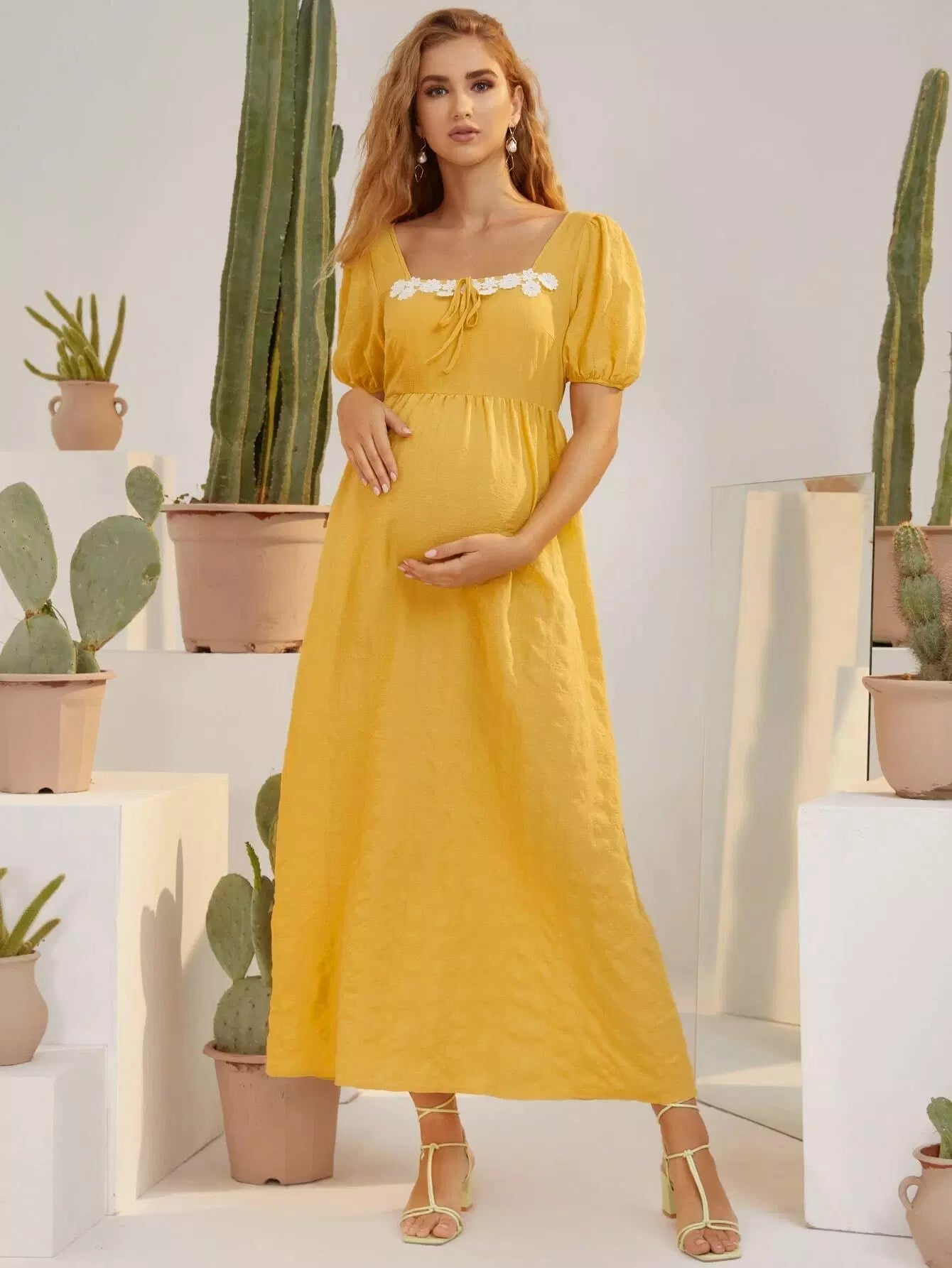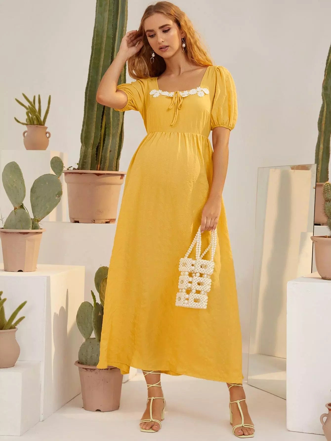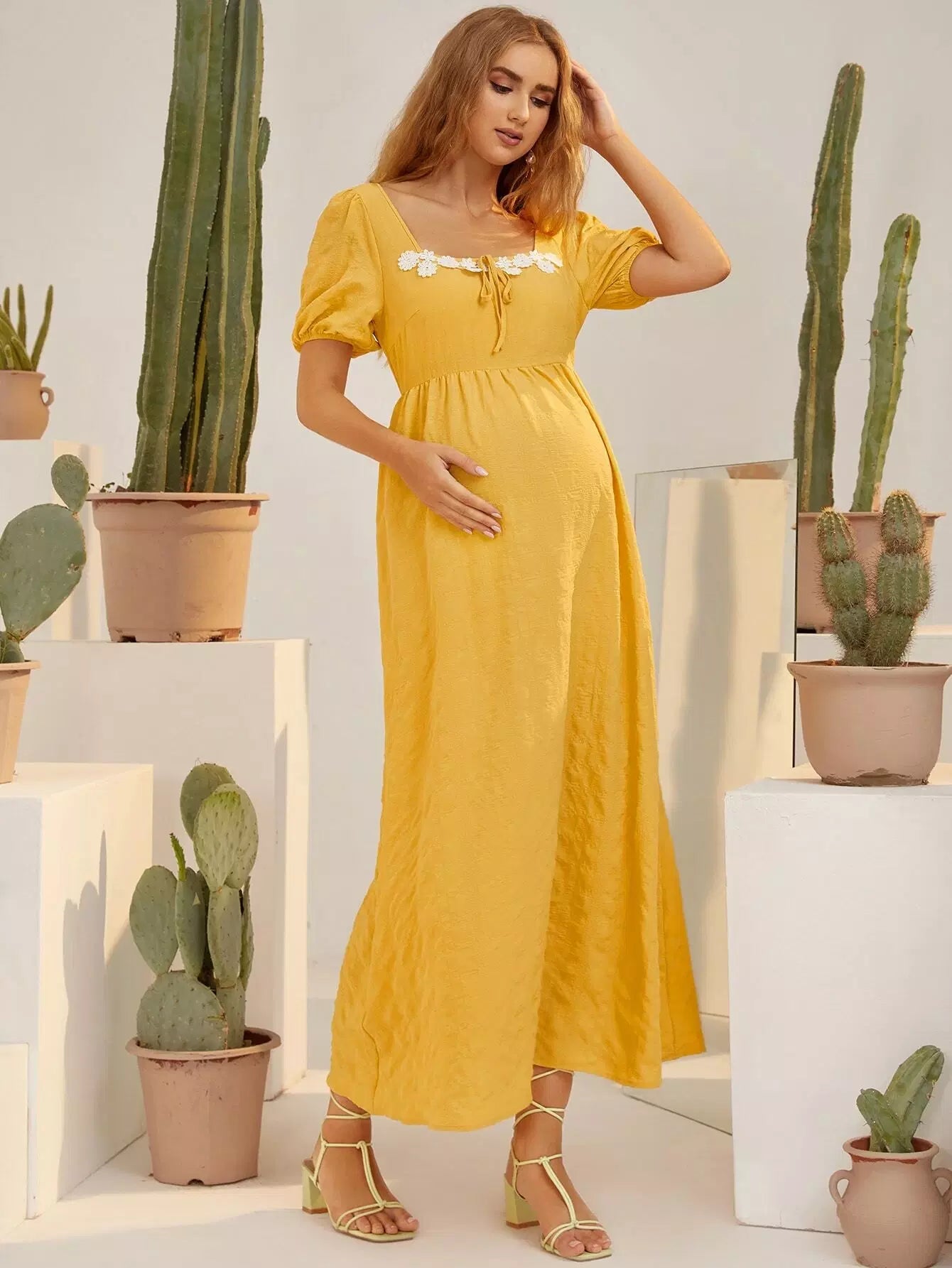 فستان بأكمام منتفخة من الدانتيل بأربطة أمامية للحوامل