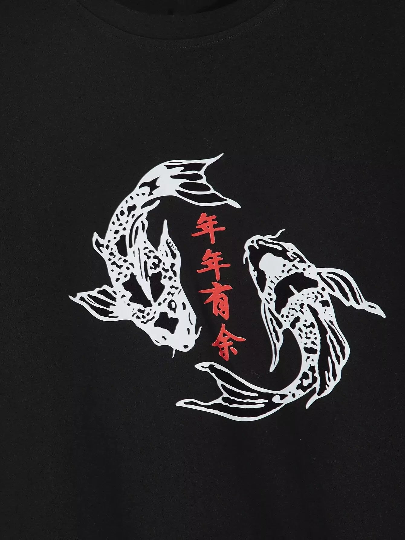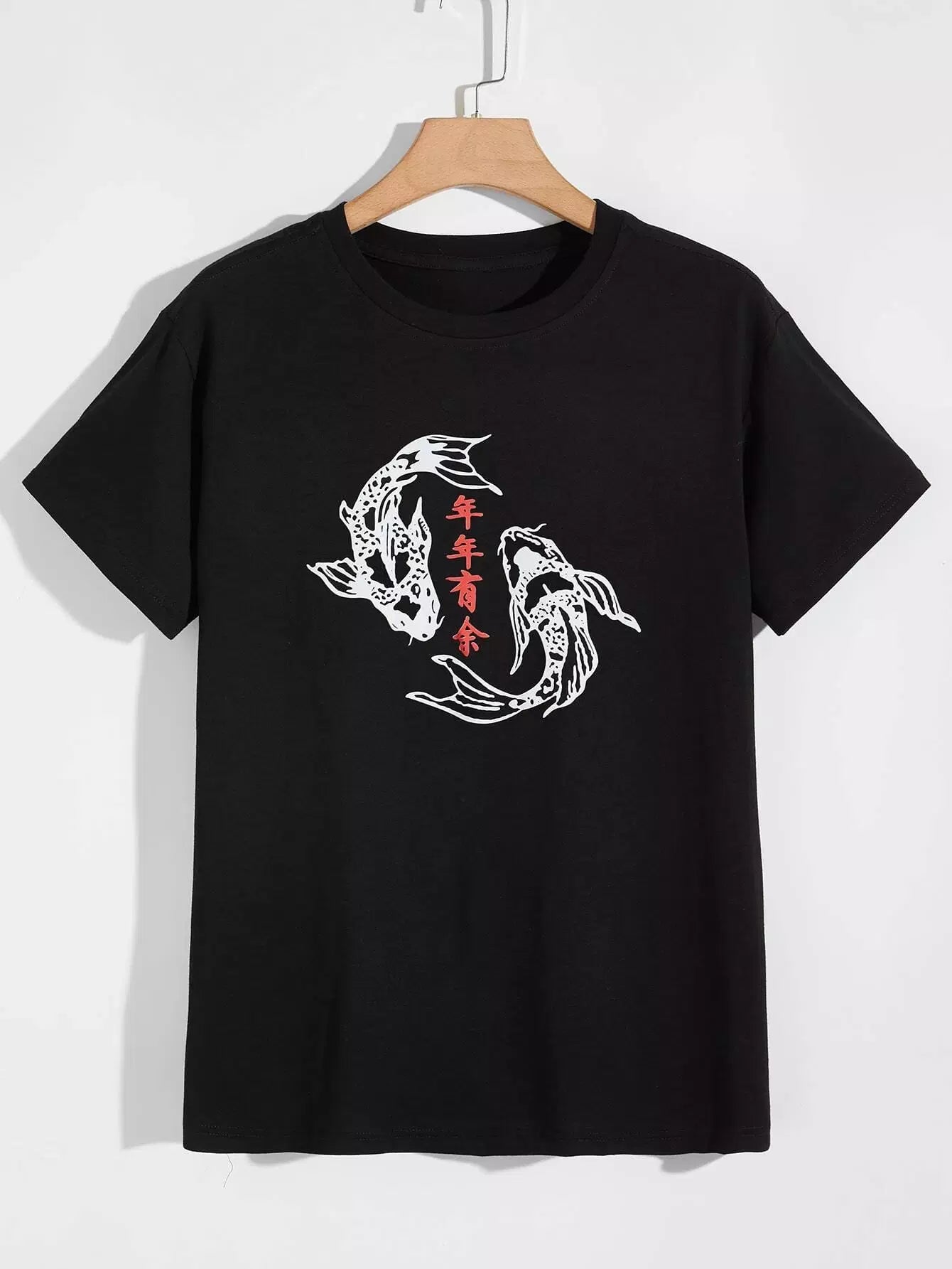 الرجال - تي شيرت رجالي برسومات الحروف الصينية والأسماك
