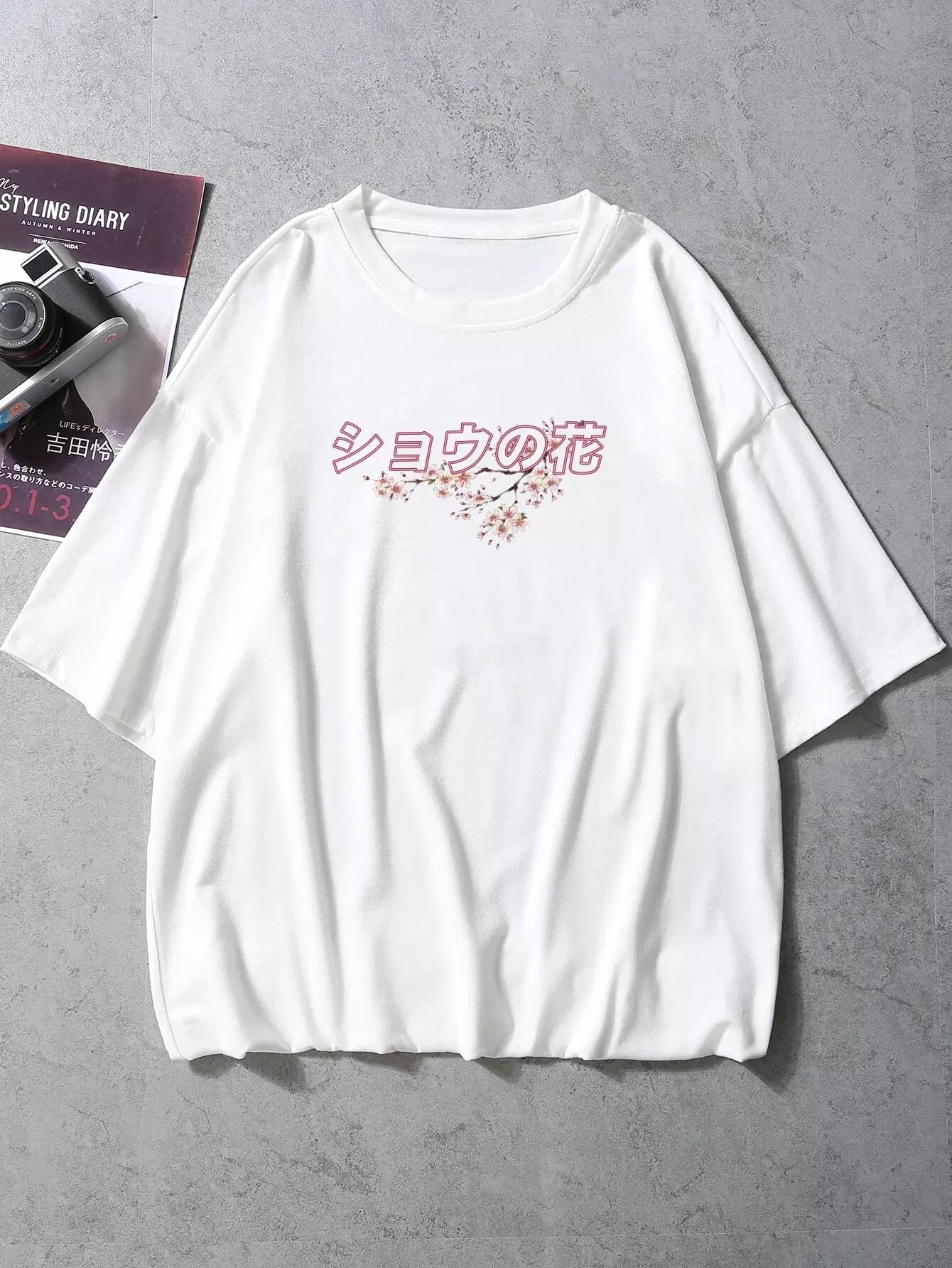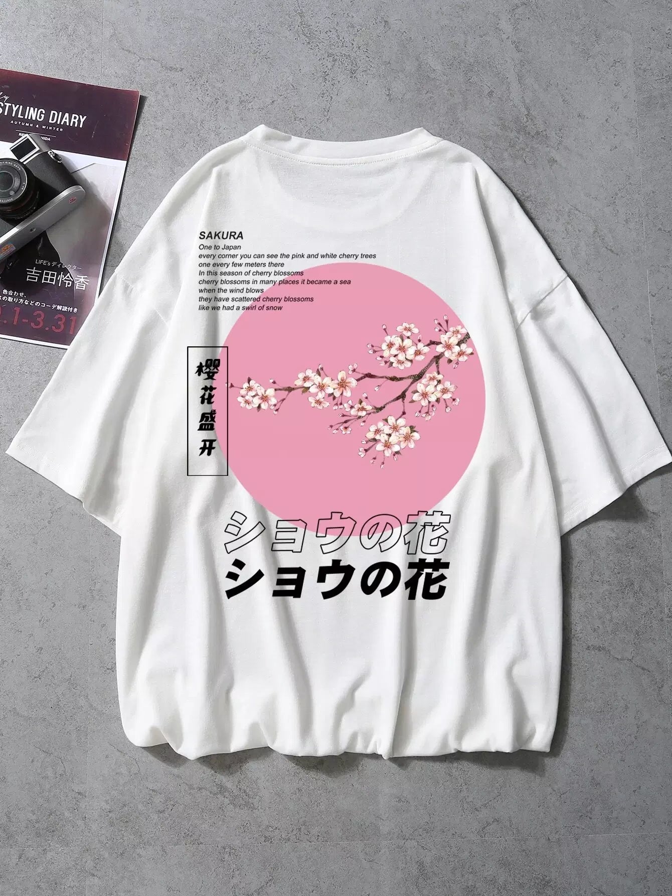 تيشيرت رجالي مطبوع عليه حروف يابانية وزهور