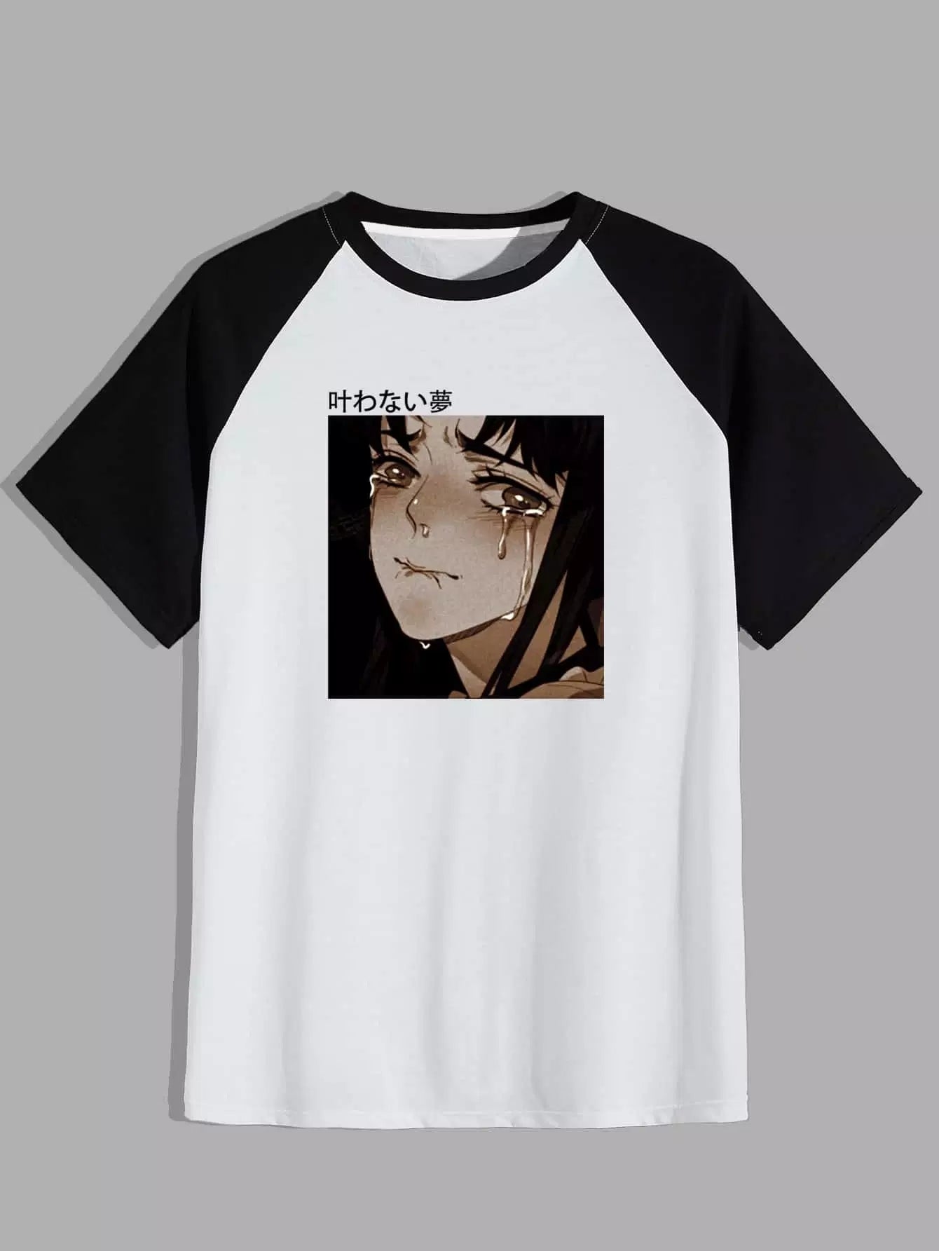 تيشيرت بأكمام راجلان بأحرف يابانية ورسومات كرتونية للرجال