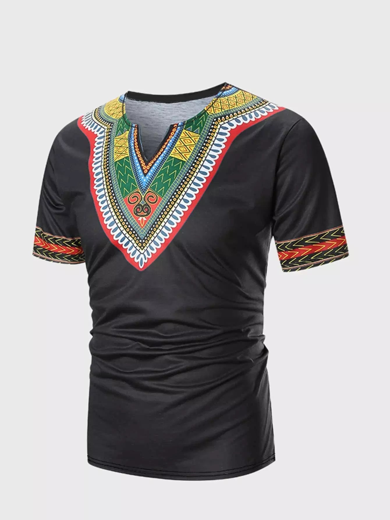تي شيرت رجالي مطبوع عليه طبعة قبلية برقبة محزّمة