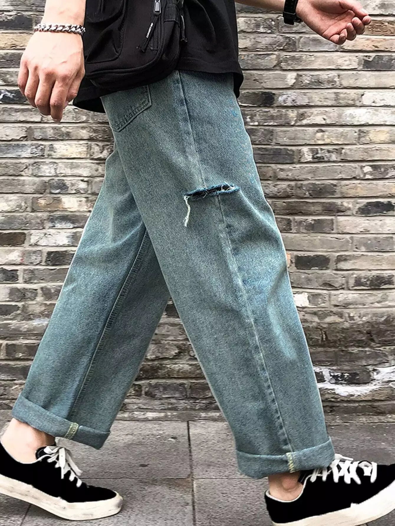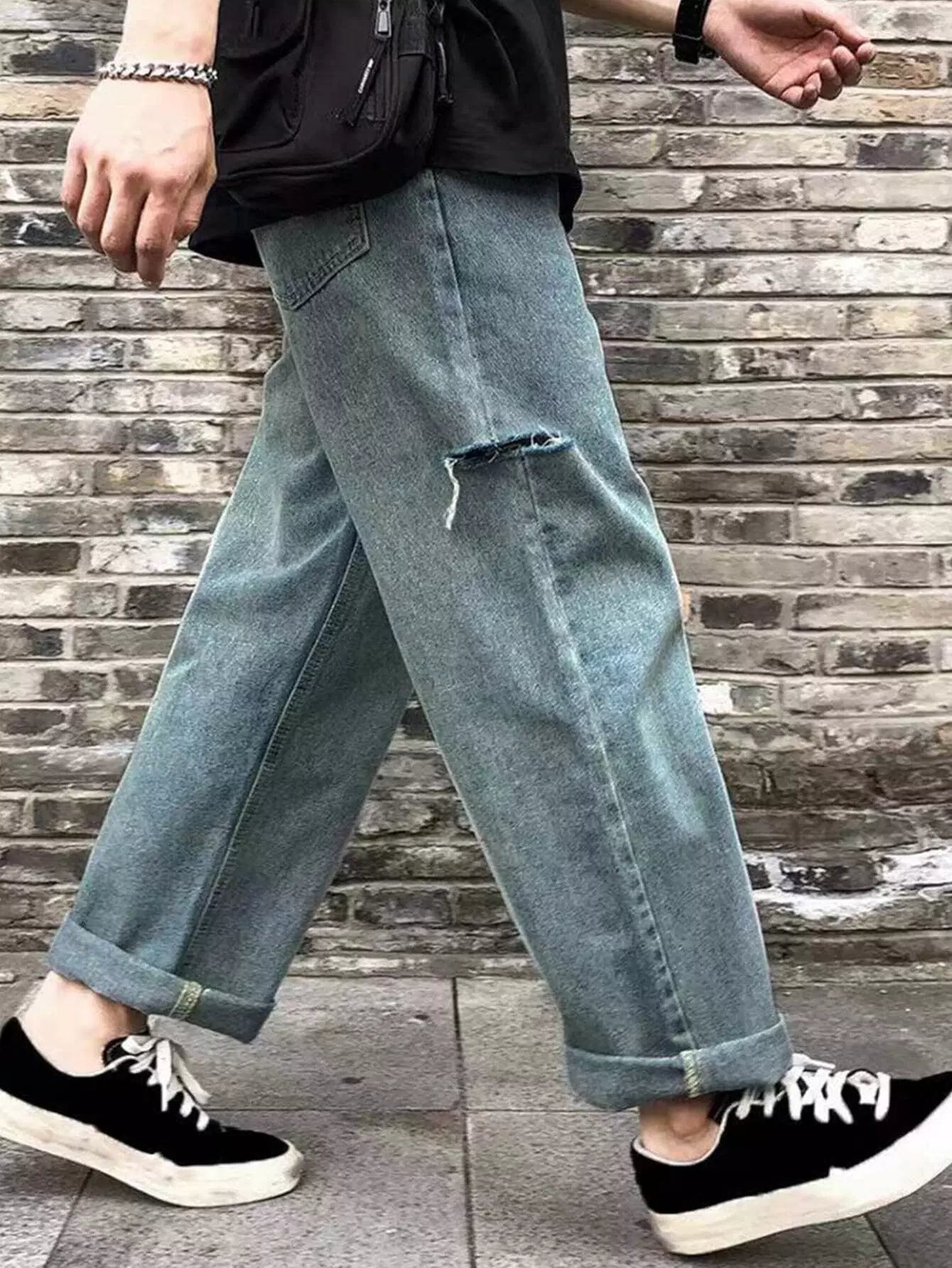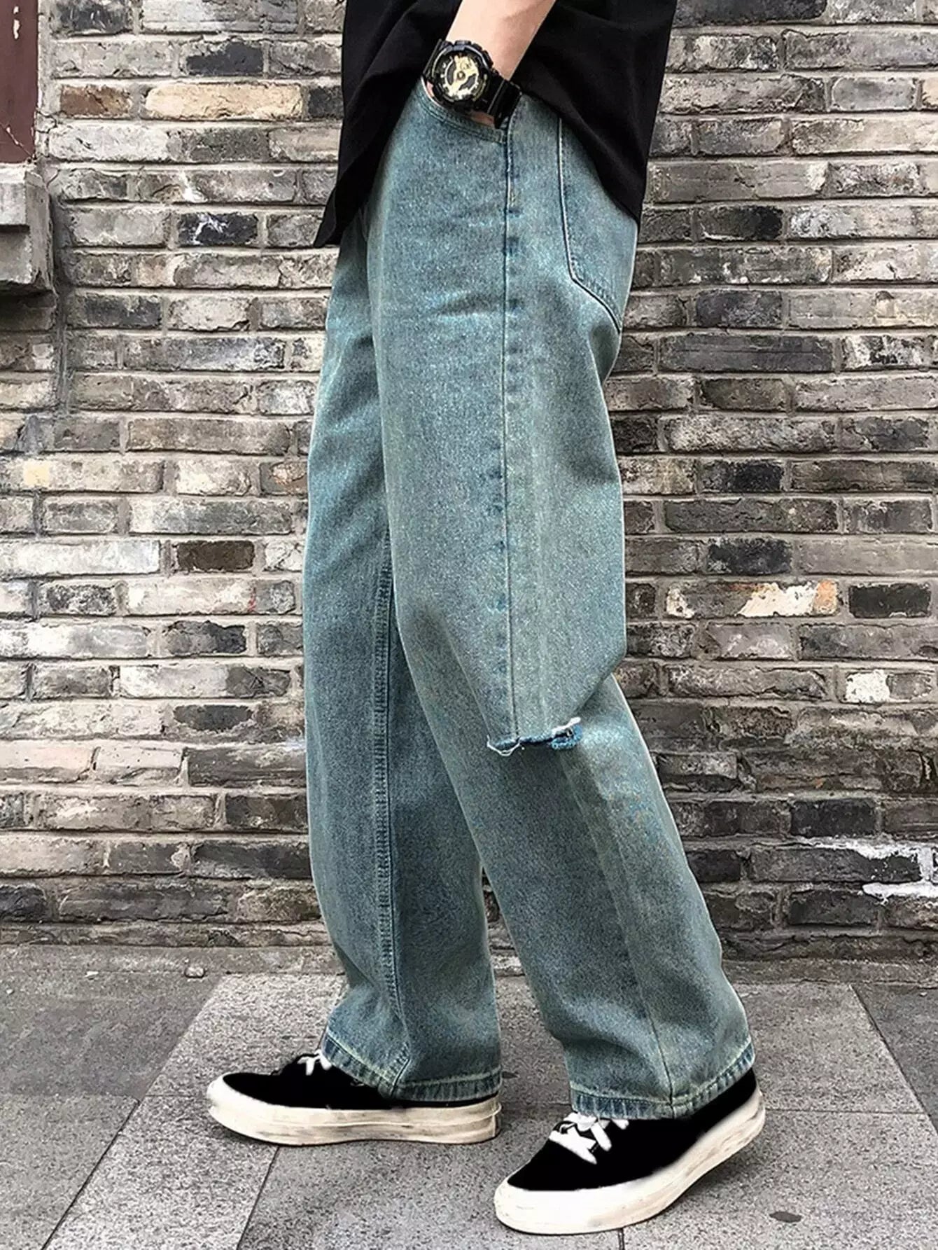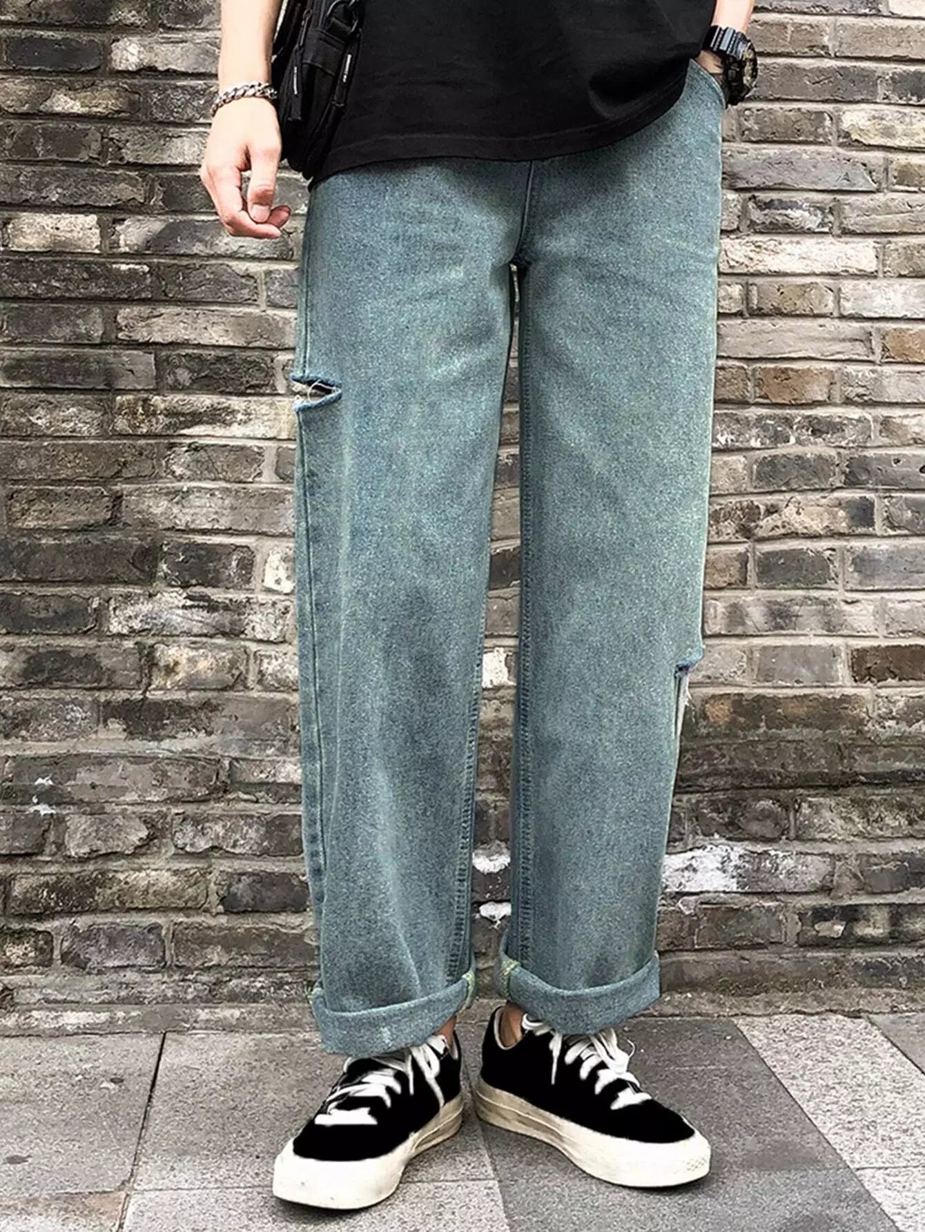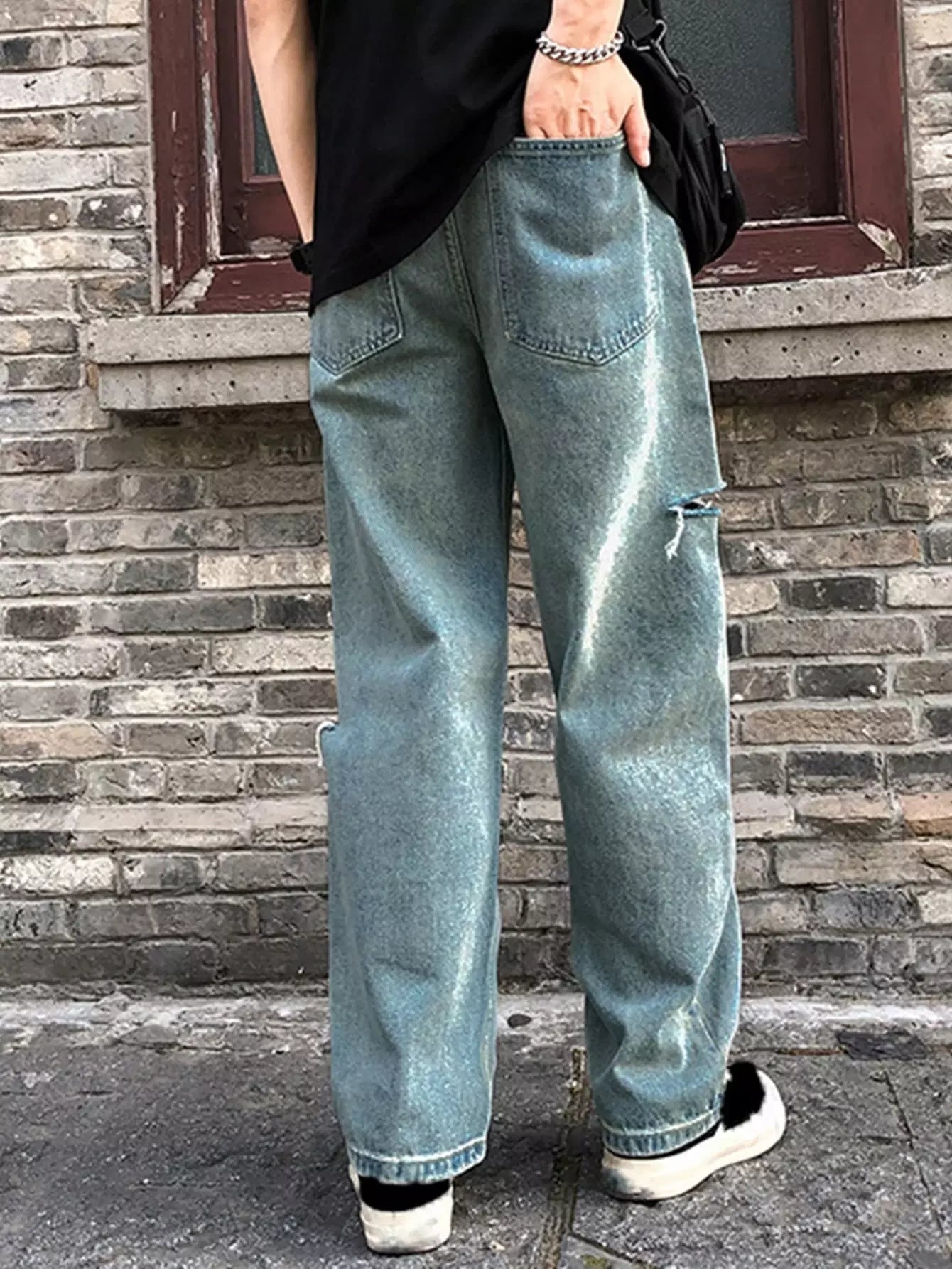 بنطلون جينز رجالي ممزق بجيوب مرقع بساق مستقيمة