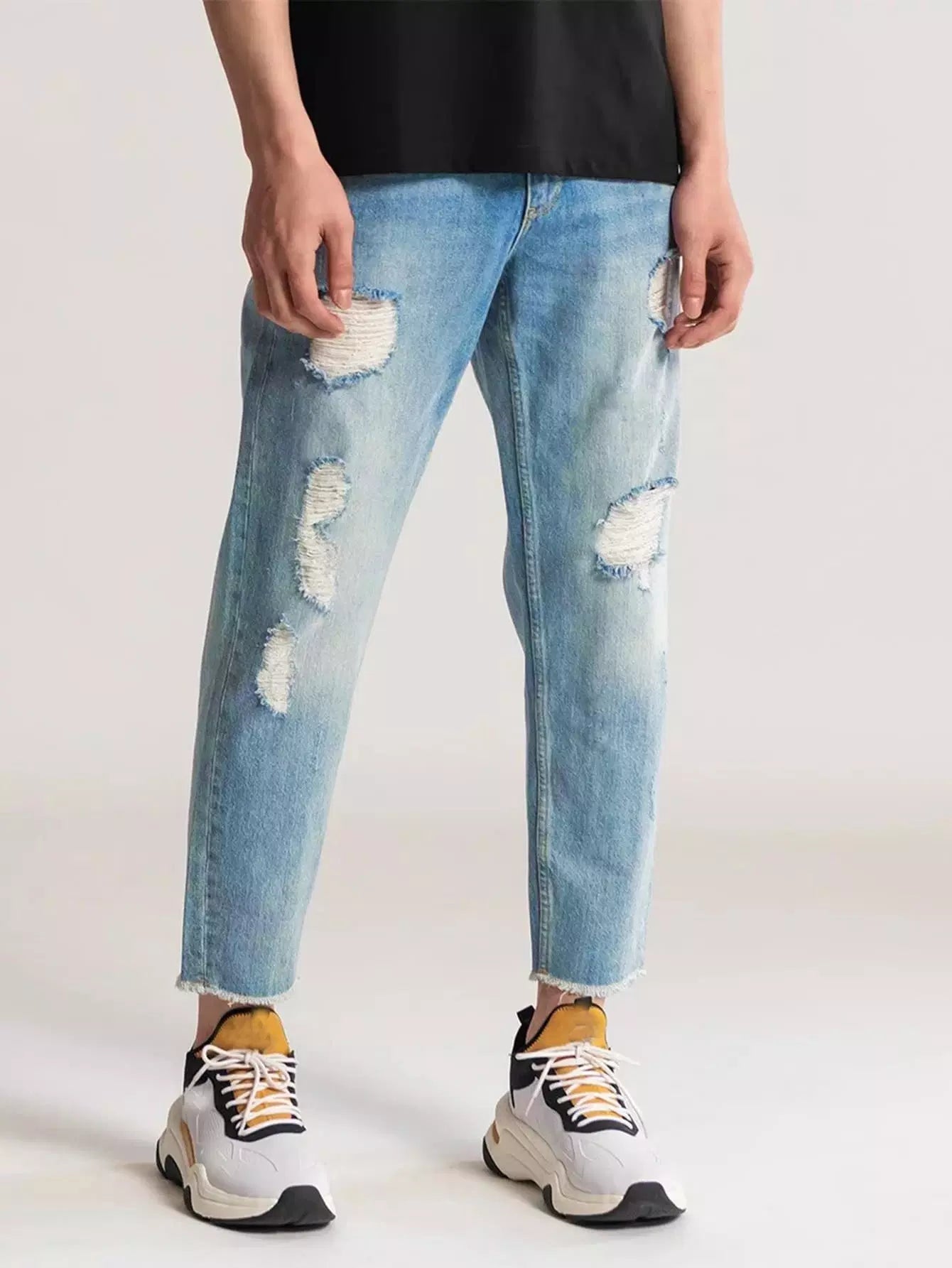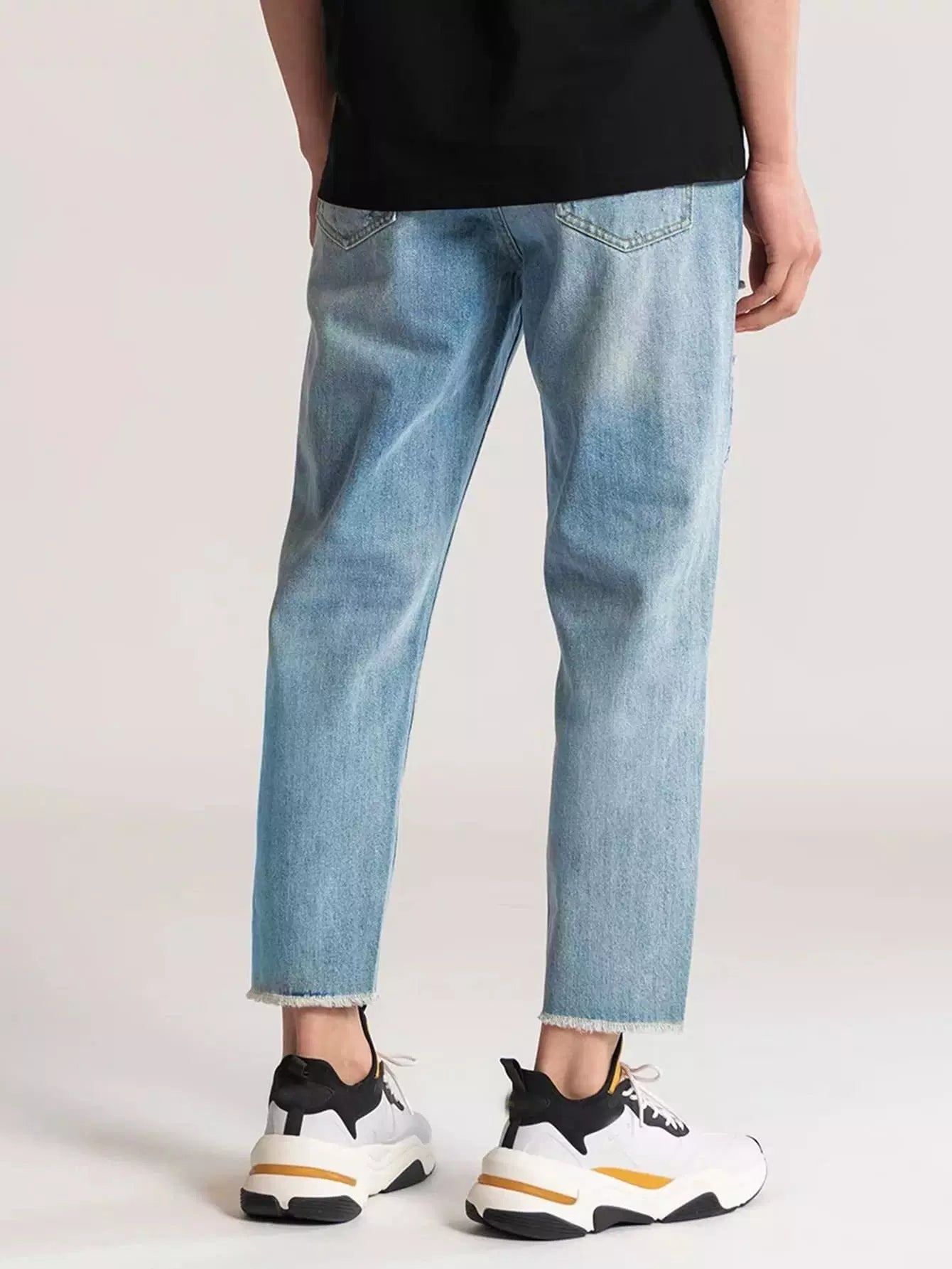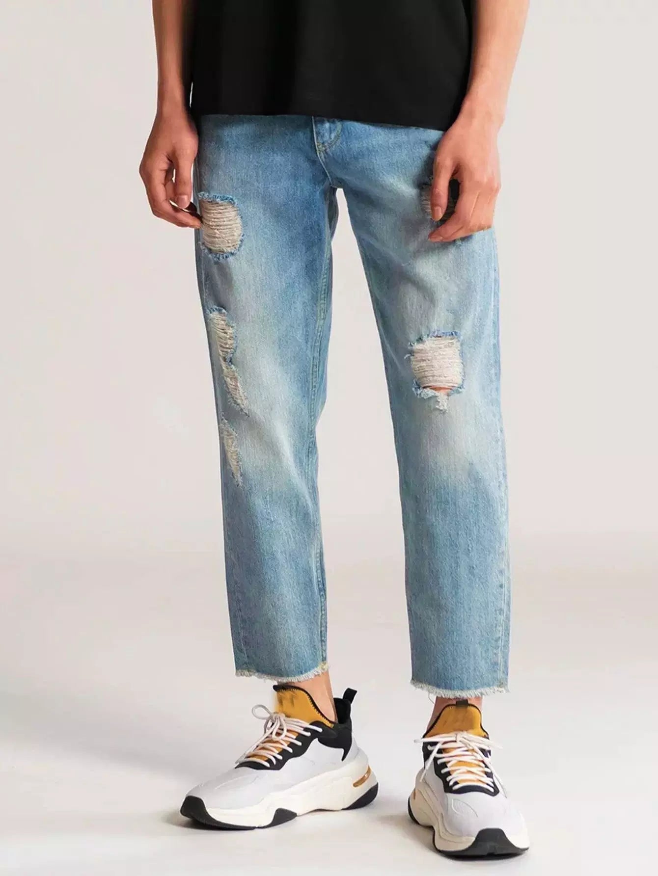 بنطال جينز رجالي ممزق بحافة خفيفة، مستقيم الساق مستقيم الساقين