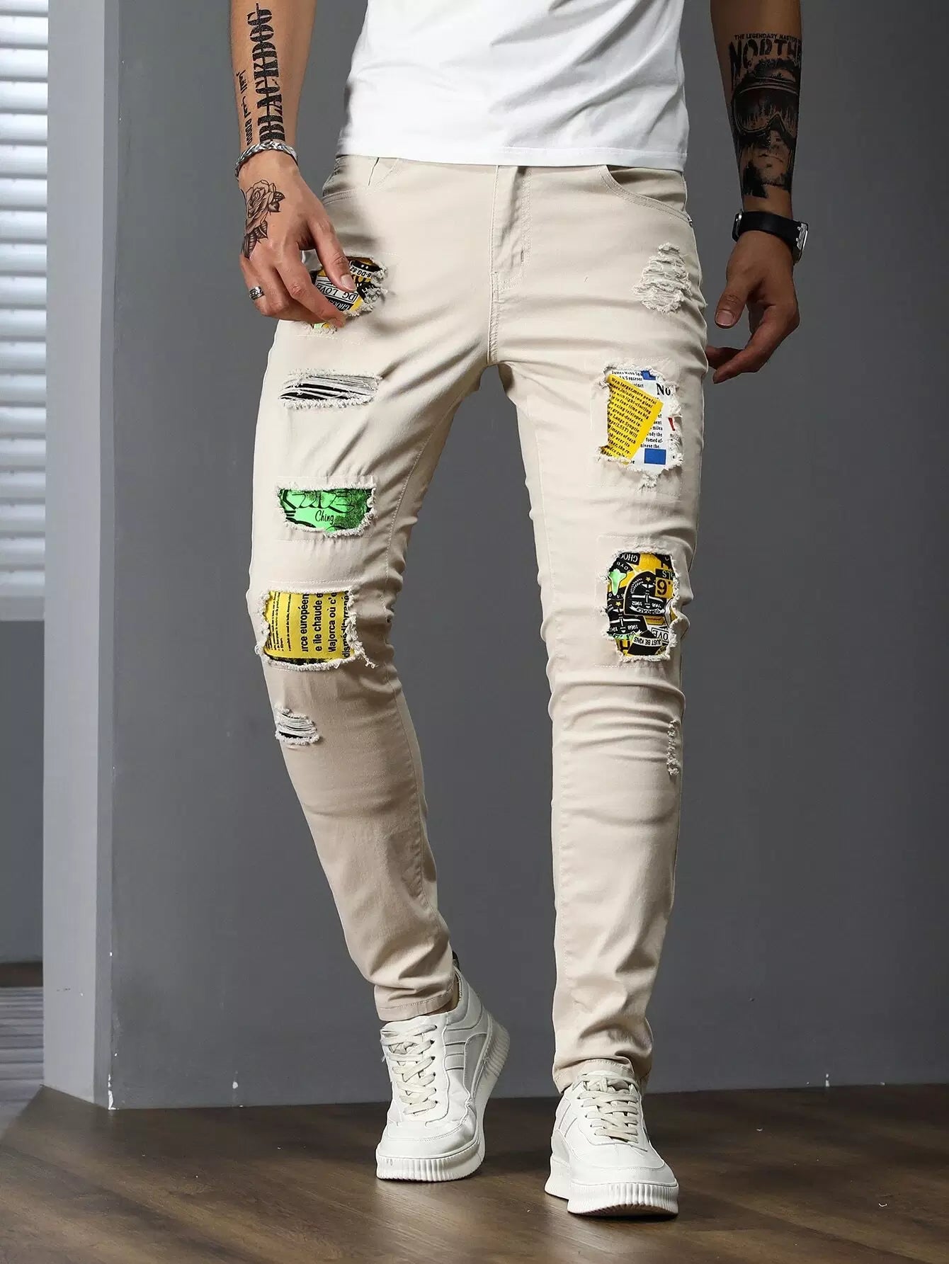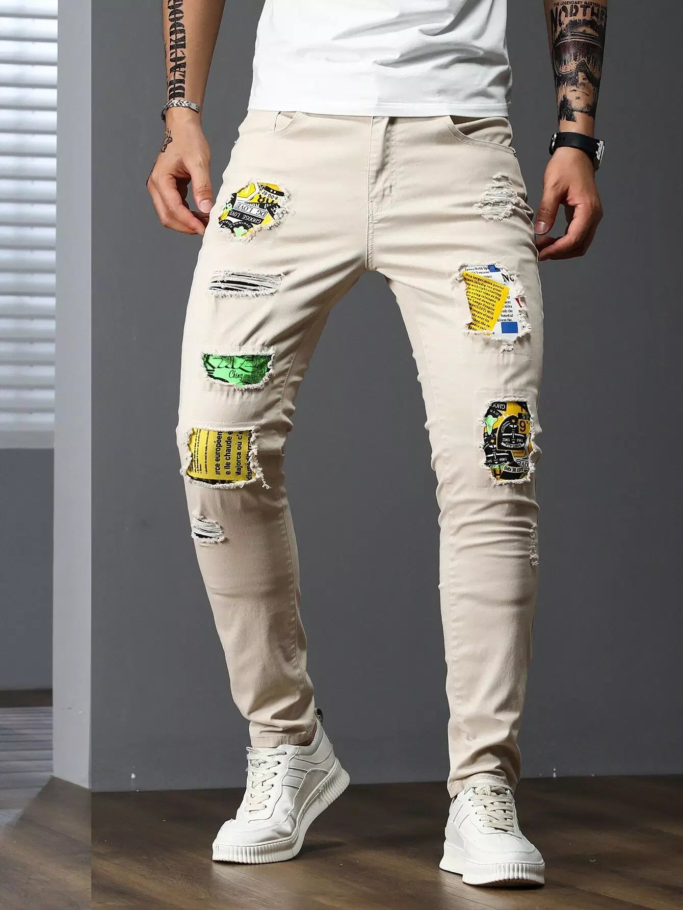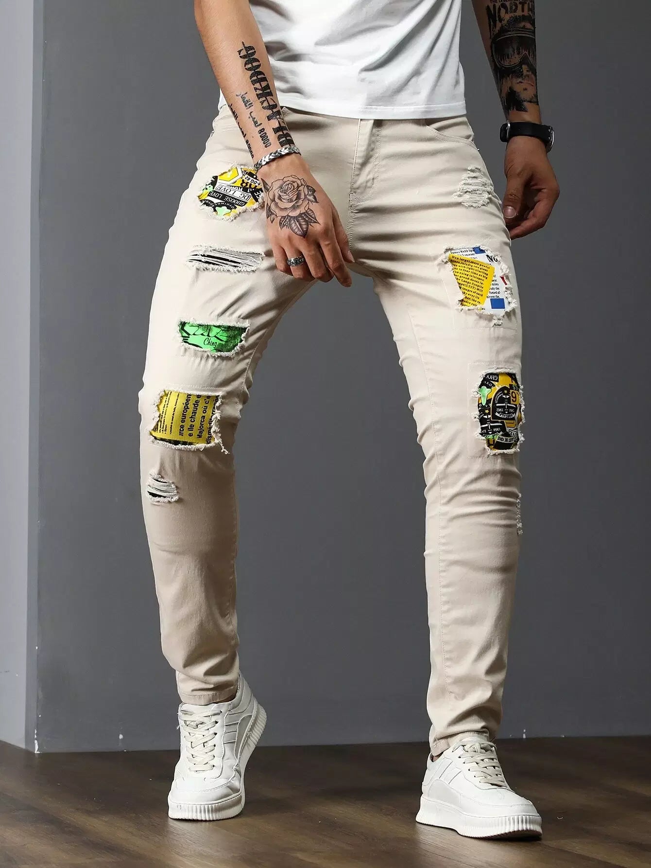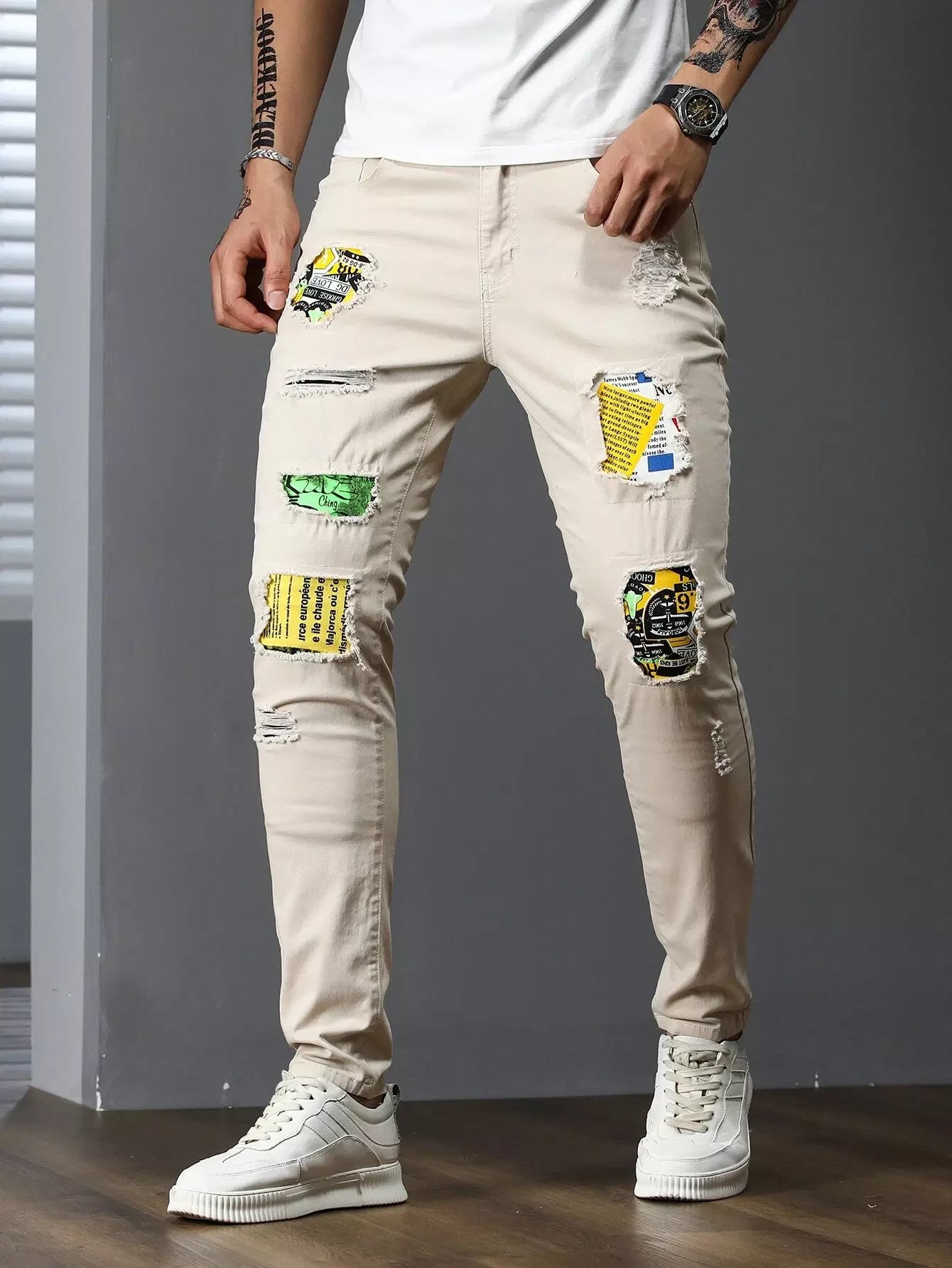بنطلون جينز ممزق بشعار شعار جرافيك رجالي بلوحة متباينة
