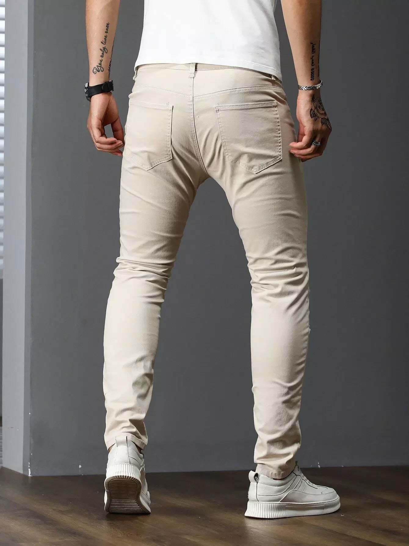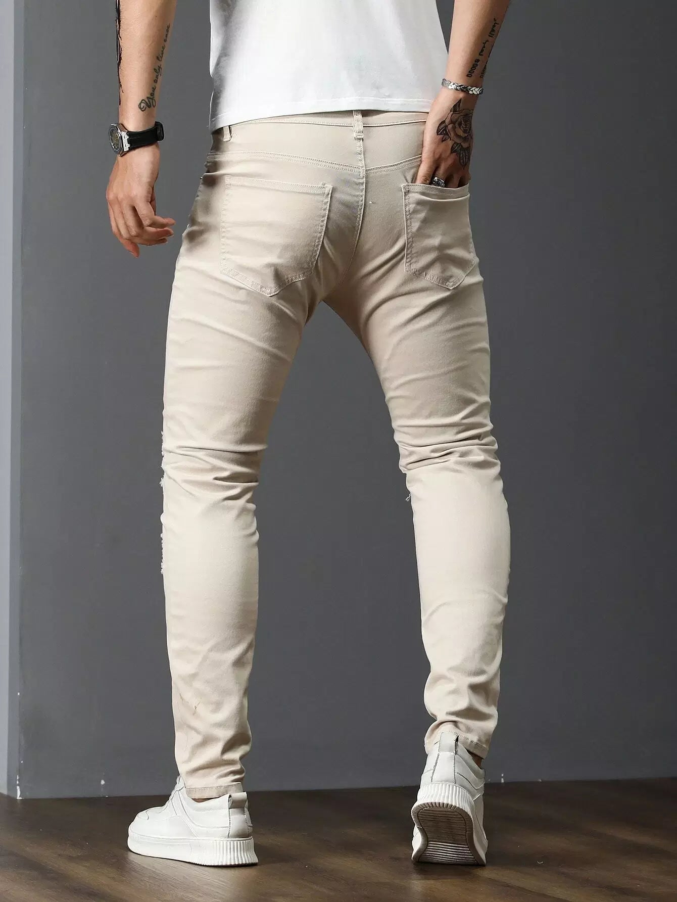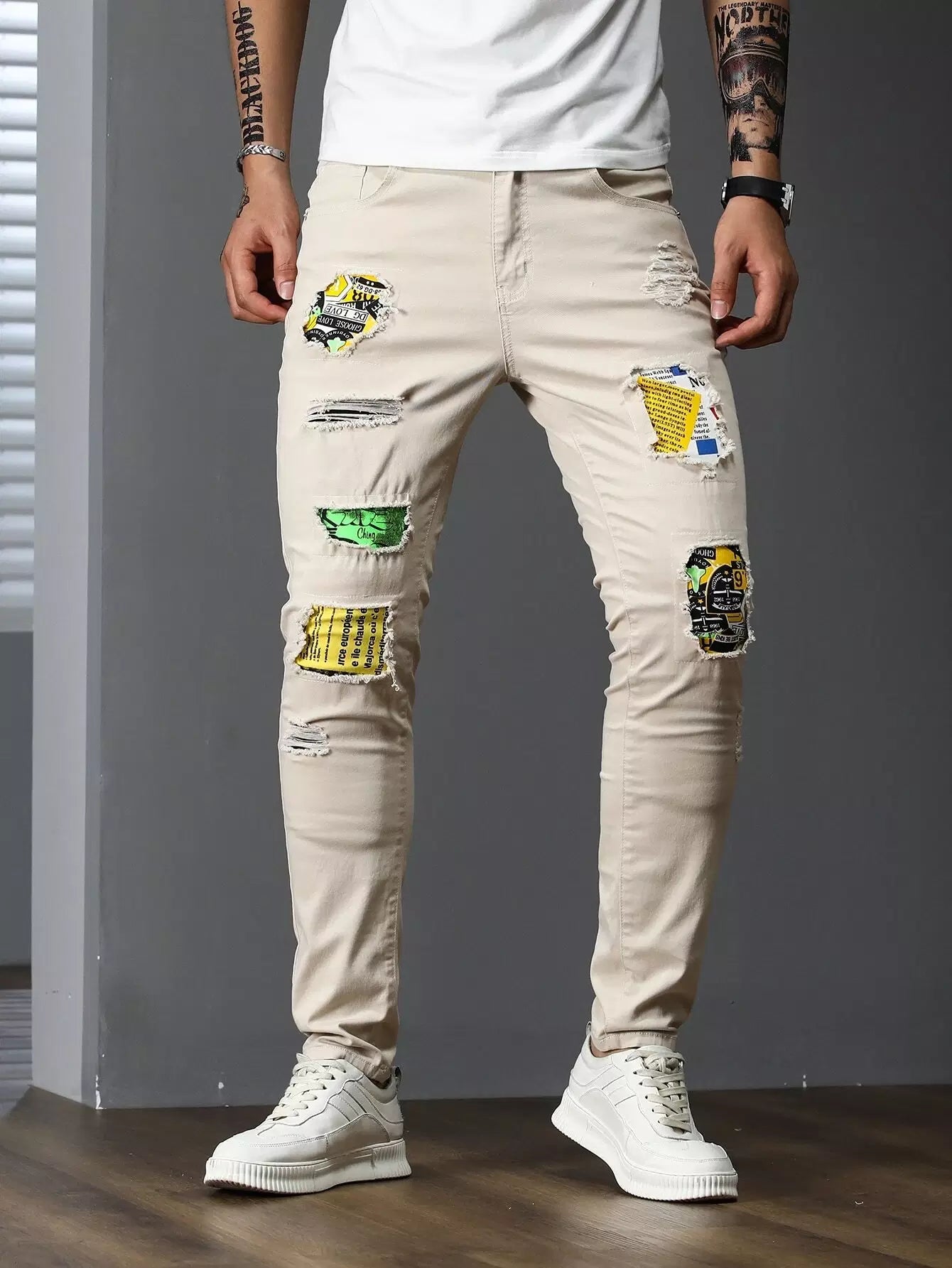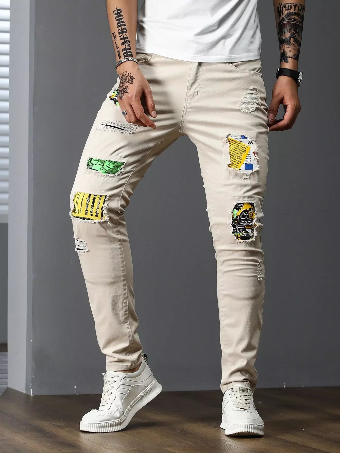 بنطلون جينز ممزق بشعار شعار جرافيك رجالي بلوحة متباينة