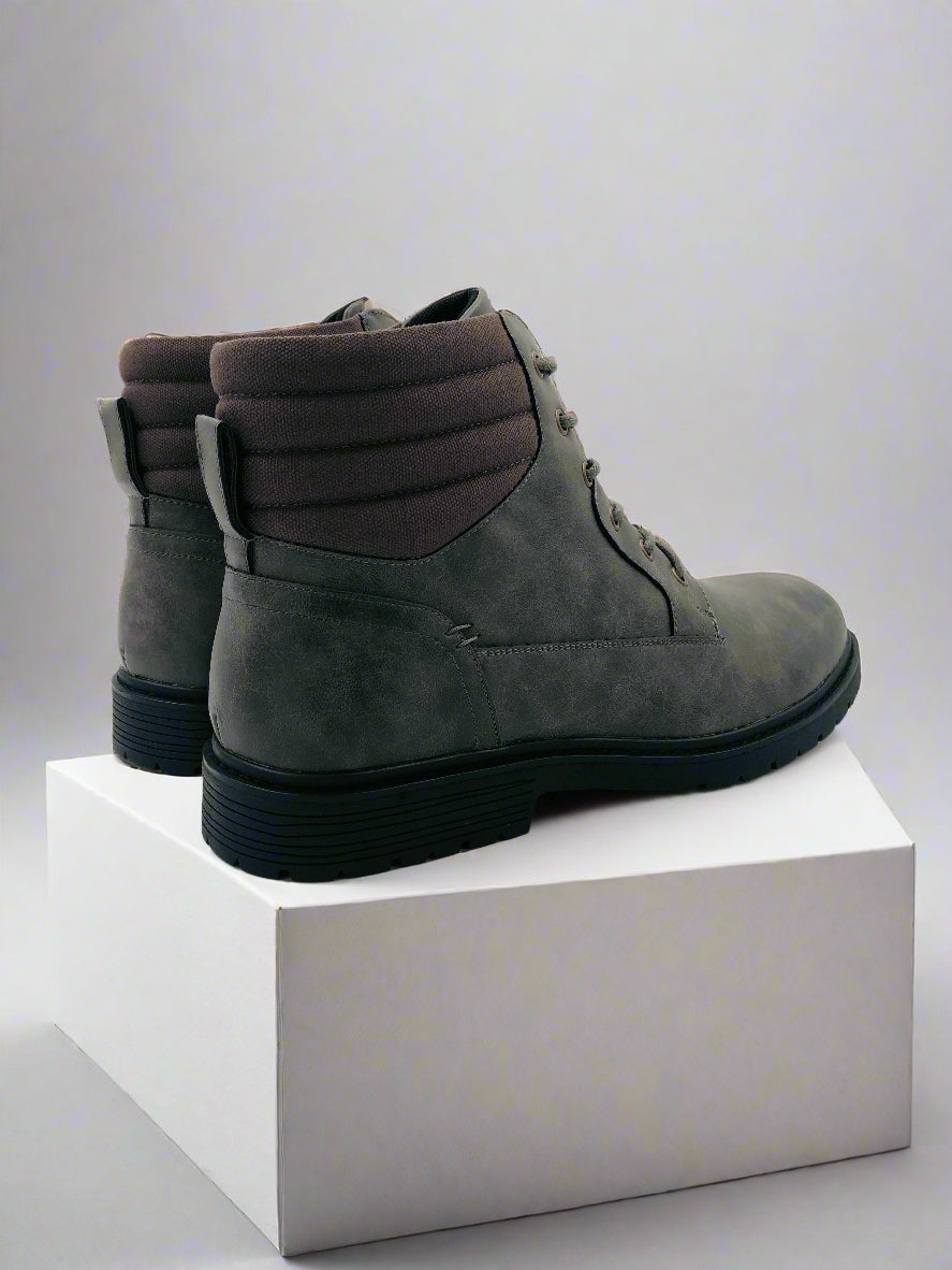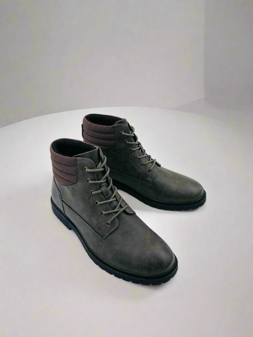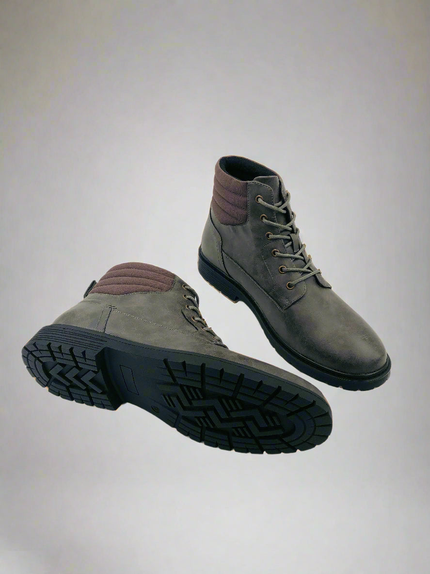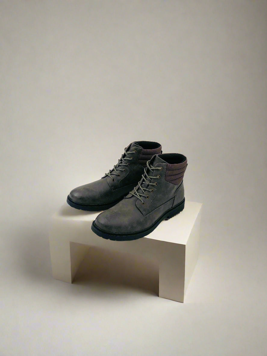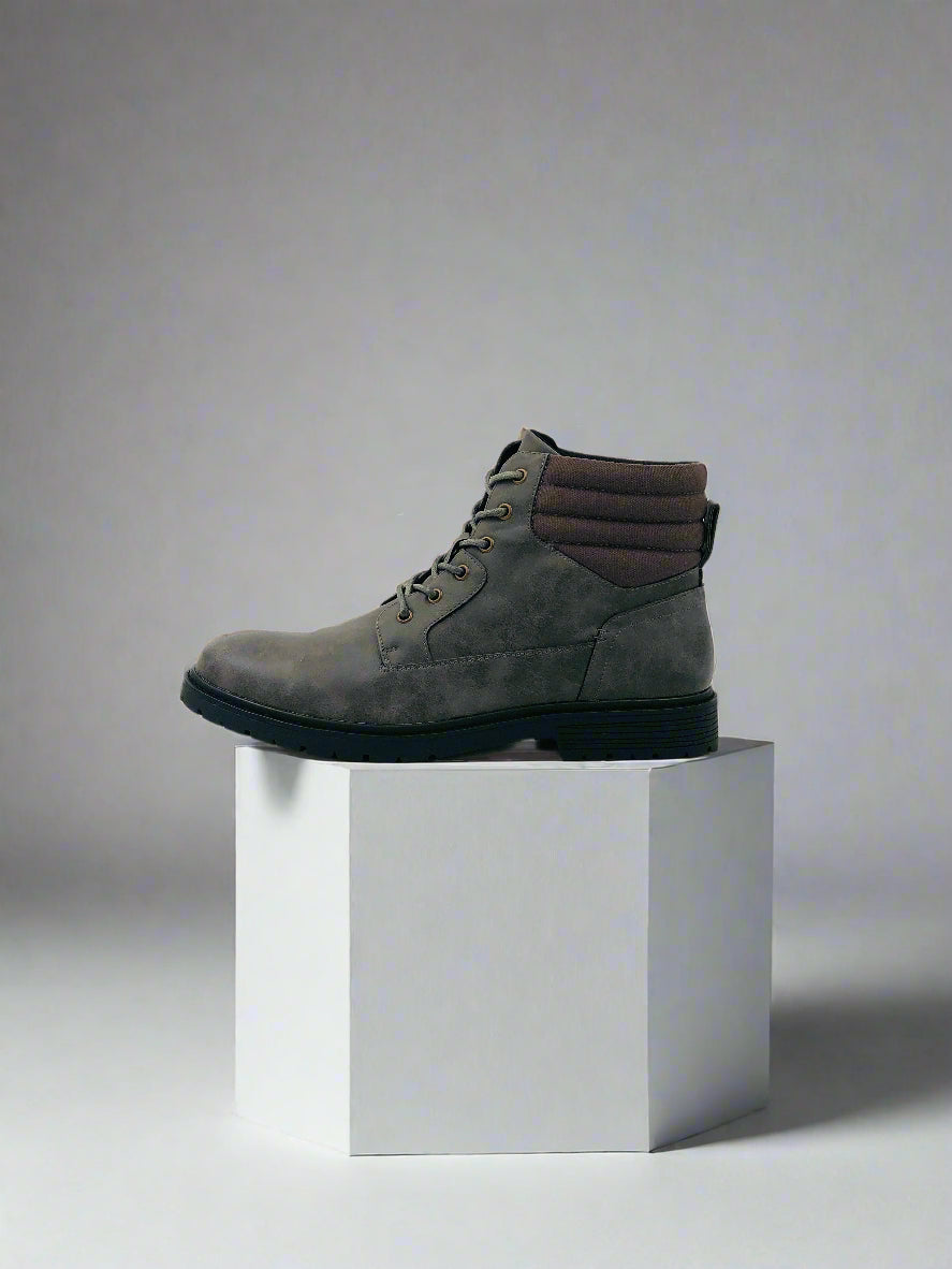 جزمة رجالية باللون الرمادي بارتفاع منخفض وأربطة قابلة للتعديل، مثالية للإطلالات الكاجوال في فصلي الشتاء والخريف.