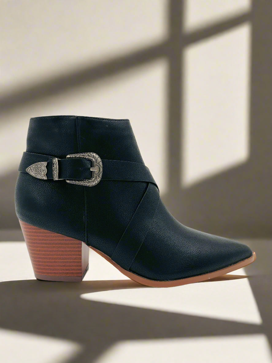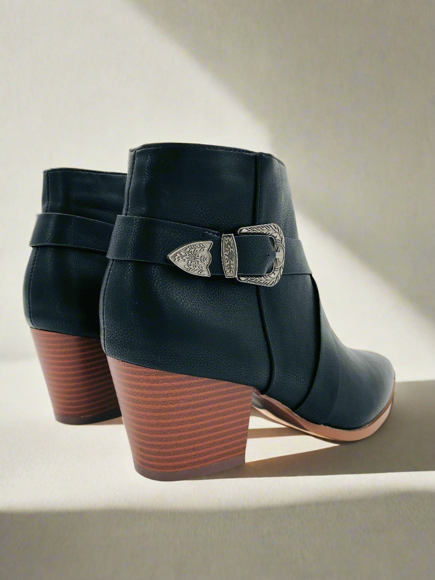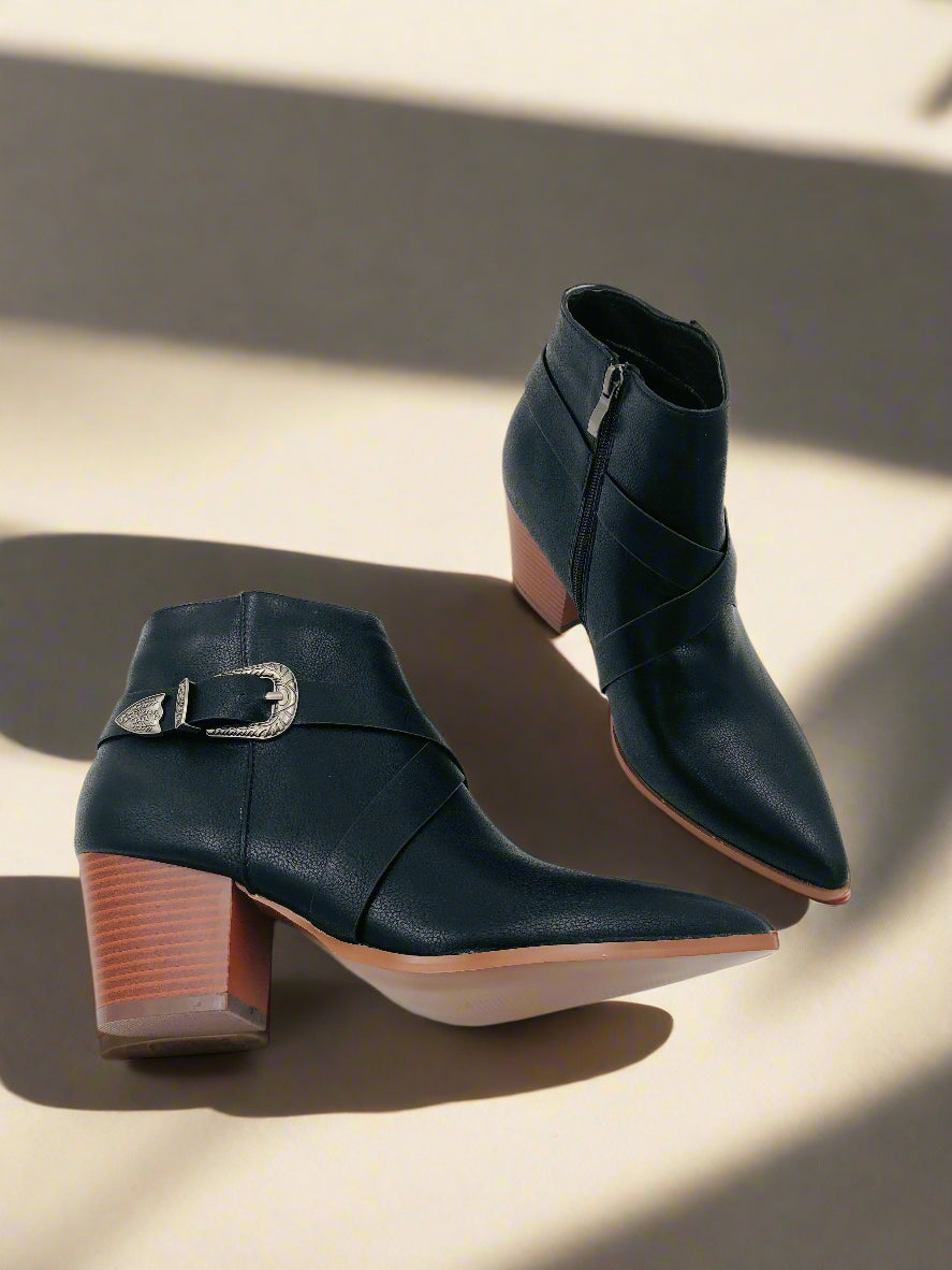 جزمة كاحل باللون الأسود بكعب متوسط مع مشبك فضي