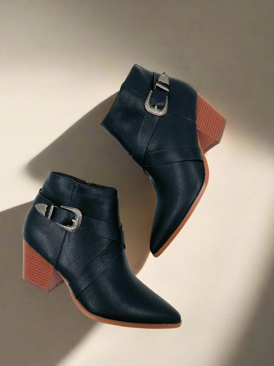 جزمة كاحل باللون الأسود ذات مظهر أنثوي، مع كعب بني متوسط الارتفاع وحزام حول الكاحل مزخرف بمشبك فضي أنيق.