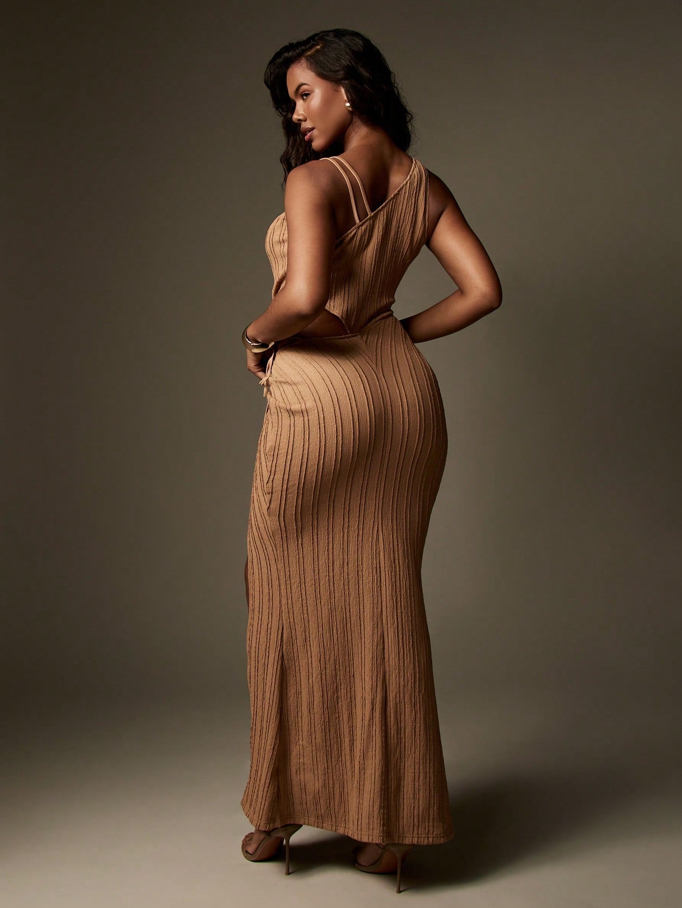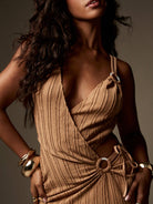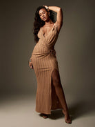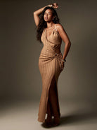 women MISSGUIDED Ribbed Knit Maxi Dress With Side Slit Draped Wrap Design Ring Hardware Detail Sleeveless Floor Length Bodycon Evening Party Special Occasion