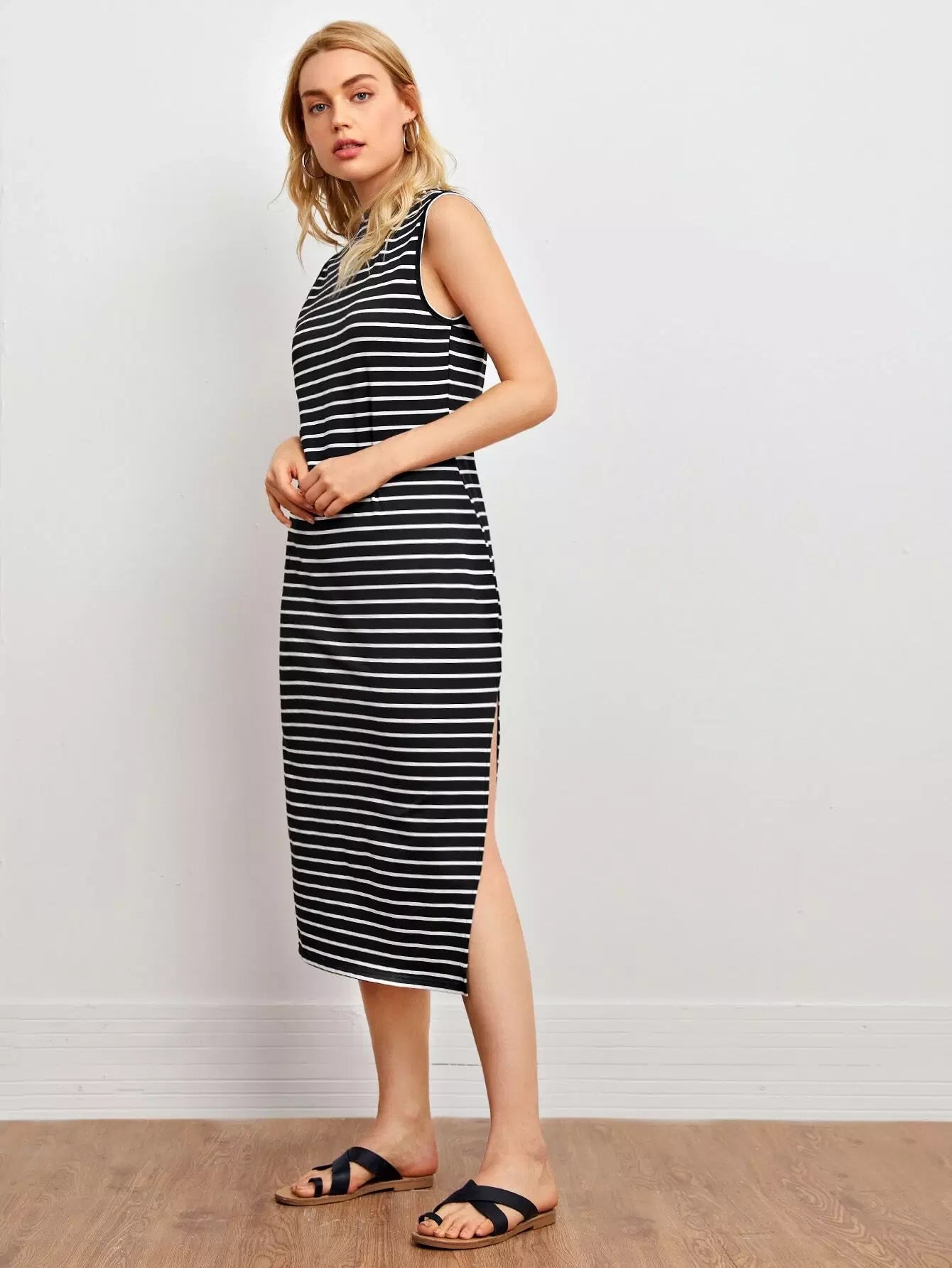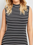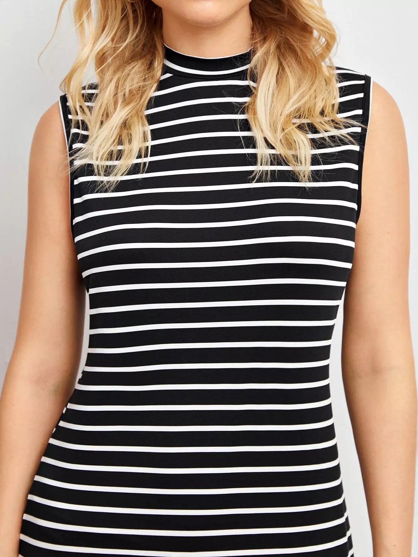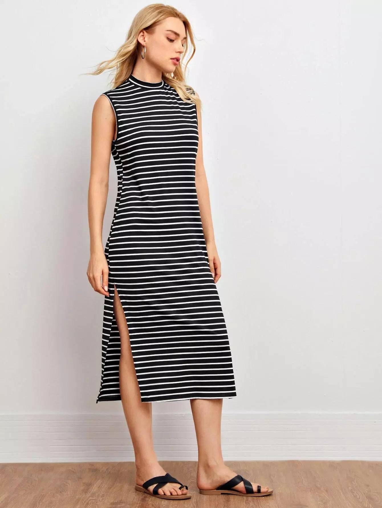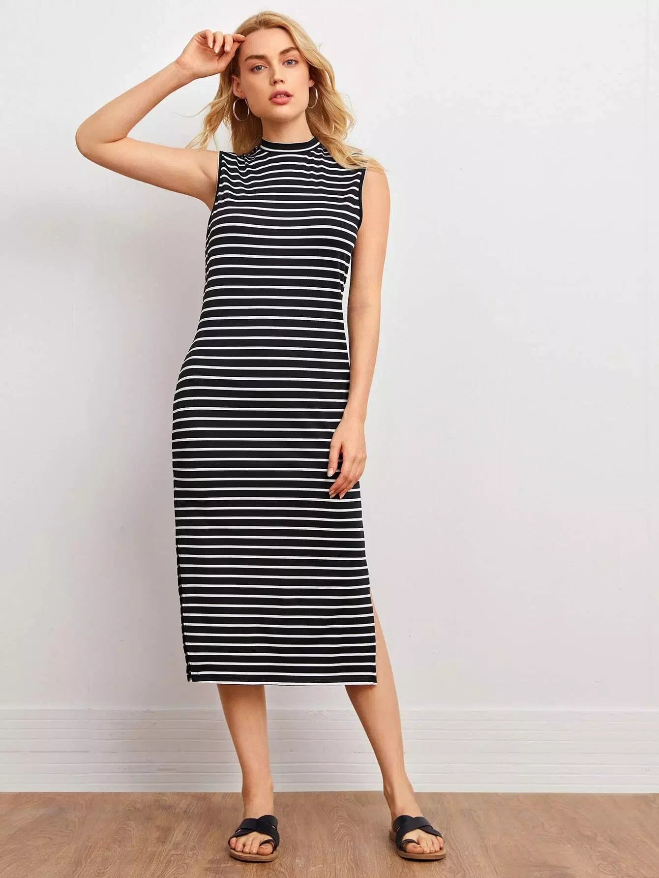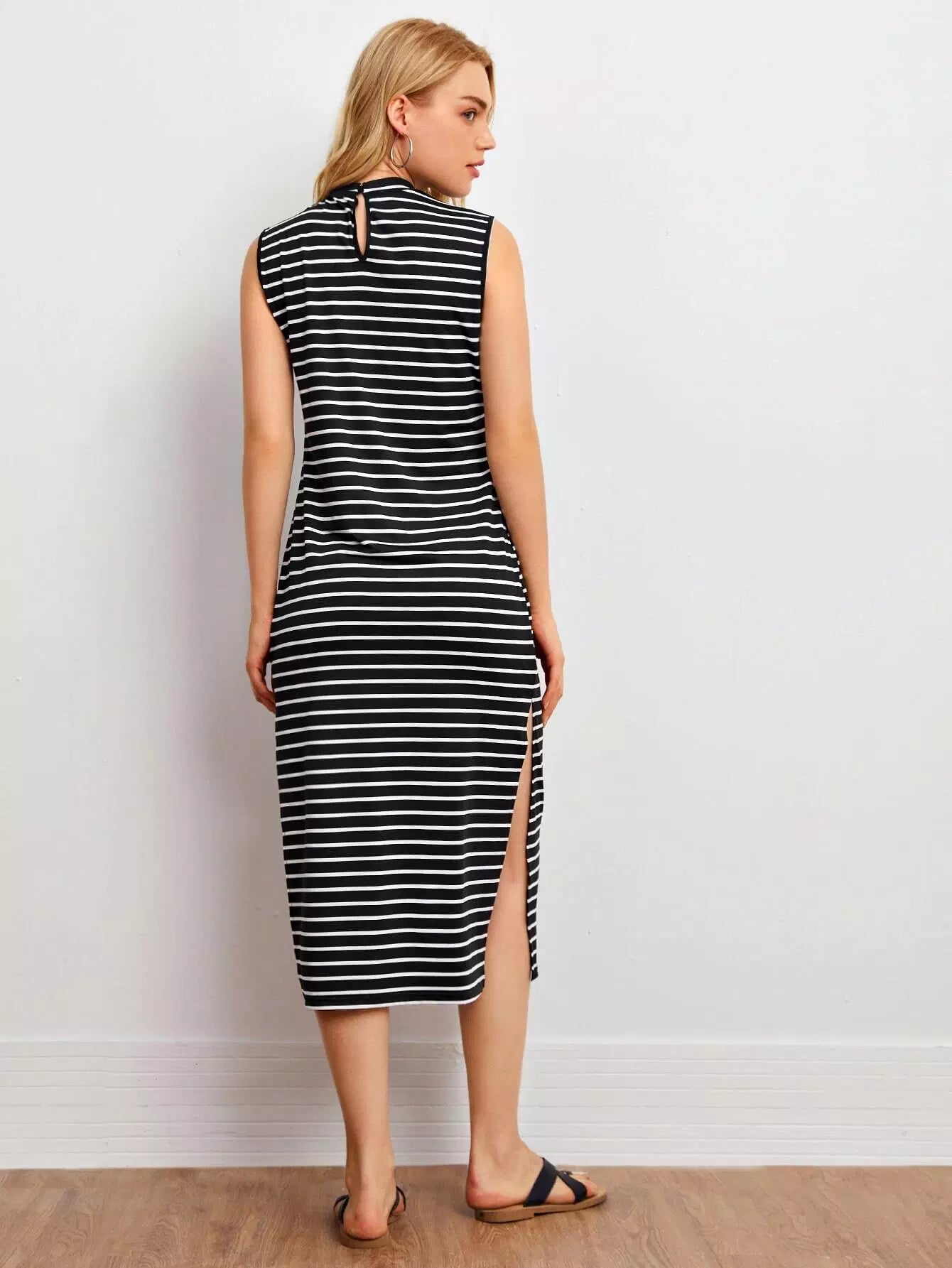 فستان مخطط جانبي برقبة وهمية برقبة منقسمة على الجانبين