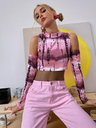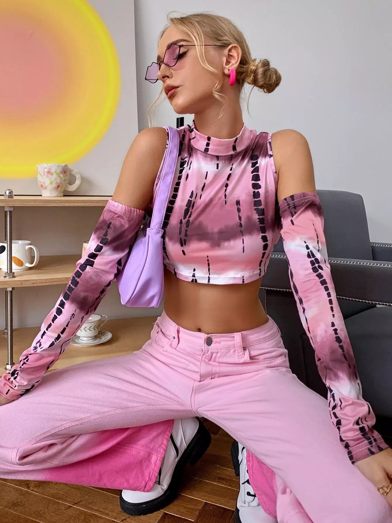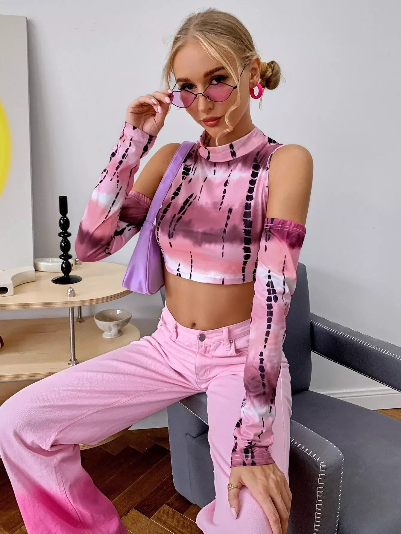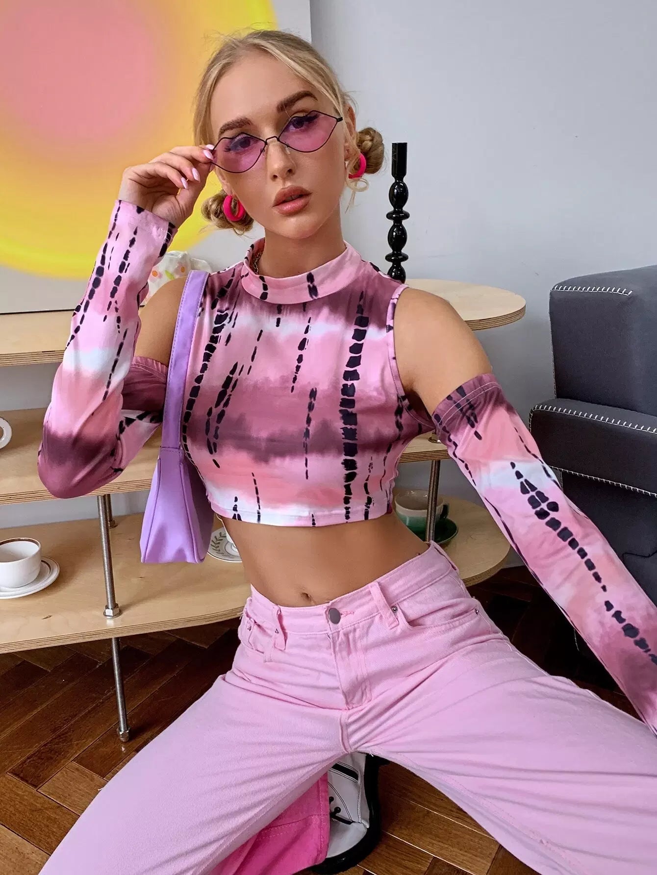 بلوزة قصيرة برقبة وهمية مصبوغة بربطة عنق مصبوغة بربطة عنق مصبوغة على الكتف البارد