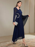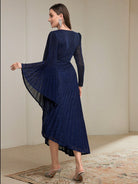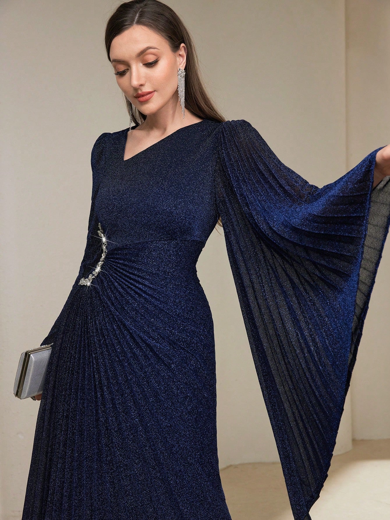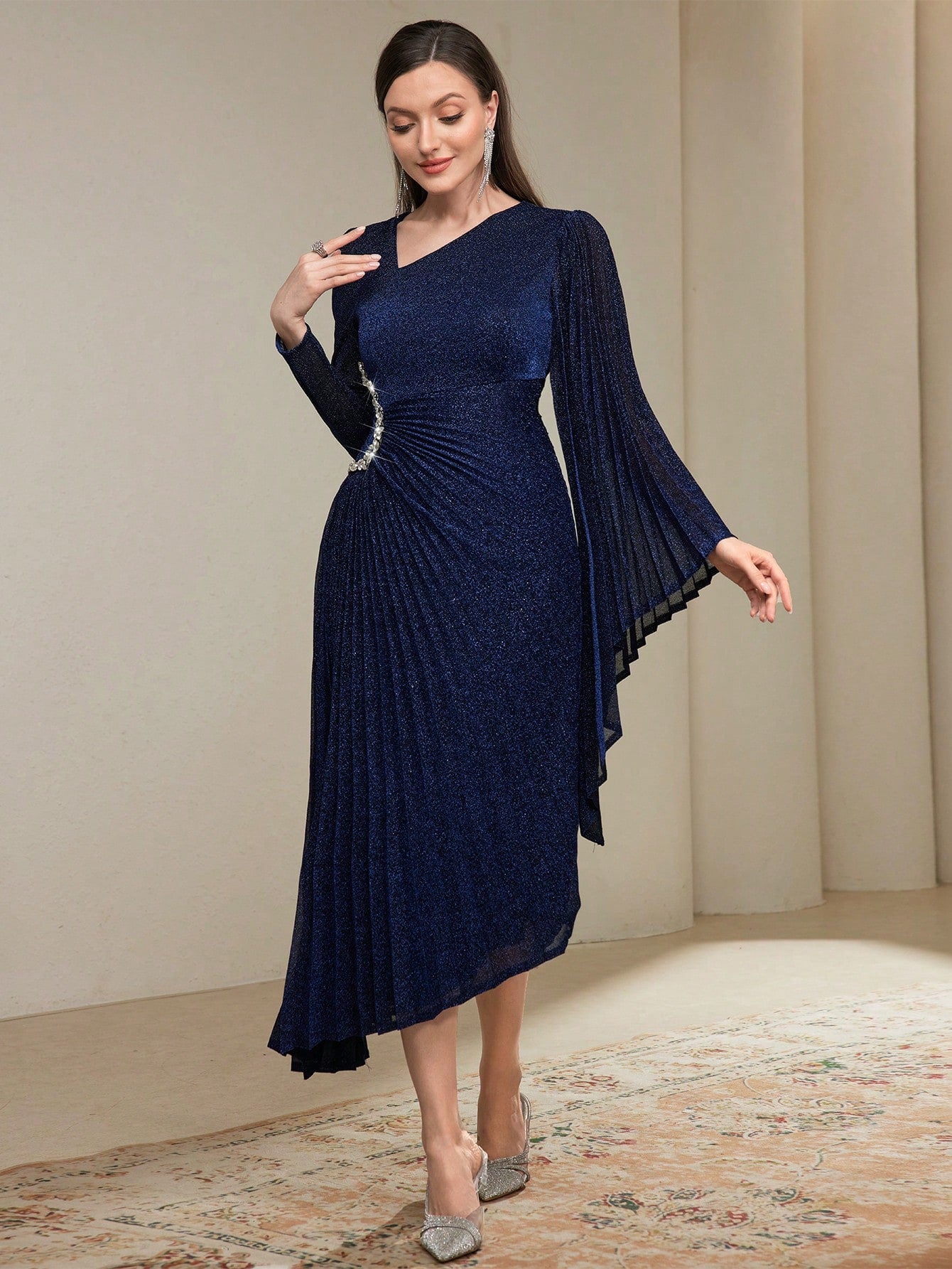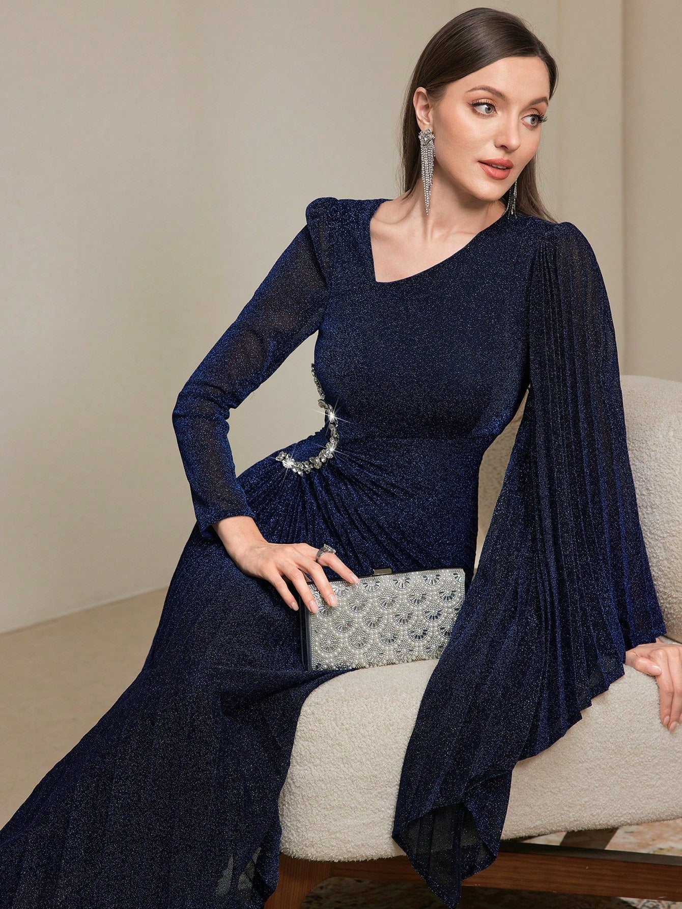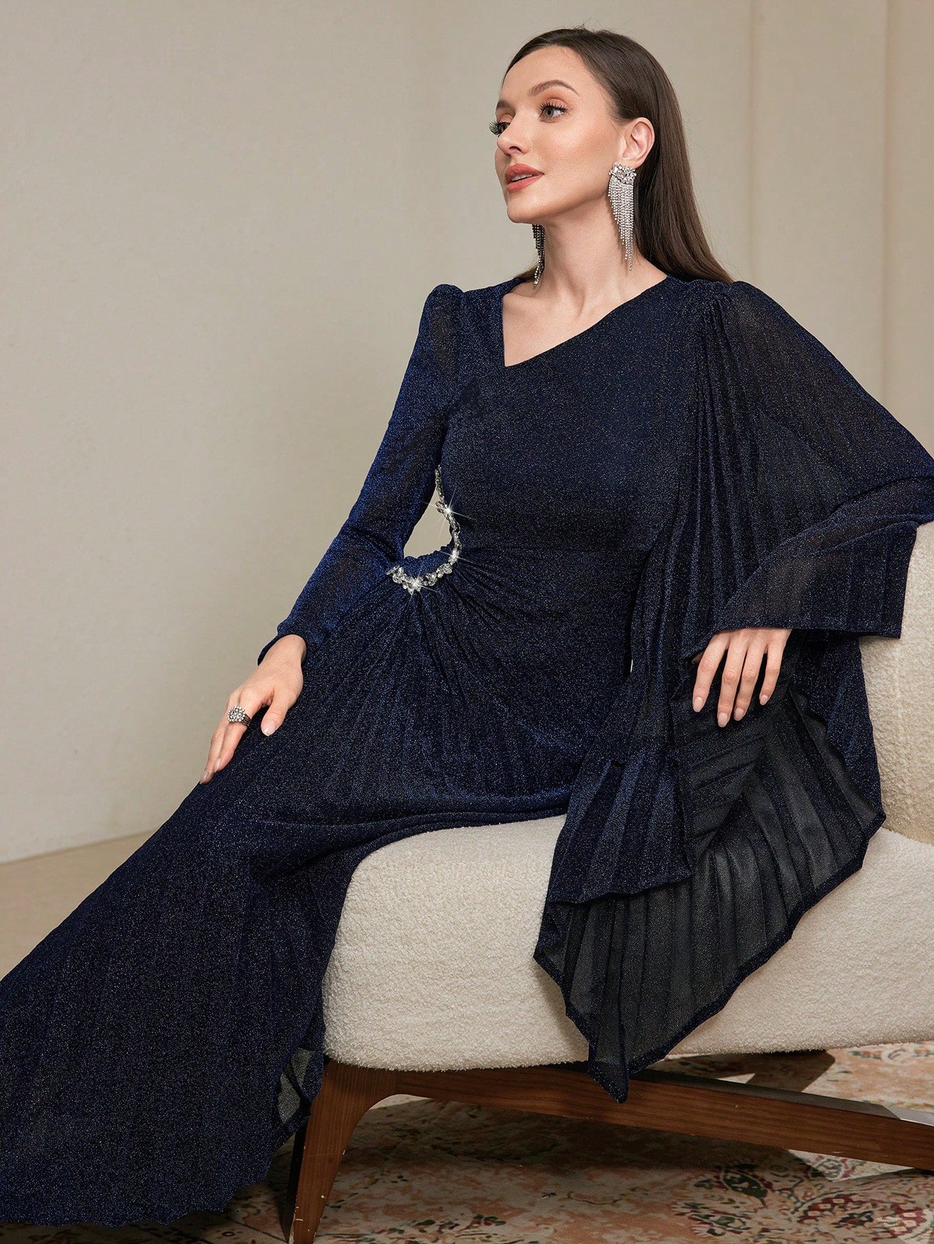 فستان سهرة طويل لامع من موديلين، قطعة واحدة، بياقة غير متماثلة وأكمام واسعة مكشكشة