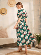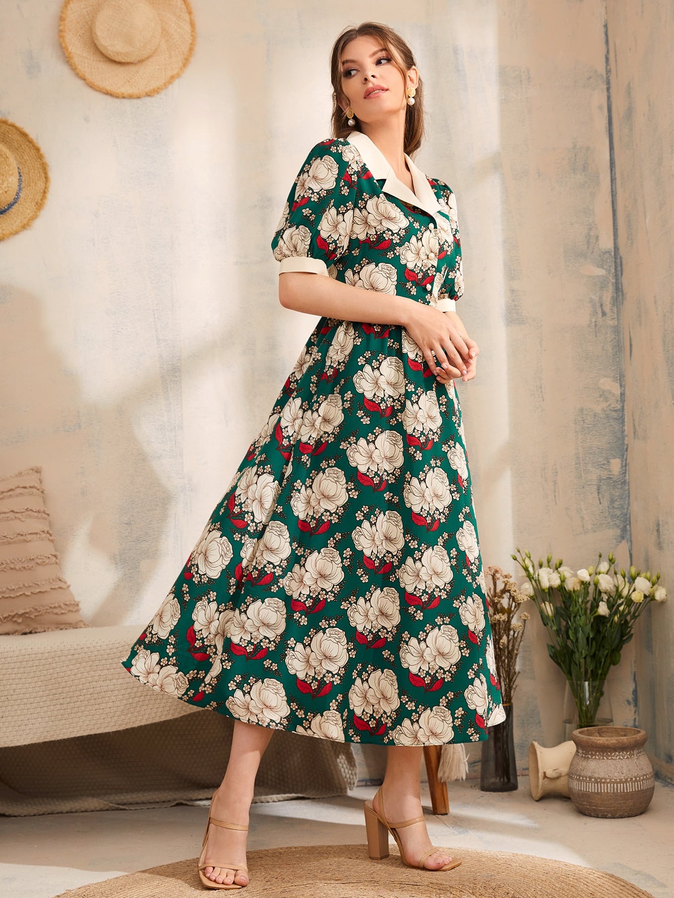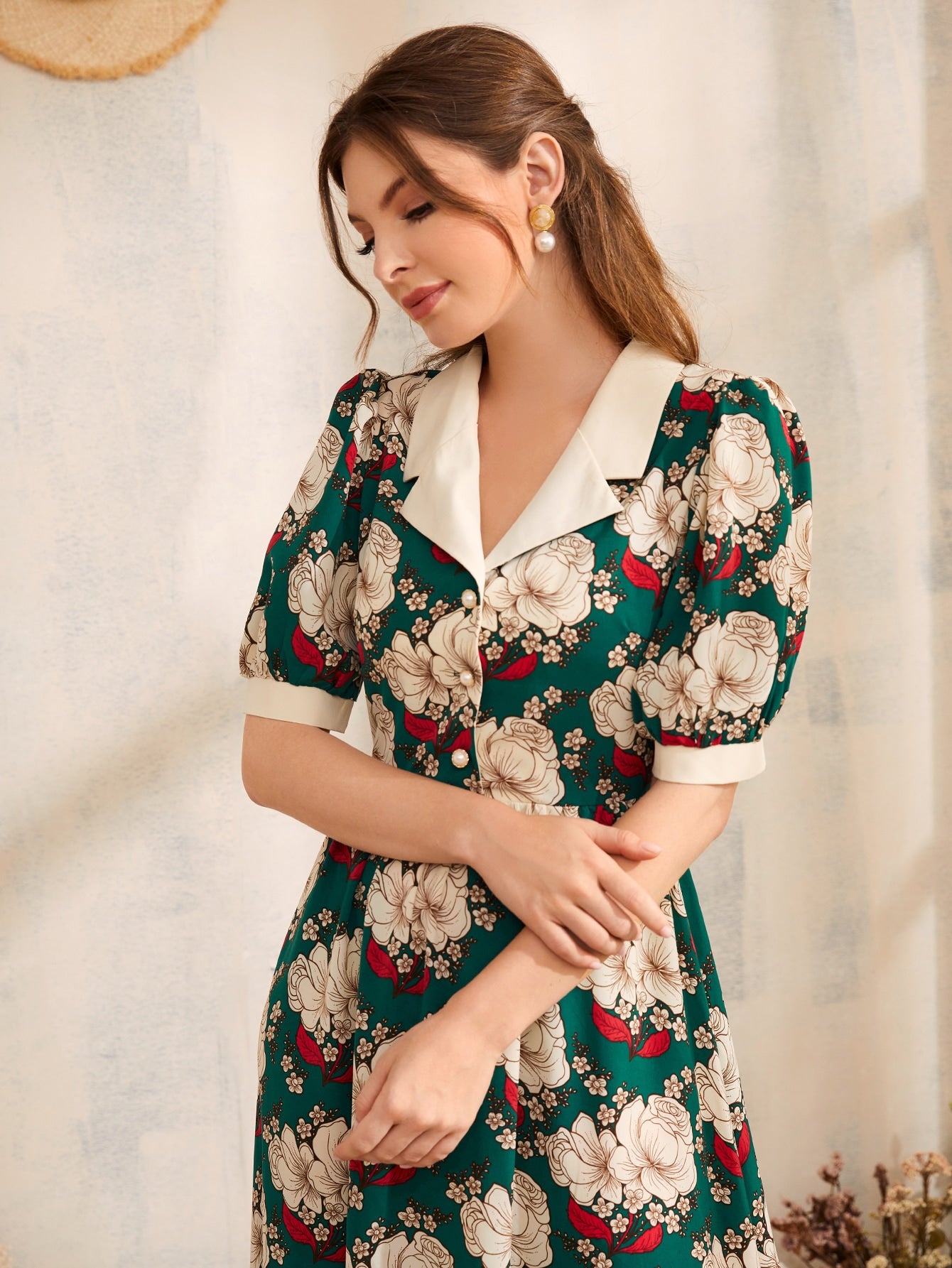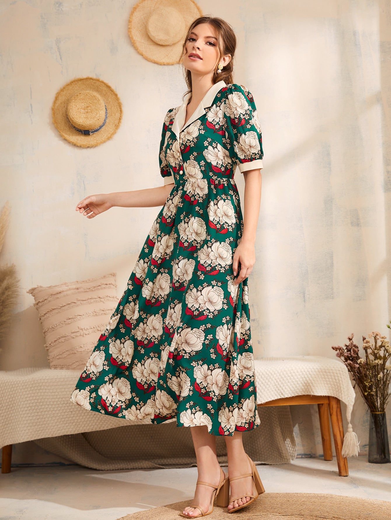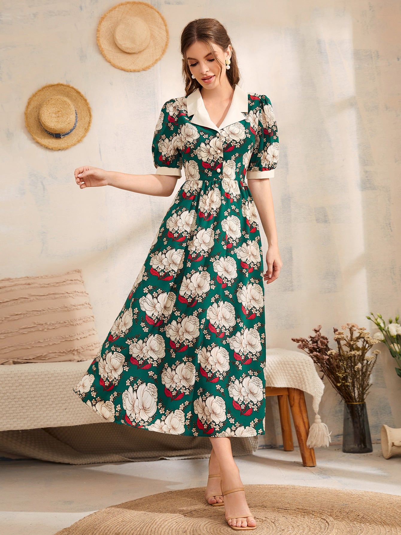 فستان موديلين بطبعة زهور، ياقة عريضة، أزرار أمامية، أكمام منفوخة