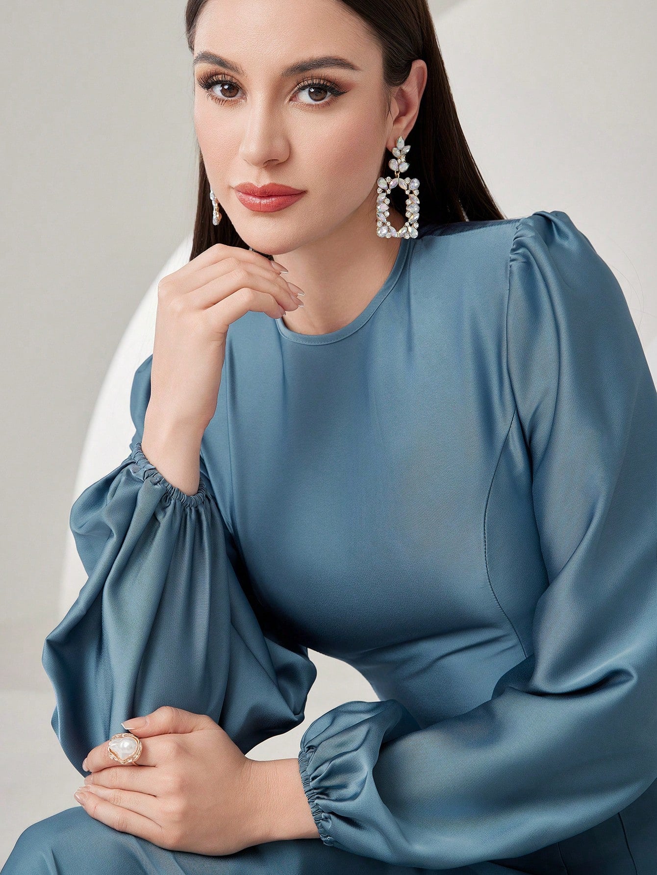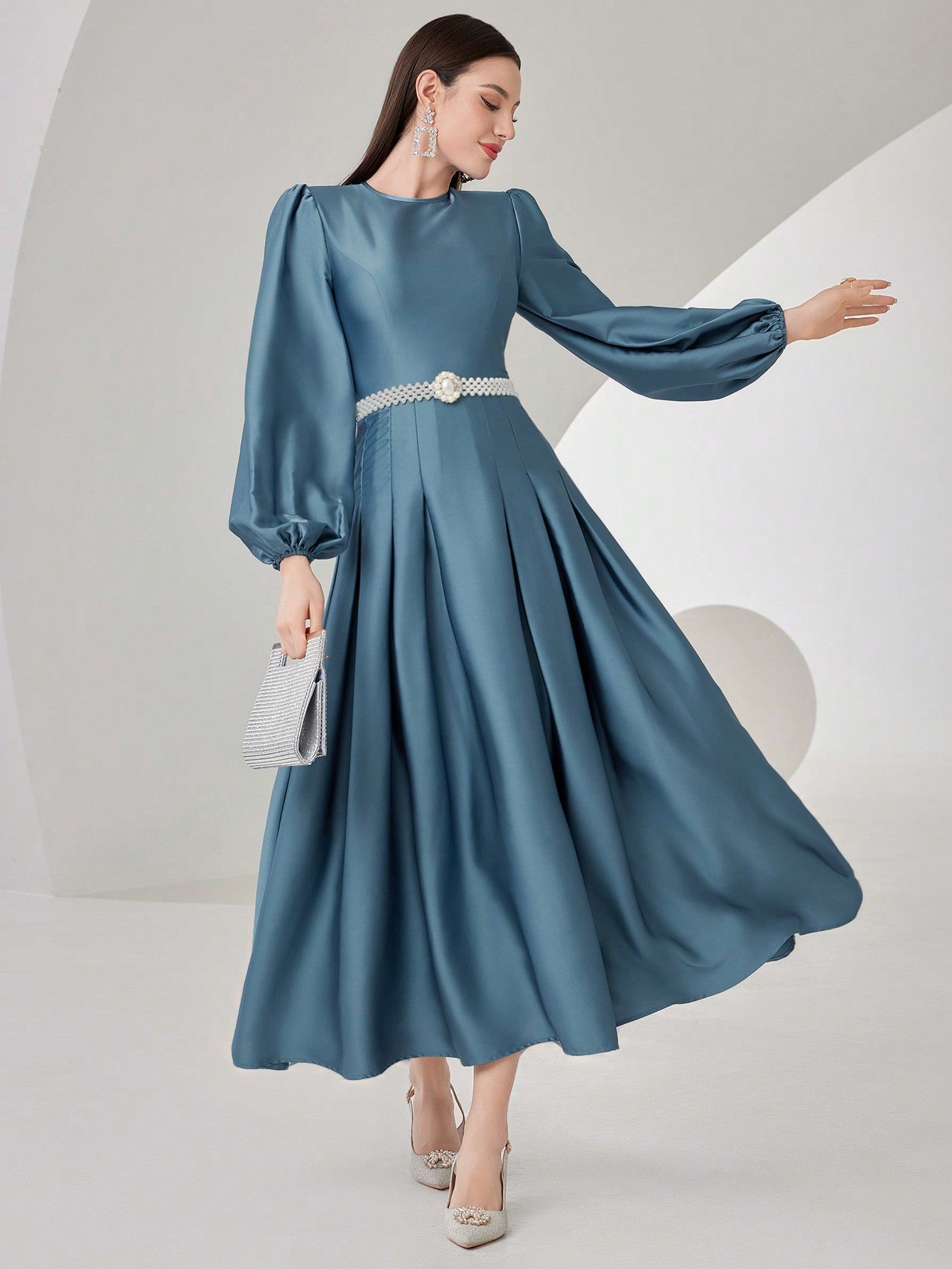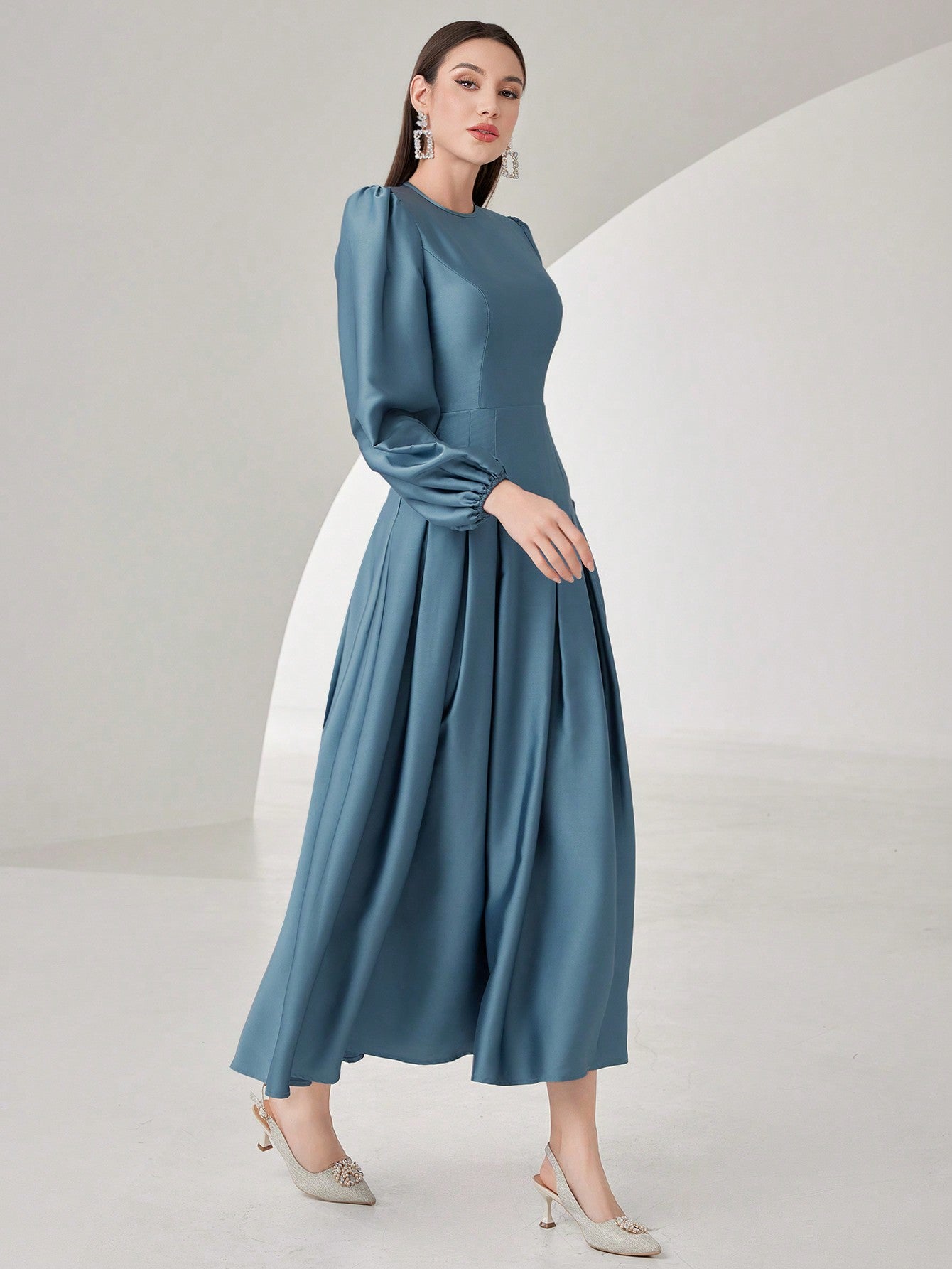 Modelyn Ladies' Solid Color Lantern Sleeve Pleated Dress Long Evening Dresses