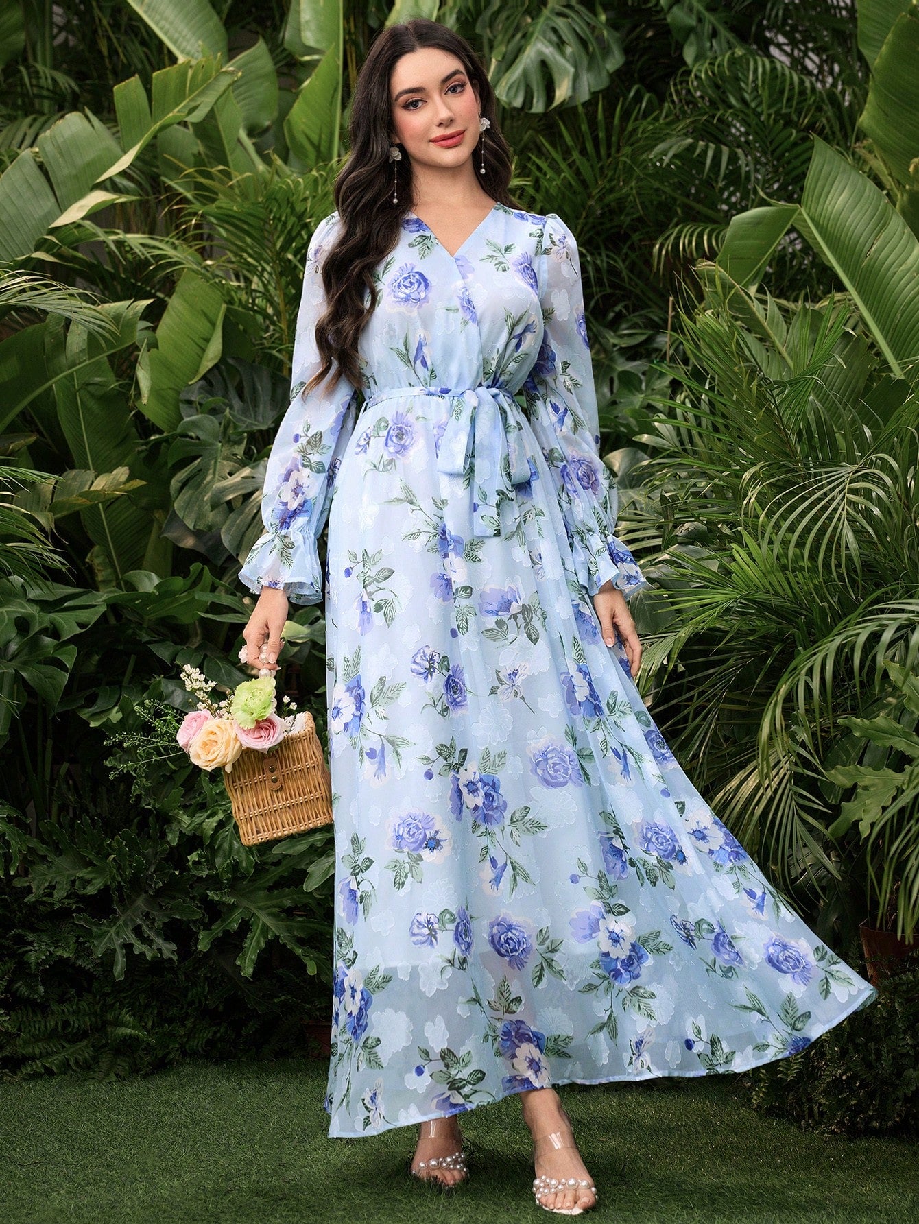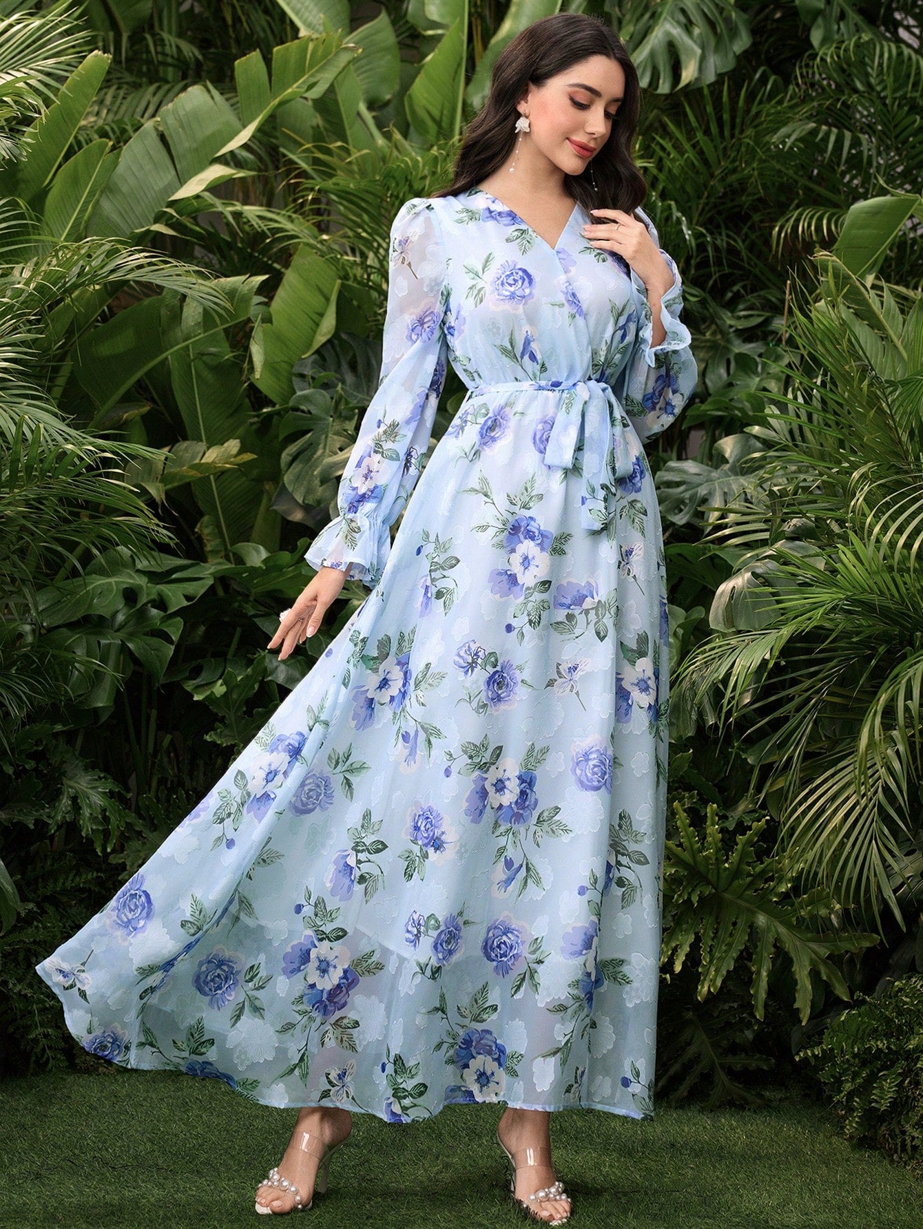 women Modelyn Laser Cut Pattern Crossed V-Neck Belted High Low Dress For Women