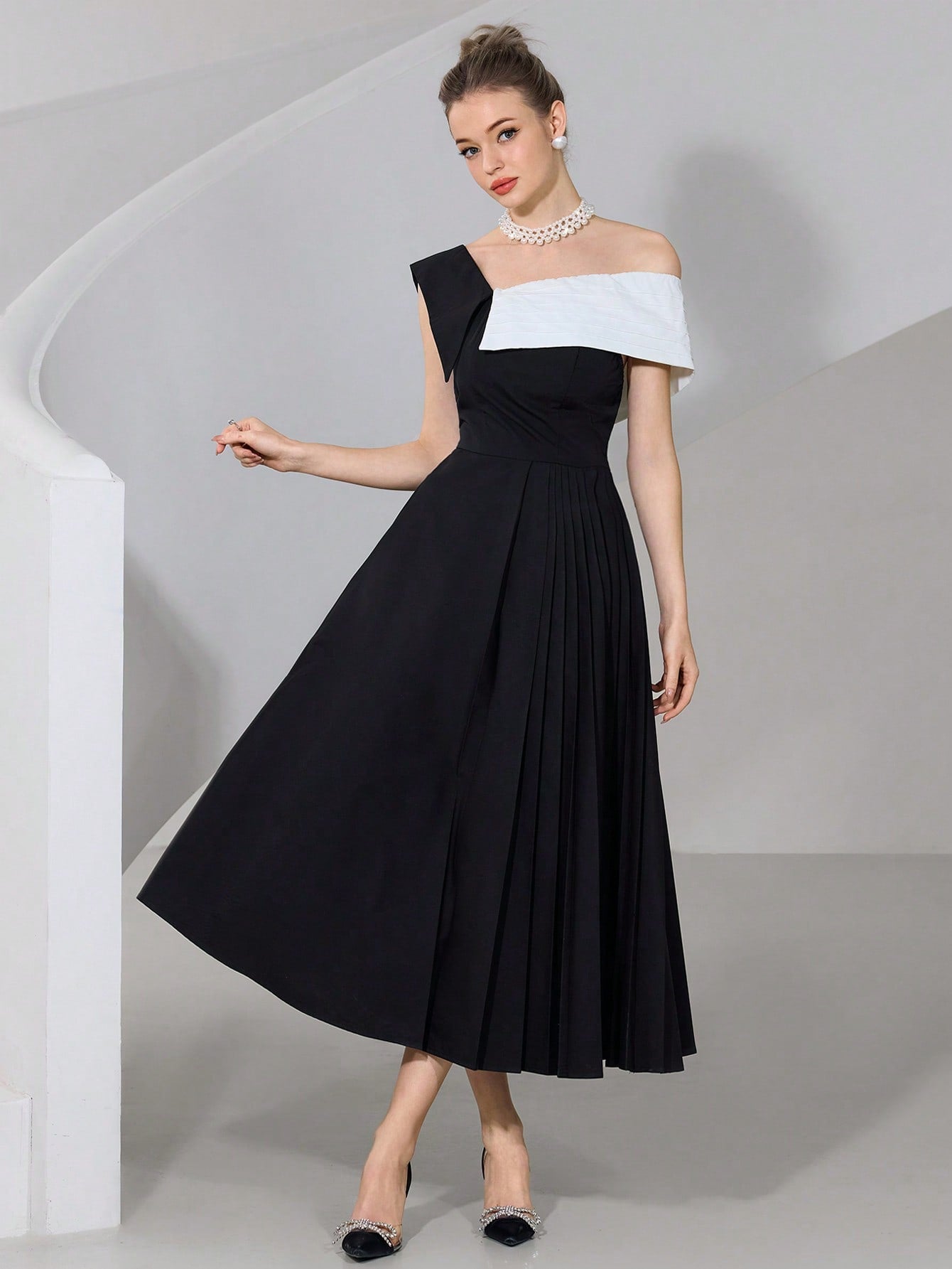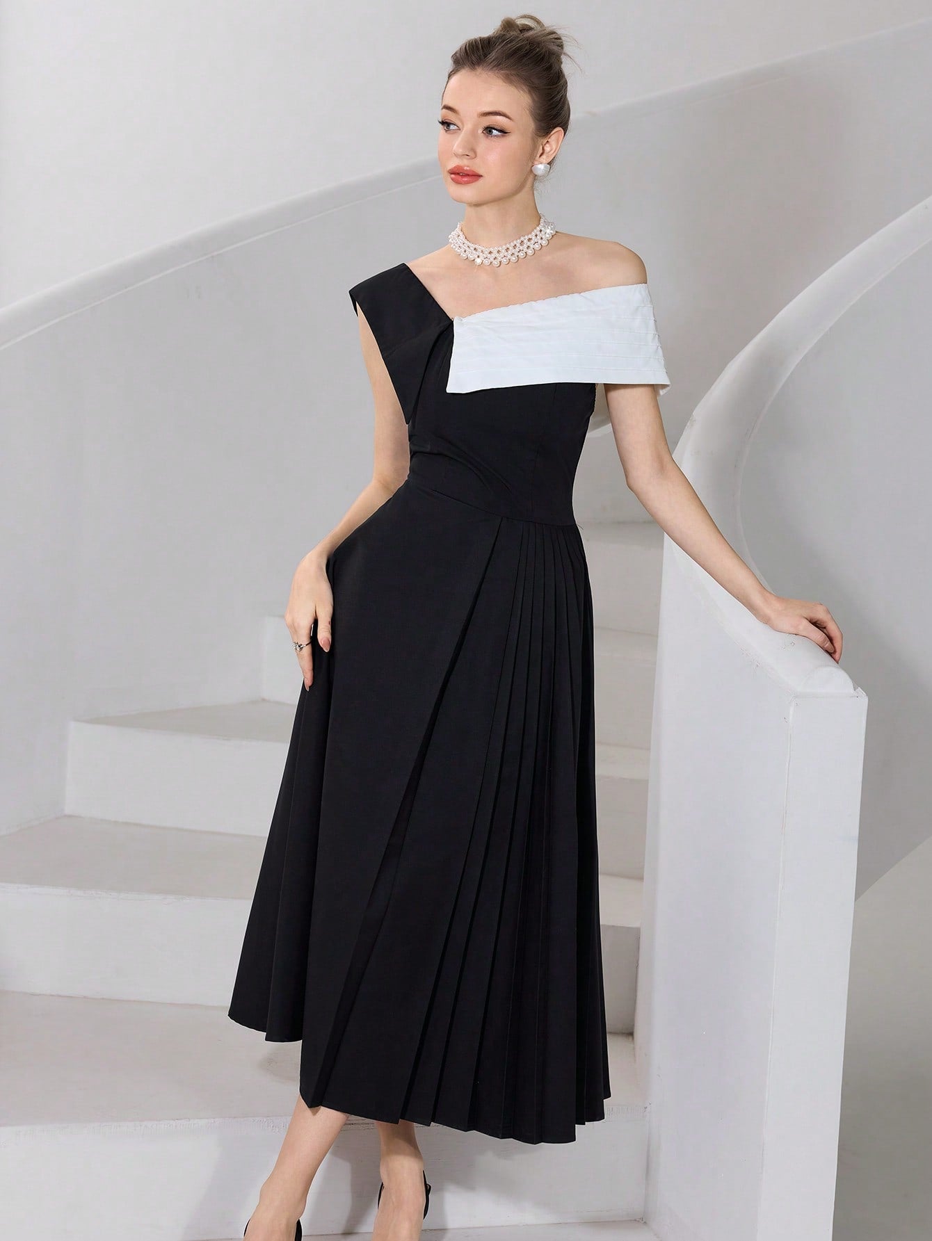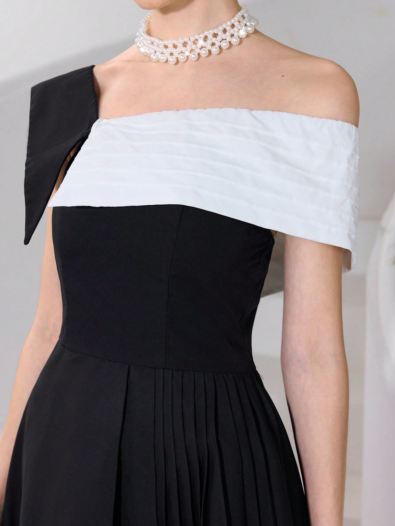 فستان موديلين النسائي الأنيق ذو الياقة غير المتماثلة والحافة المطوية
