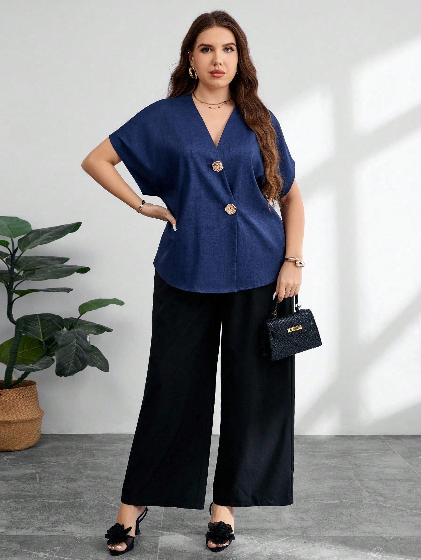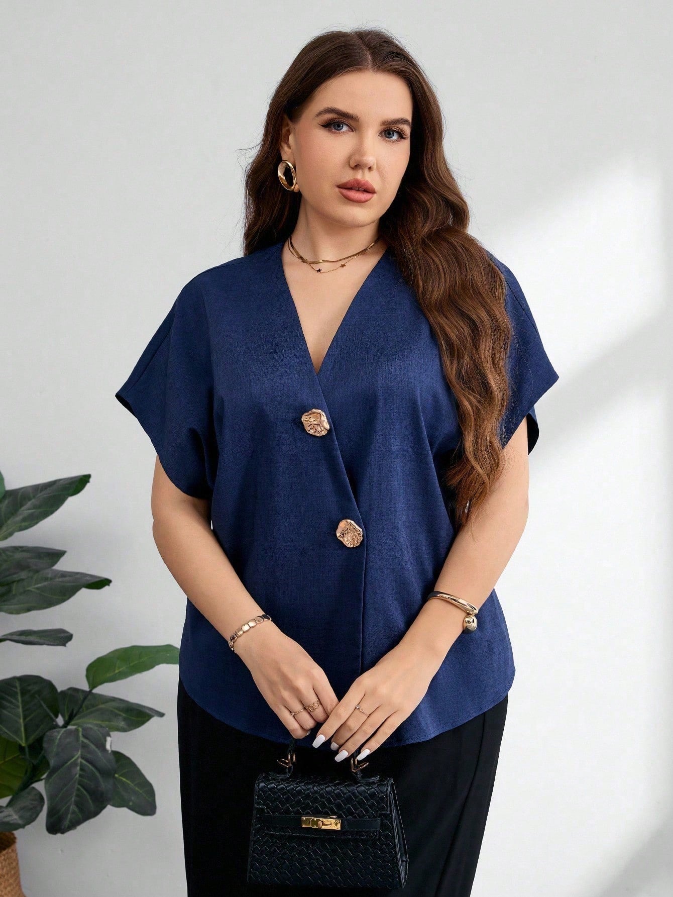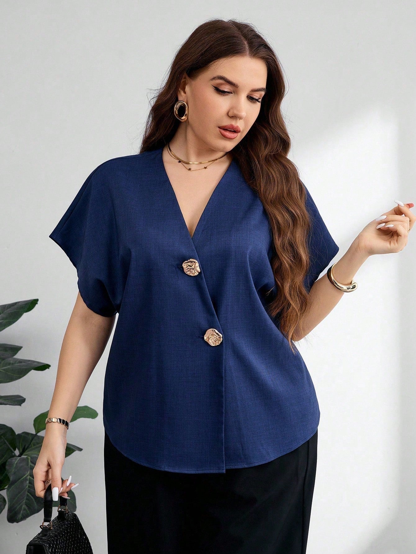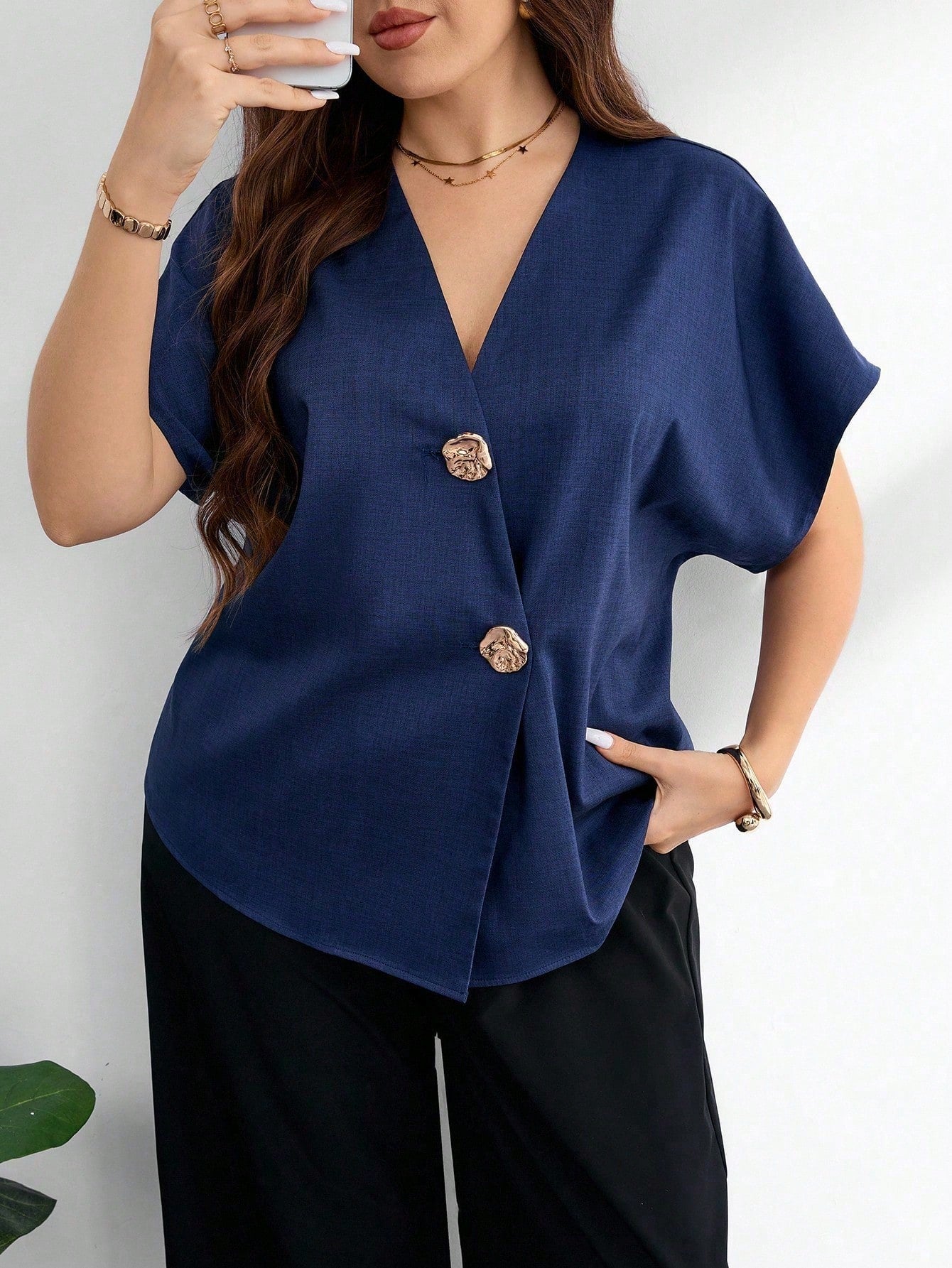 بلوزة موديلين النسائية ذات المقاسات الكبيرة، بياقة على شكل حرف V وأكمام راجلان وأزرار معدنية، مناسبة للارتداء اليومي الأنيق باللون الأزرق