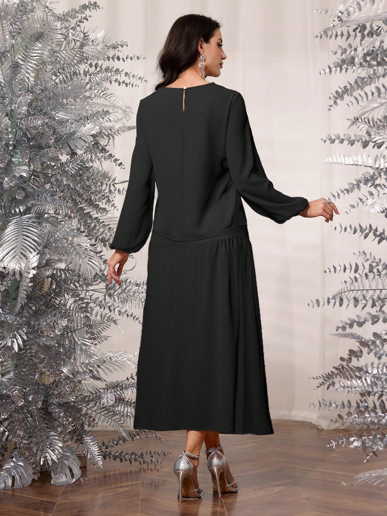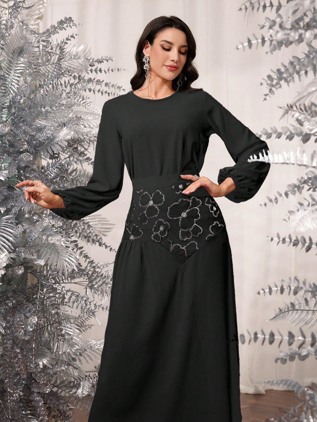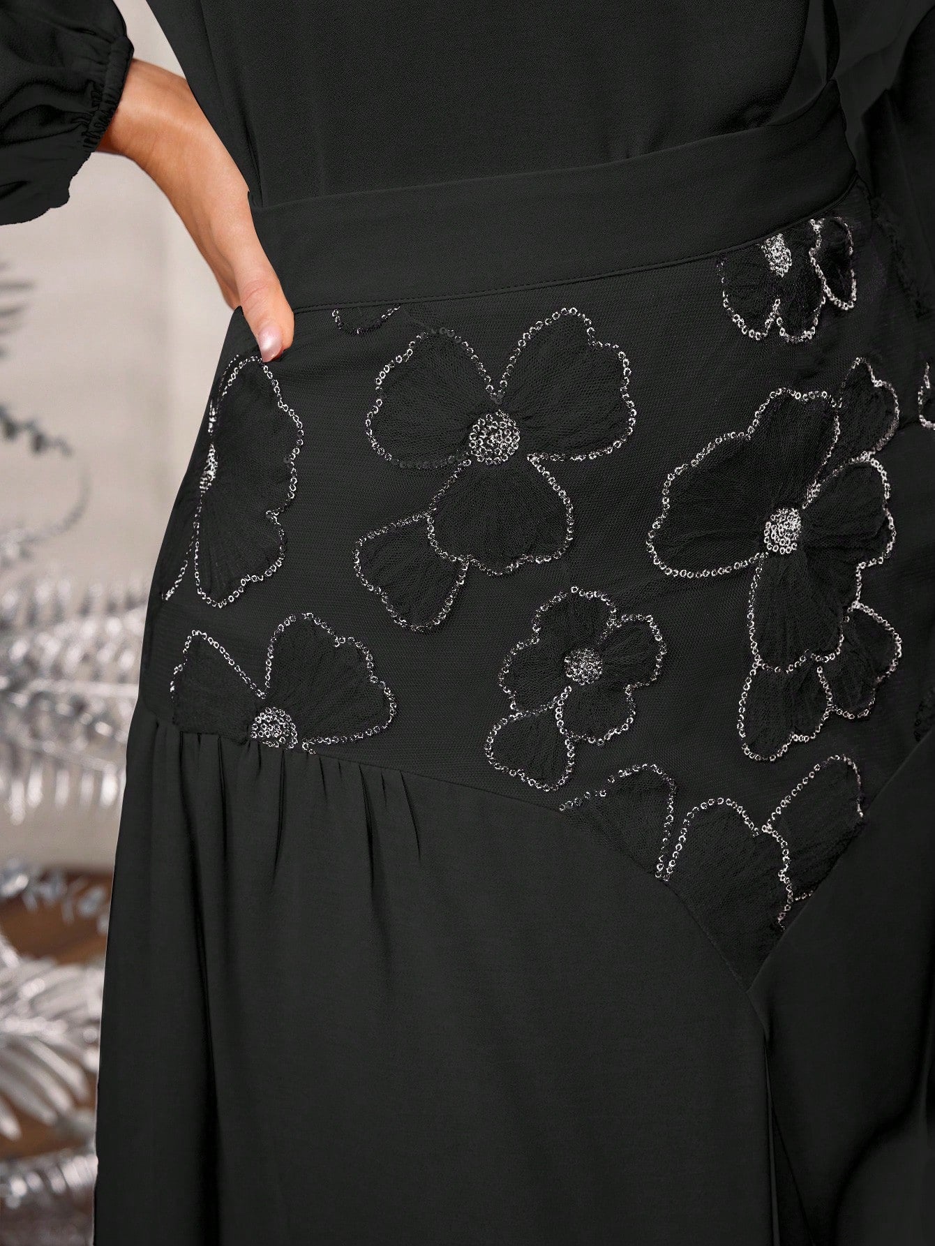 طقم من قطعتين من قميص موديلين النسائي بأكمام فانوس بلون واحد وتنورة قصيرة من الجاكار بنقشة زهور