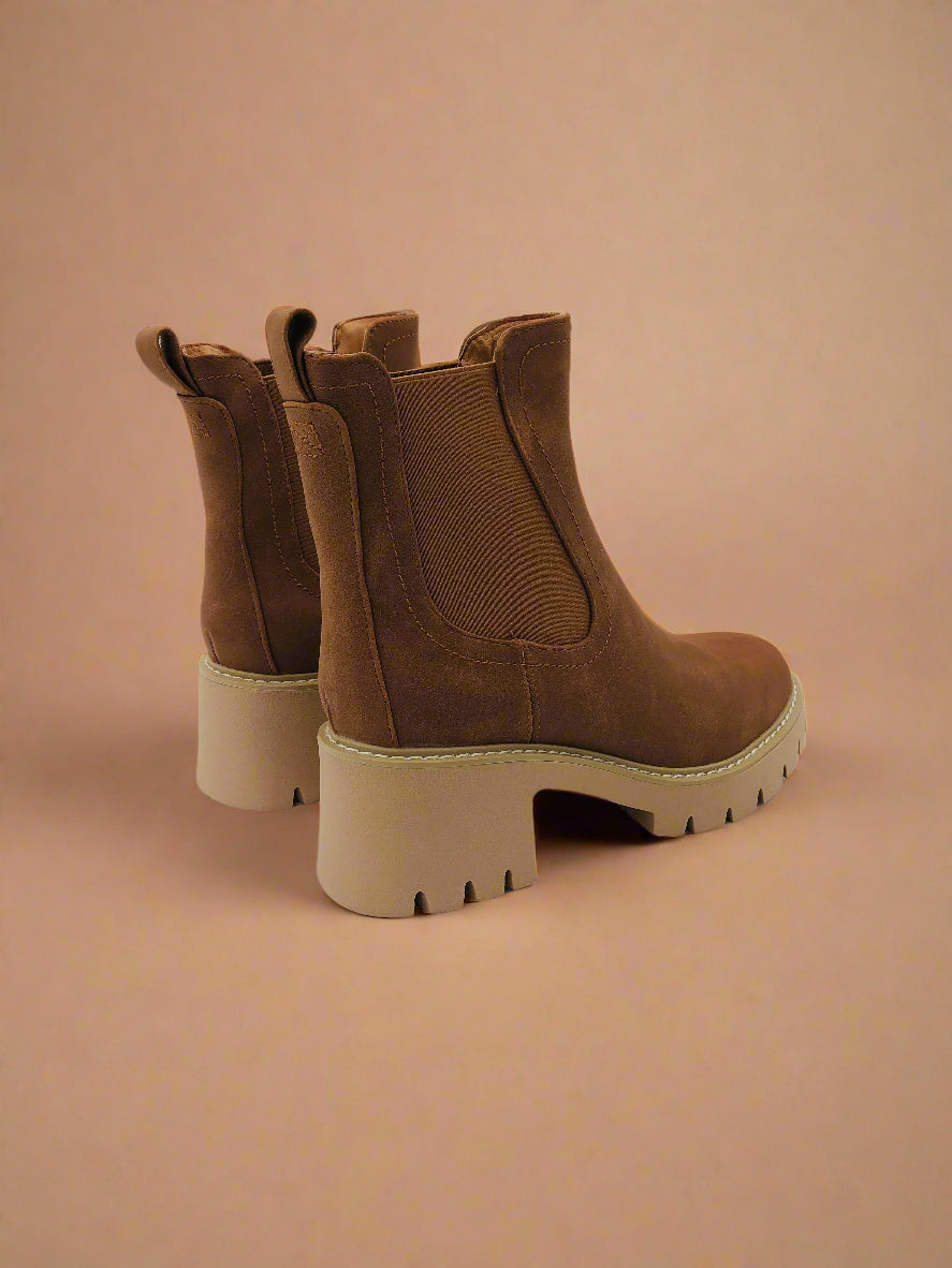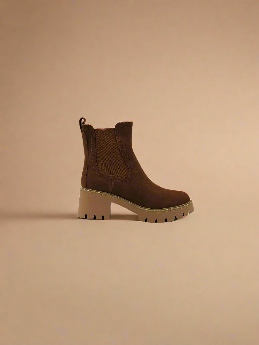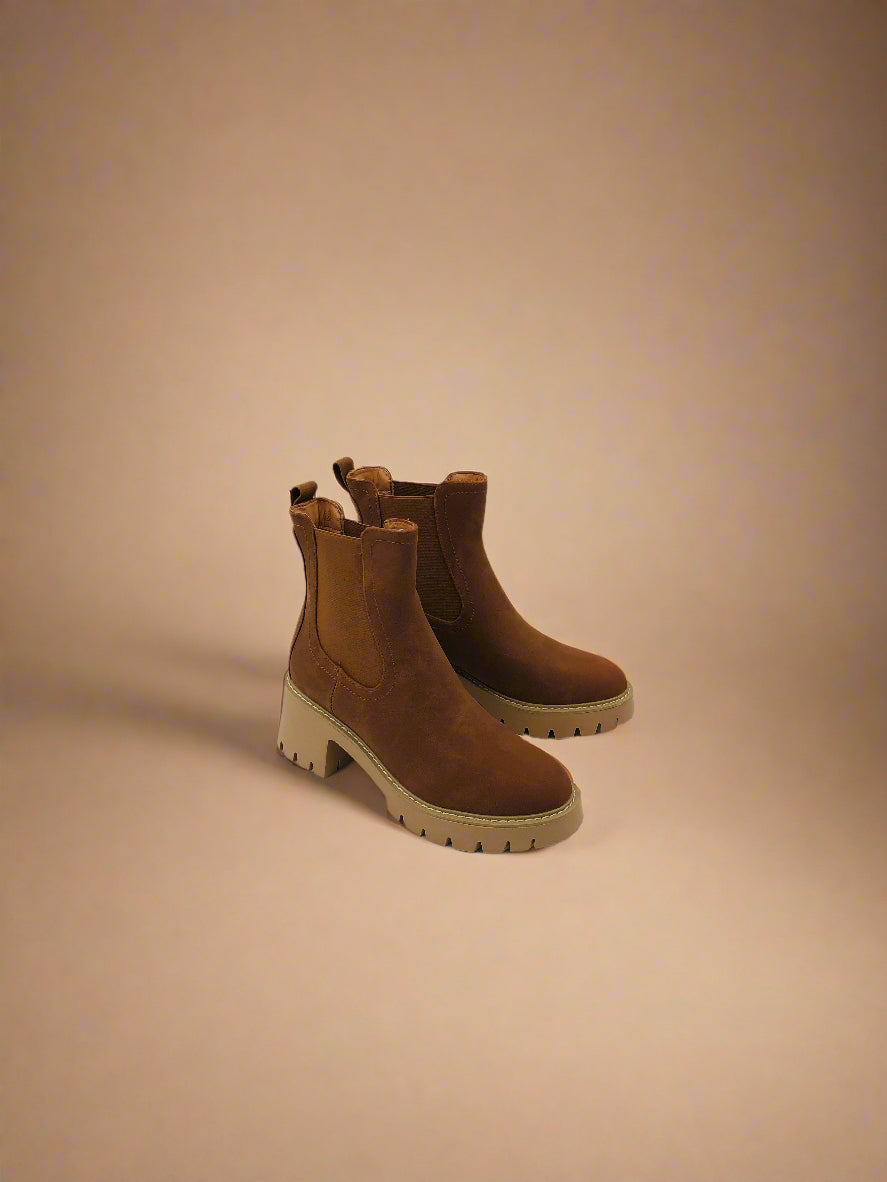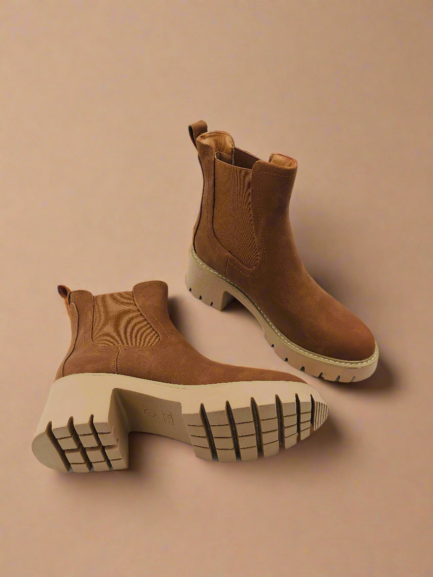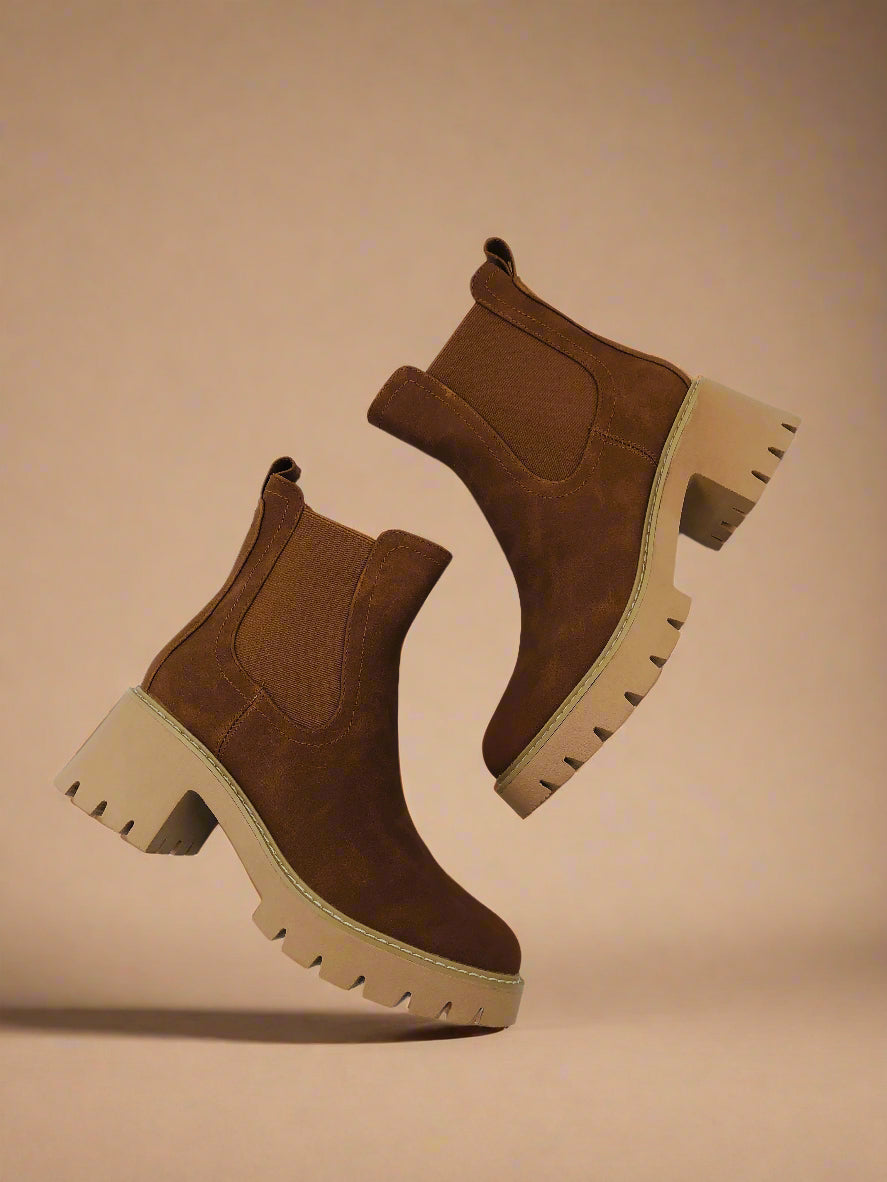 تجمع هذه الجزمة النسائية ذات الكاحل بين التصميم البني الأنيق ونعل سميك عريض، مثالية لإطلالة شتوية عصرية بينما توفر قاعدة ثابتة ومريحة لقدميك.