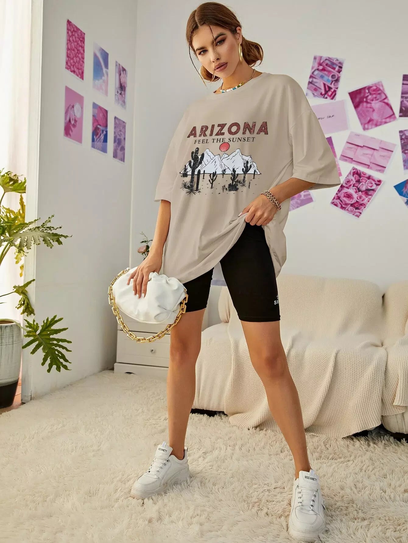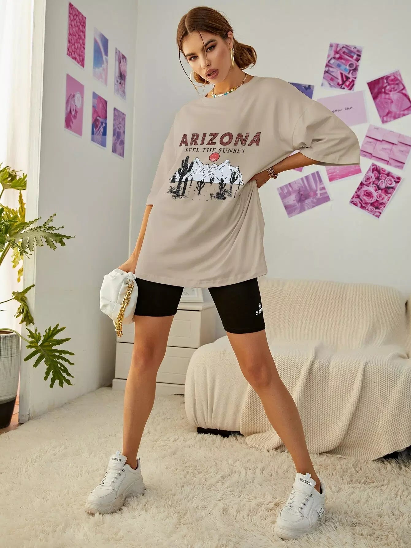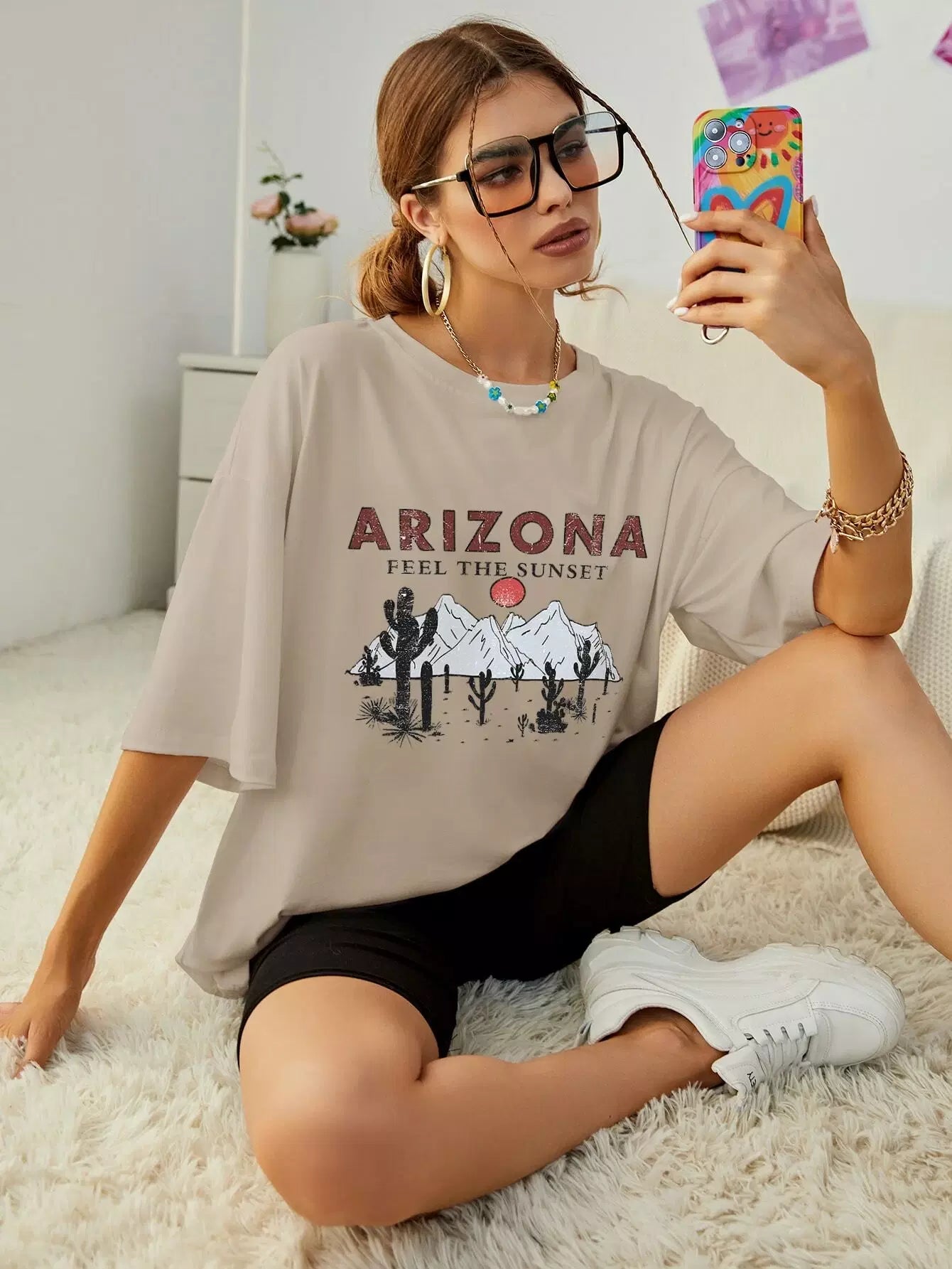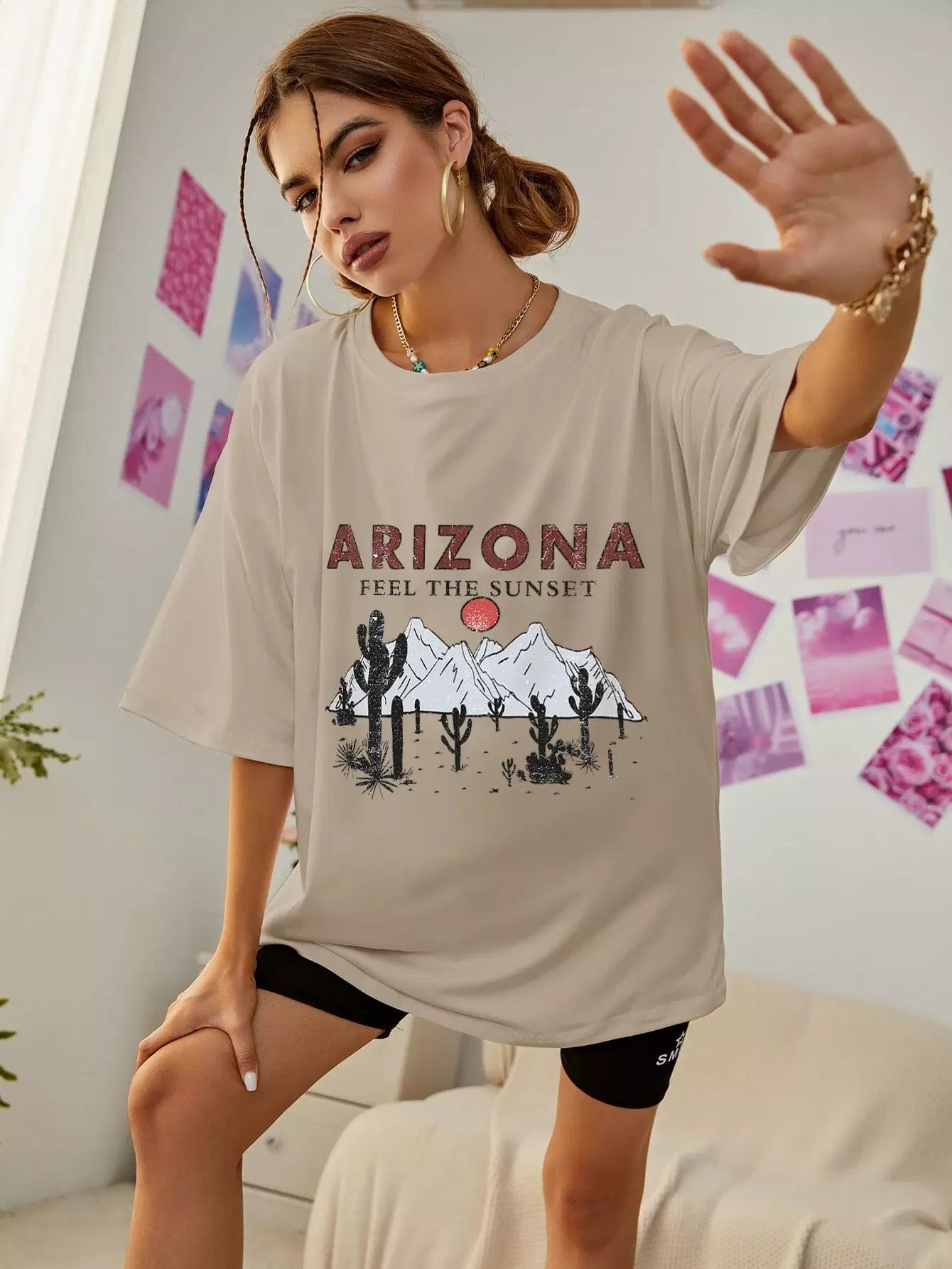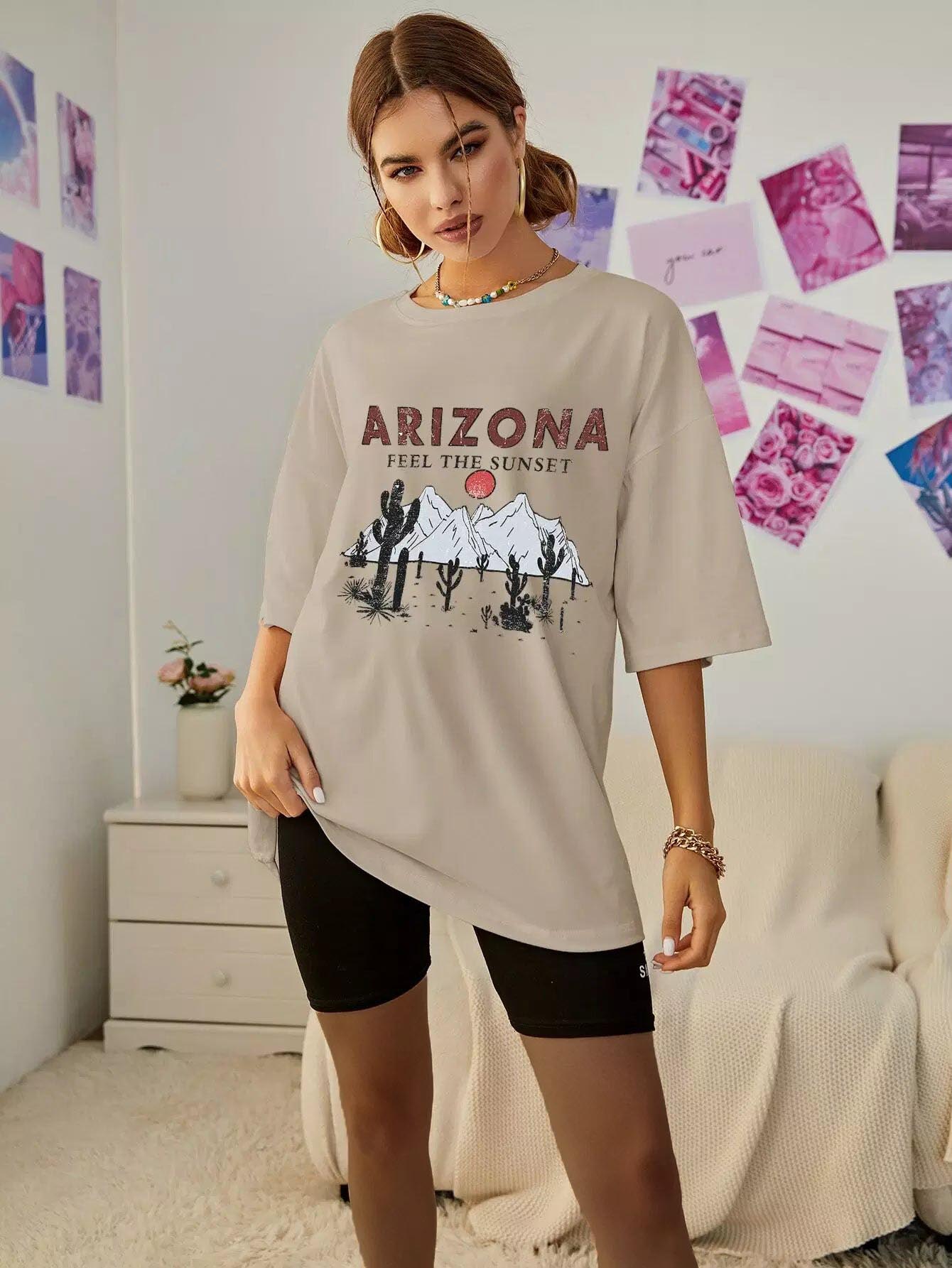 تي شيرت ذو أكتاف منسدلة برسومات جبلية ورسومات حروف كبيرة الحجم