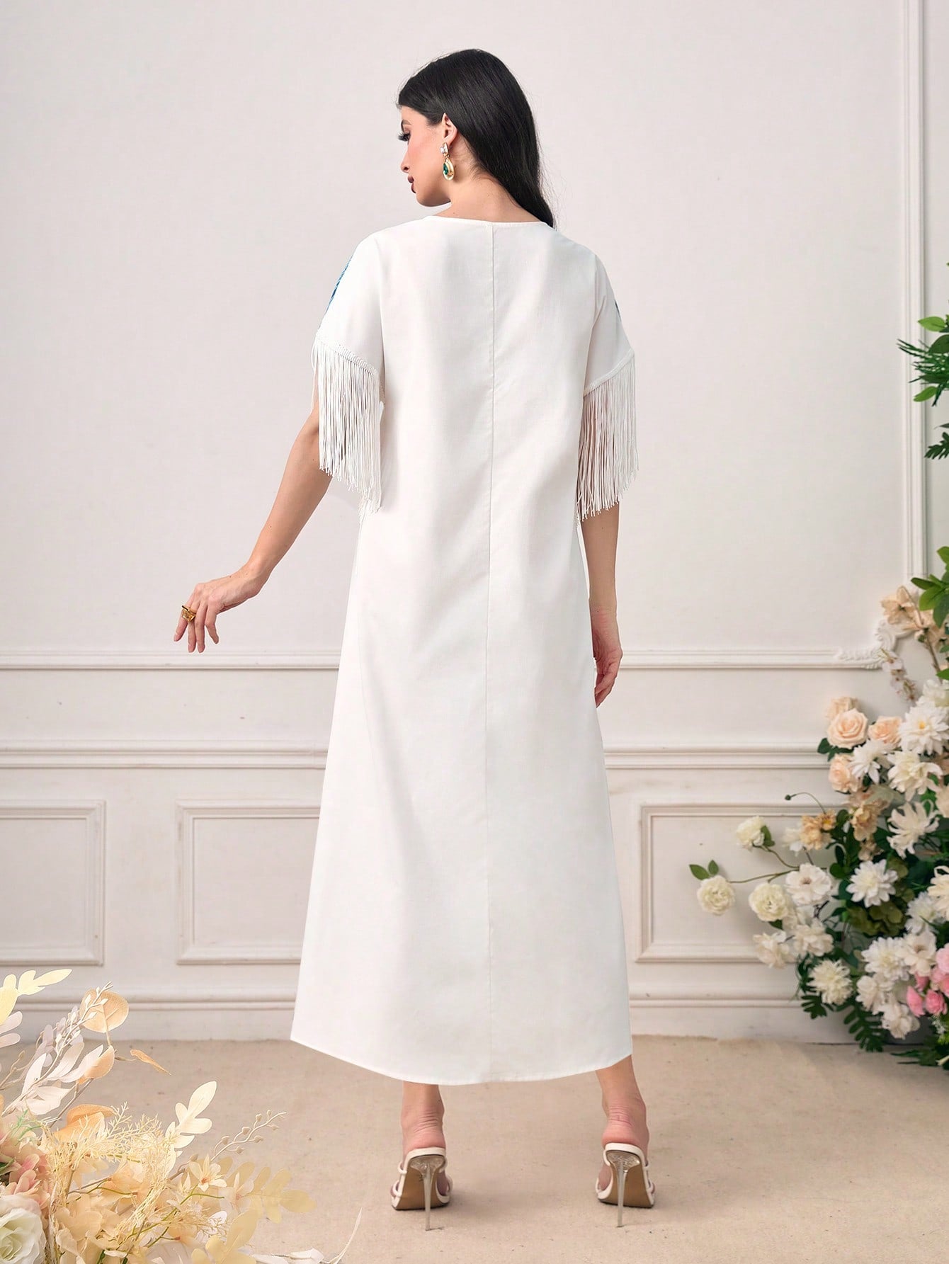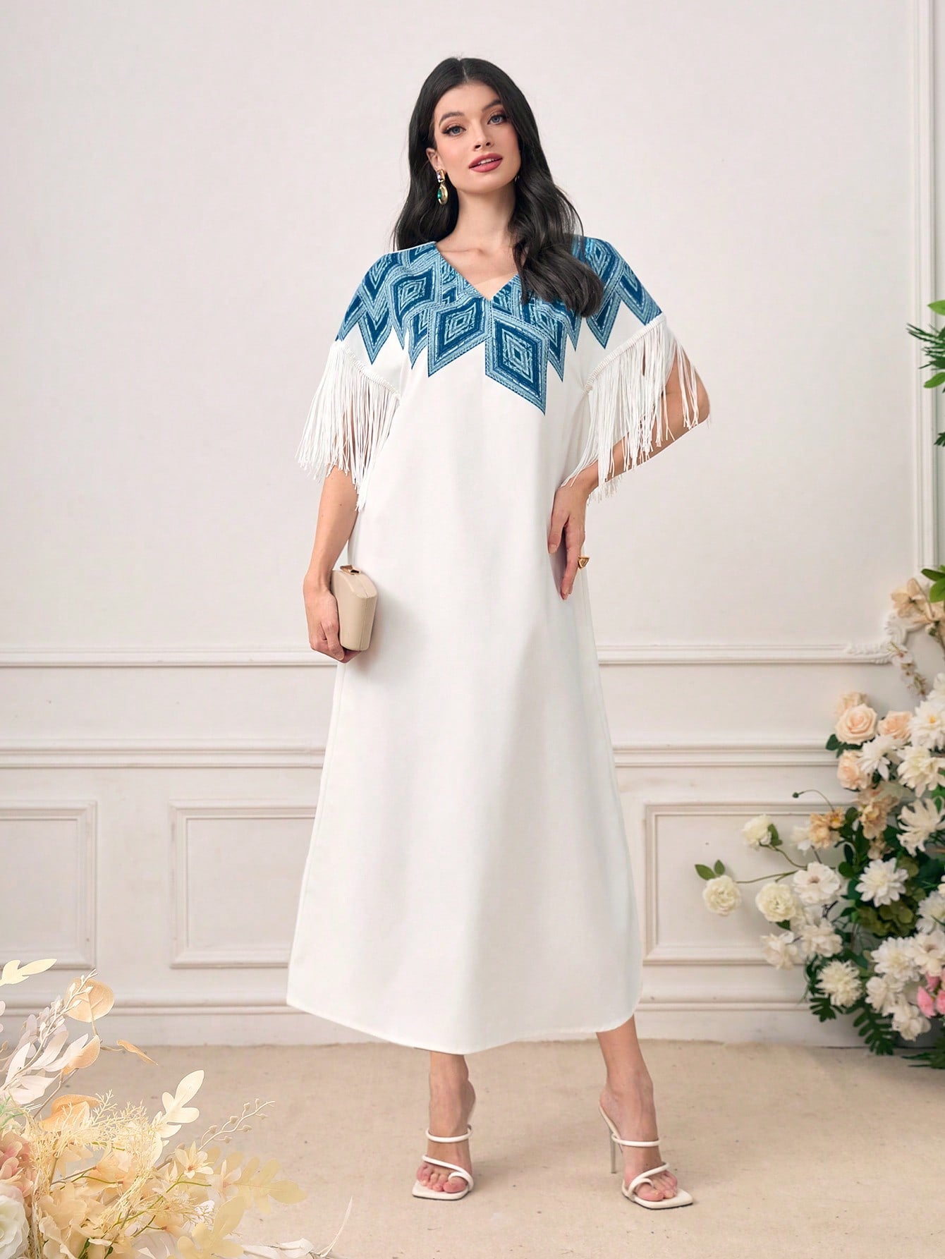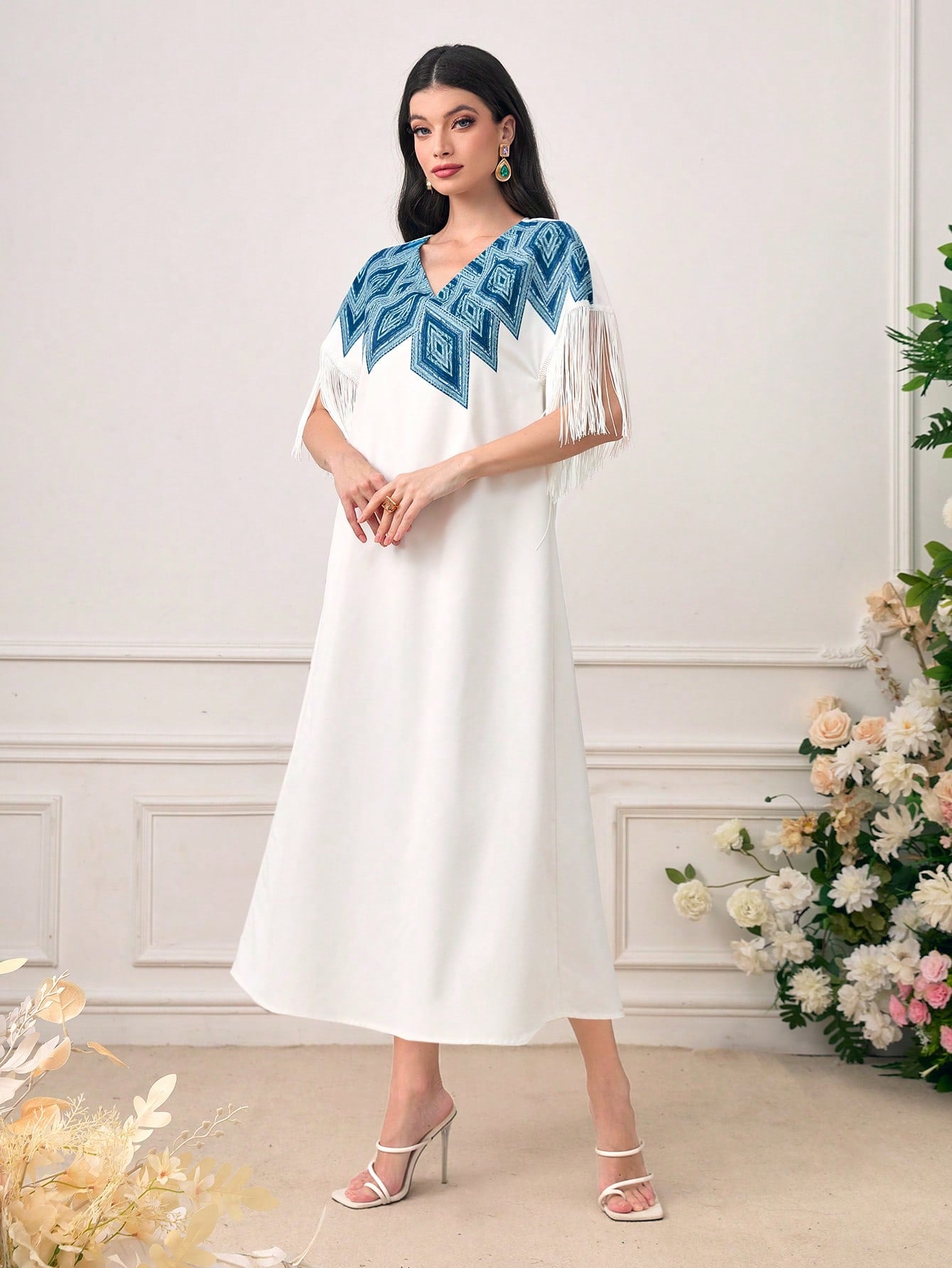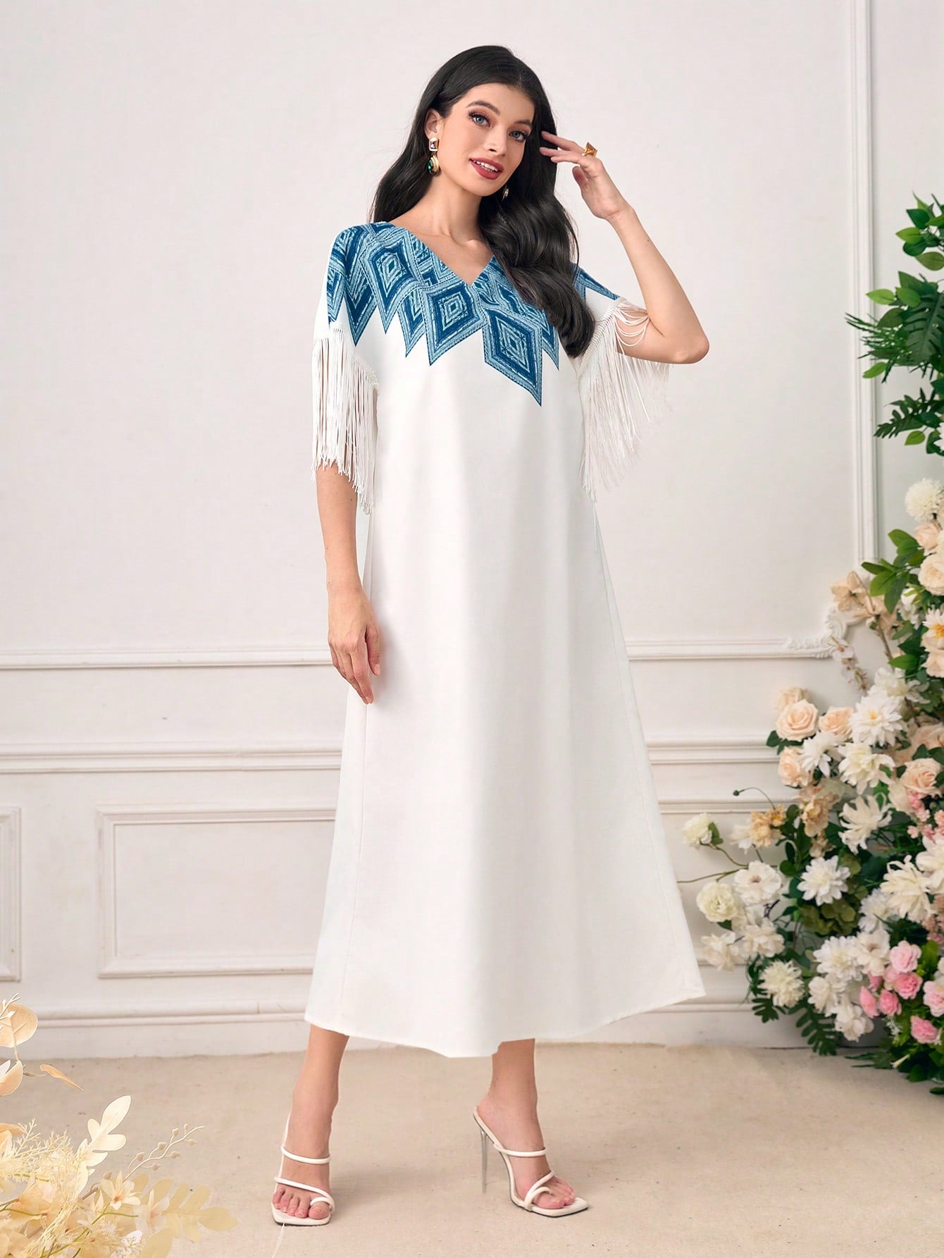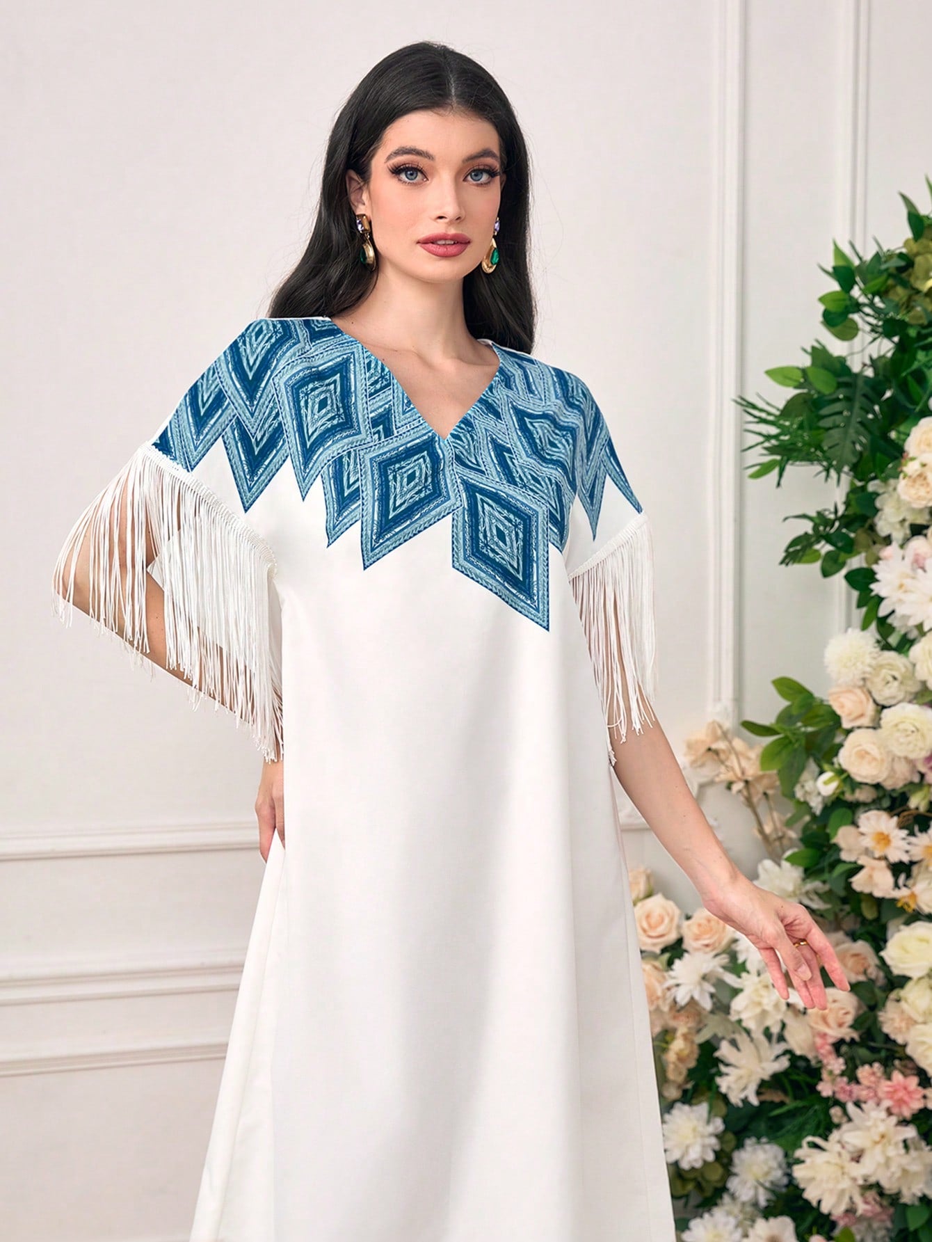 women Mulvari Geo Print Fringe Trim Batwing Sleeve Dress