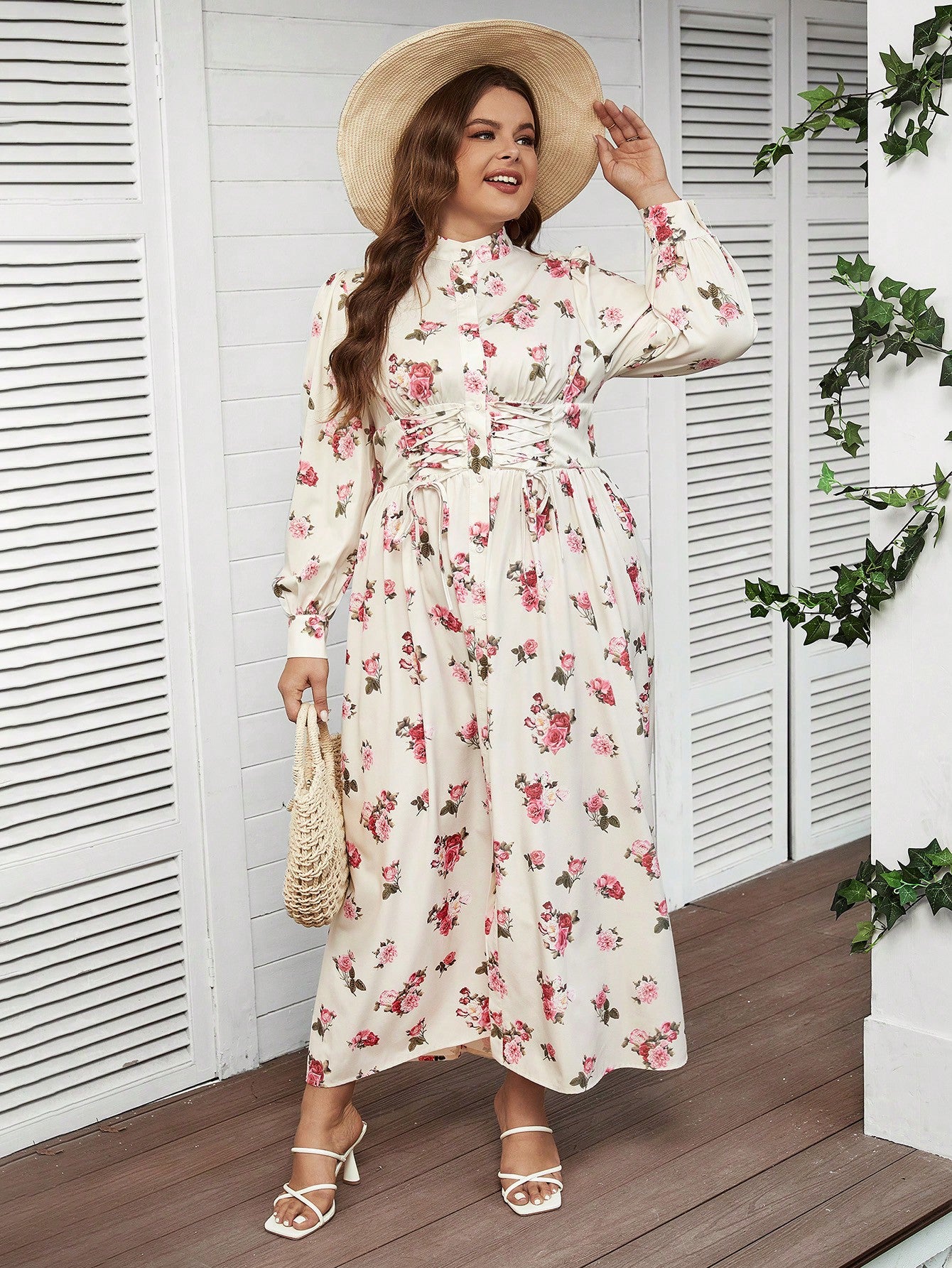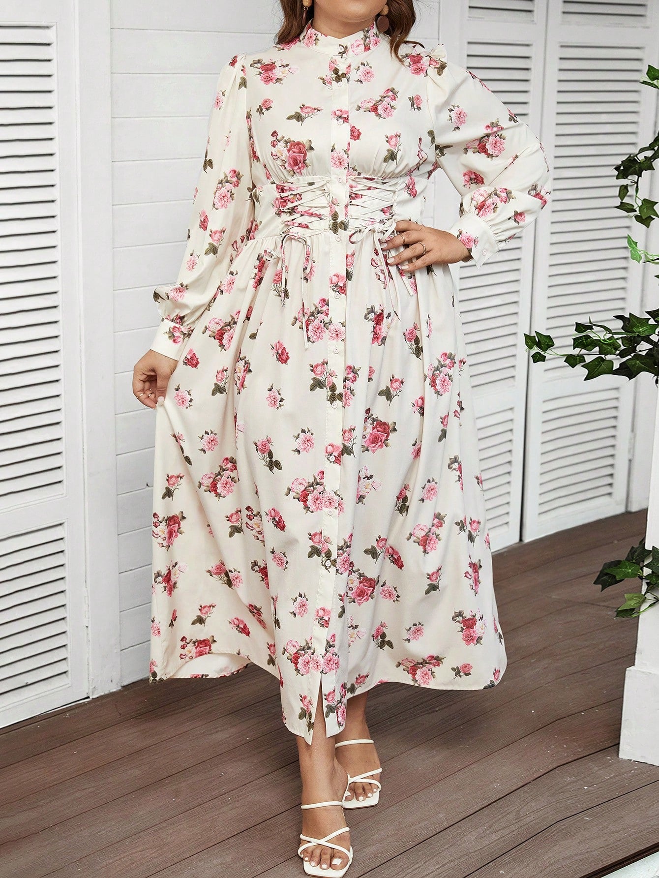 Mulvari Plus Size Women's Floral Print Stand Collar Lantern Sleeve Dress