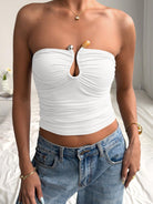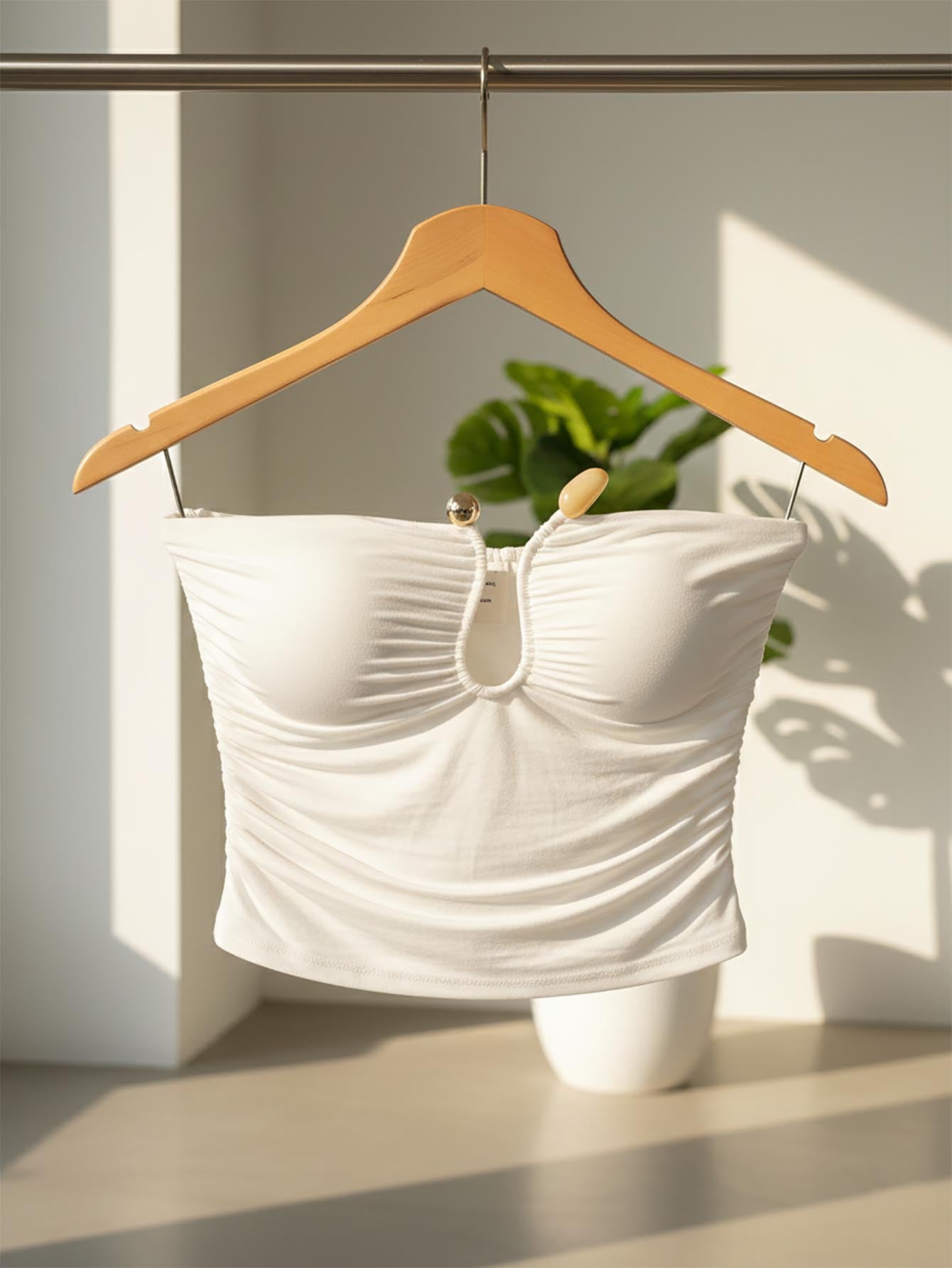 فستان صيفي من ميسترا بلون موحد، بتصميم مفتوح من الخلف، مزين بتفاصيل على شكل حرف U، وإبزيم على شكل قطرة ماء، بتصميم أنيق وجذاب.